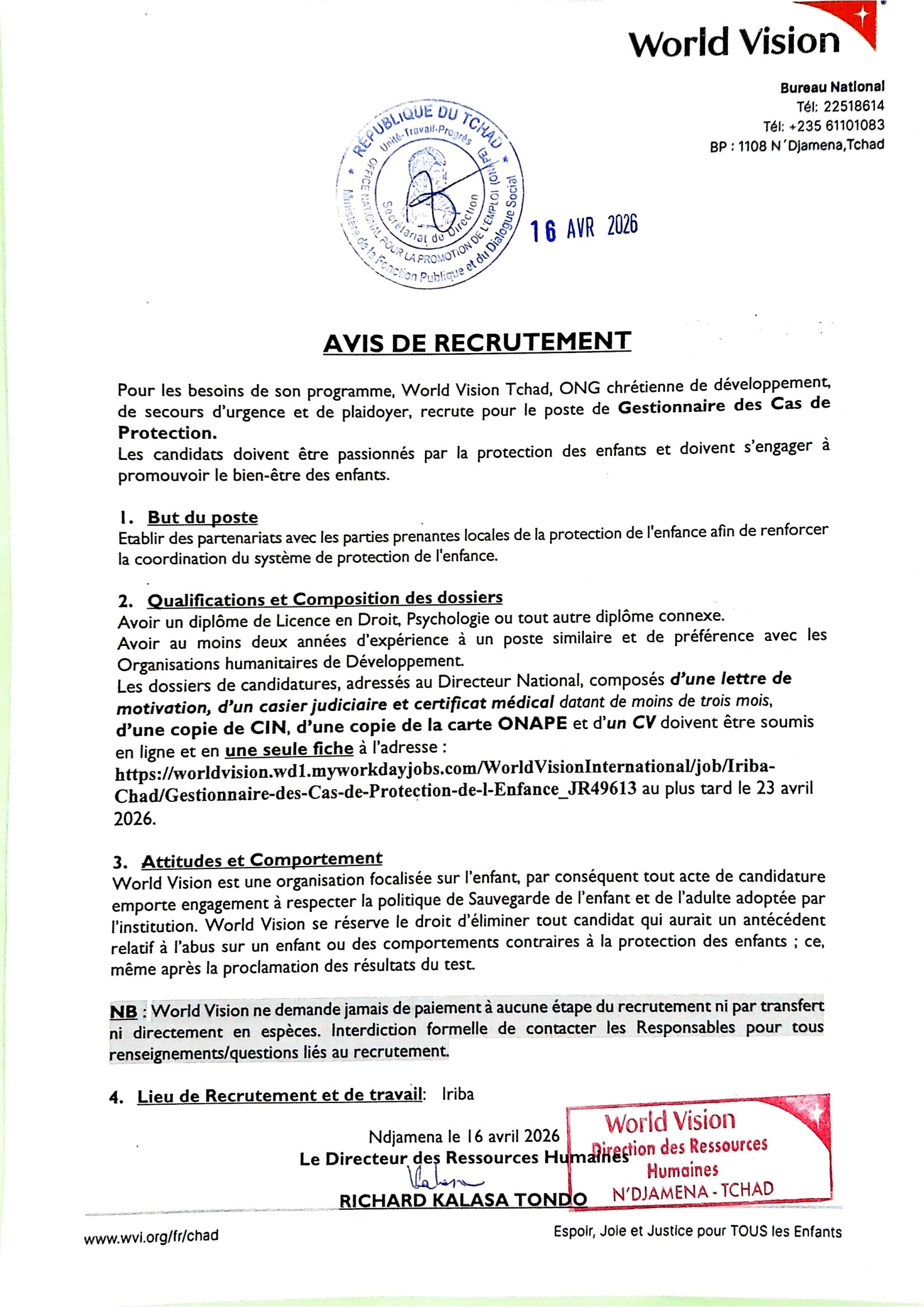 Accueil » Opportunités » Afrique » Tchad » World Vision recrute un(e) Gestionnaire des Cas de Protection basé(e) à Iriba, Tchad