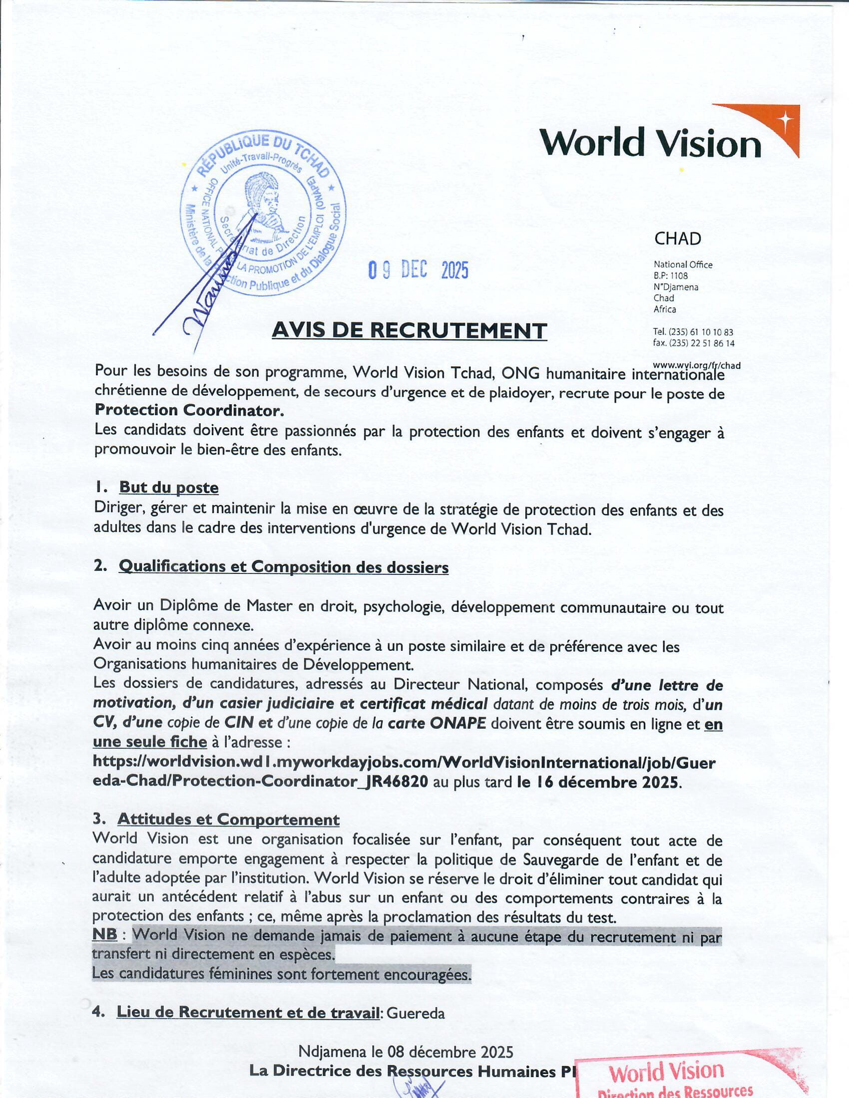 Accueil » Opportunités » Afrique » Tchad » World Vision recrute un(e) Protection Coordinator basé(e) à Guereda, Tchad