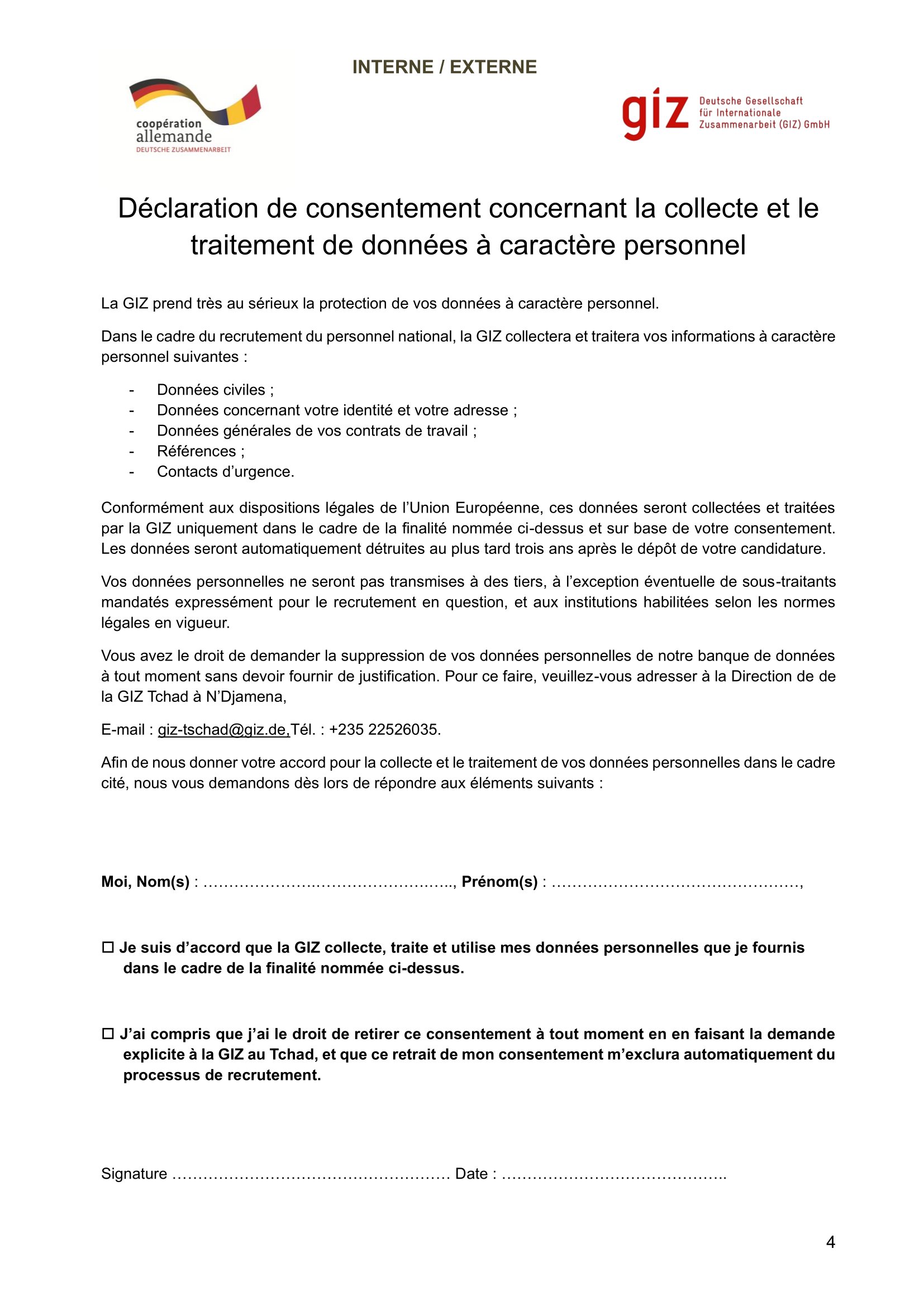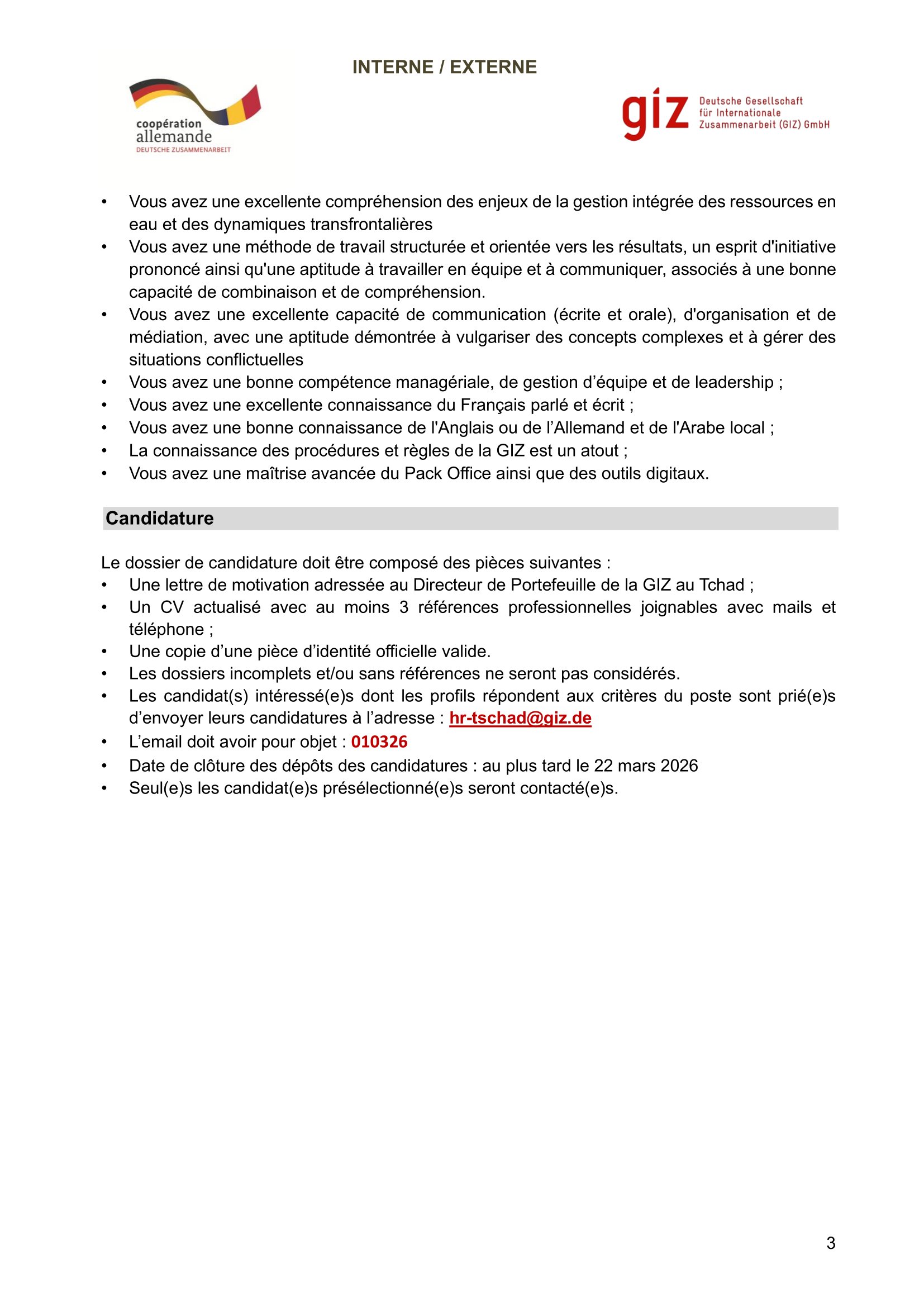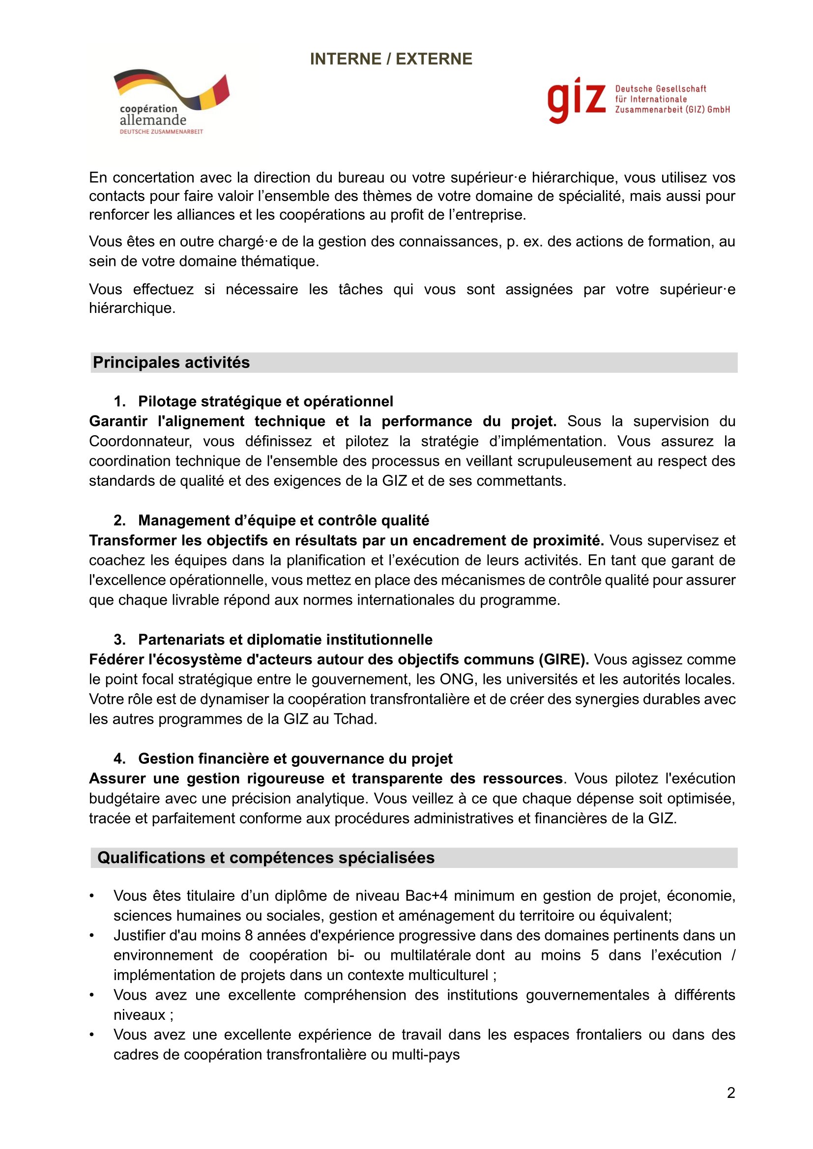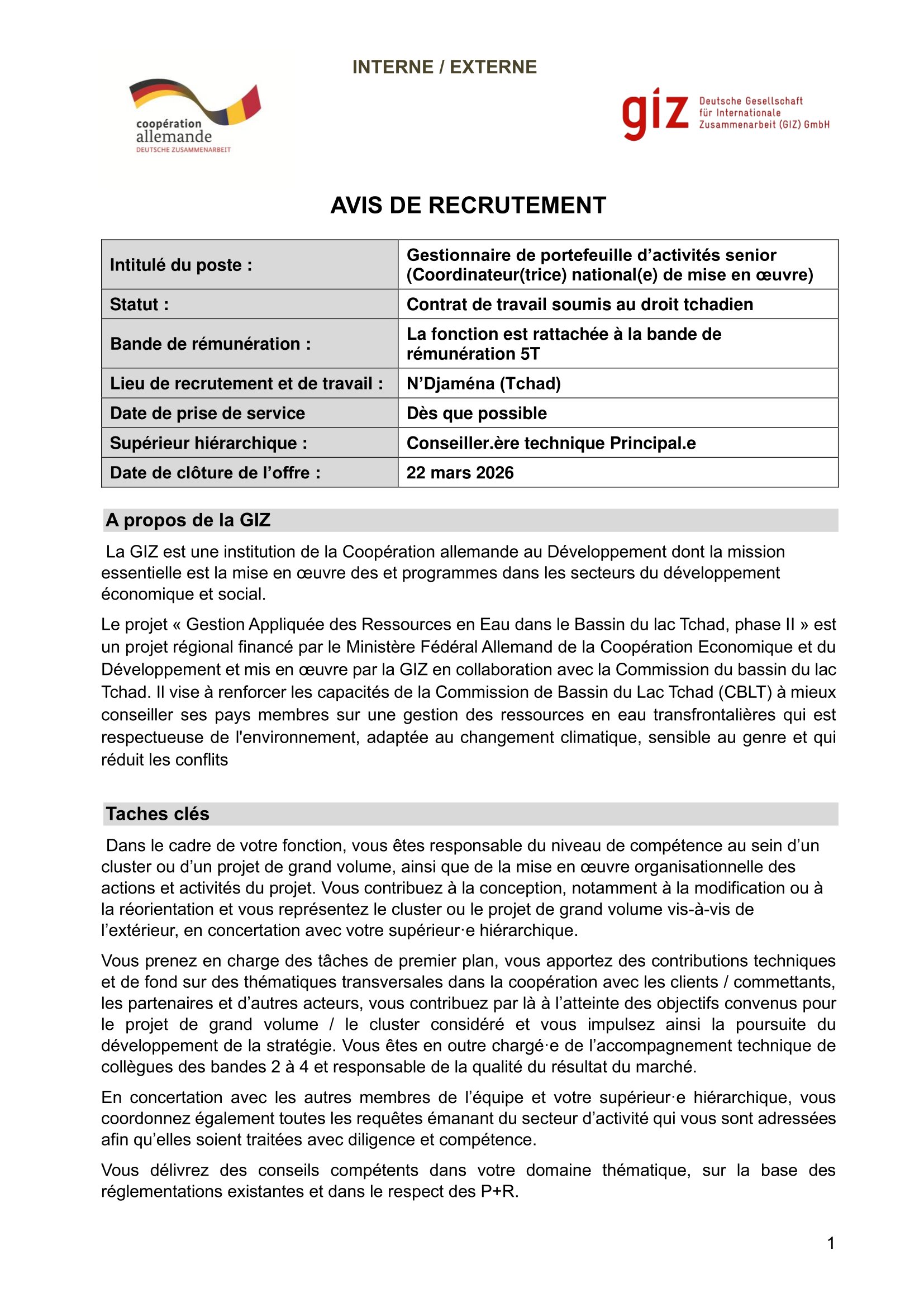 Accueil » Opportunités » Afrique » Tchad » La GIZ au Tchad lance un avis de recrutement d’un(e) Gestionnaire de portefeuille d’activités senior – Coordinateur(rice) national(e) de mise en œuvre, poste basé à N’Djamena