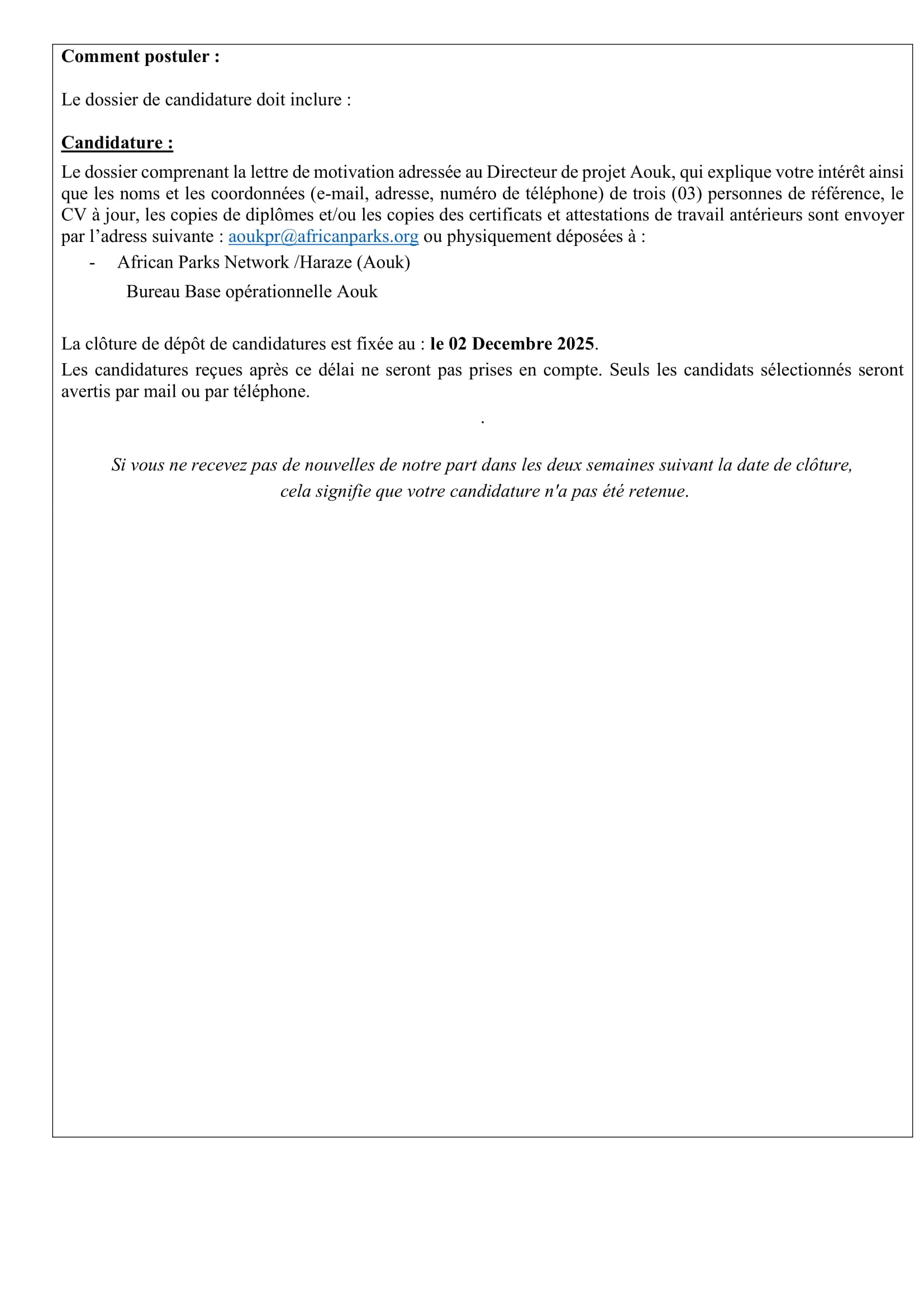 Accueil » Opportunités » Afrique » Tchad » African Parks lance un avis de recrutement d’un(e) Responsable des financements et des rapports (FRM), Tchad