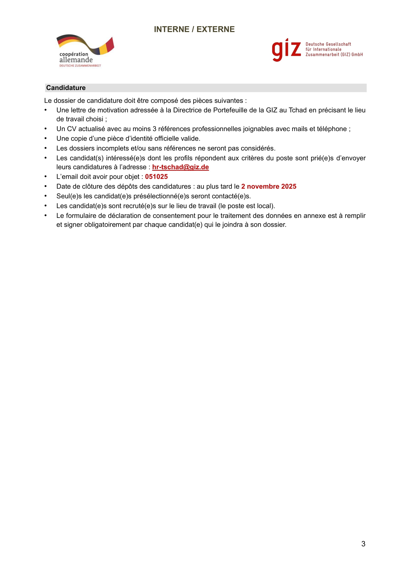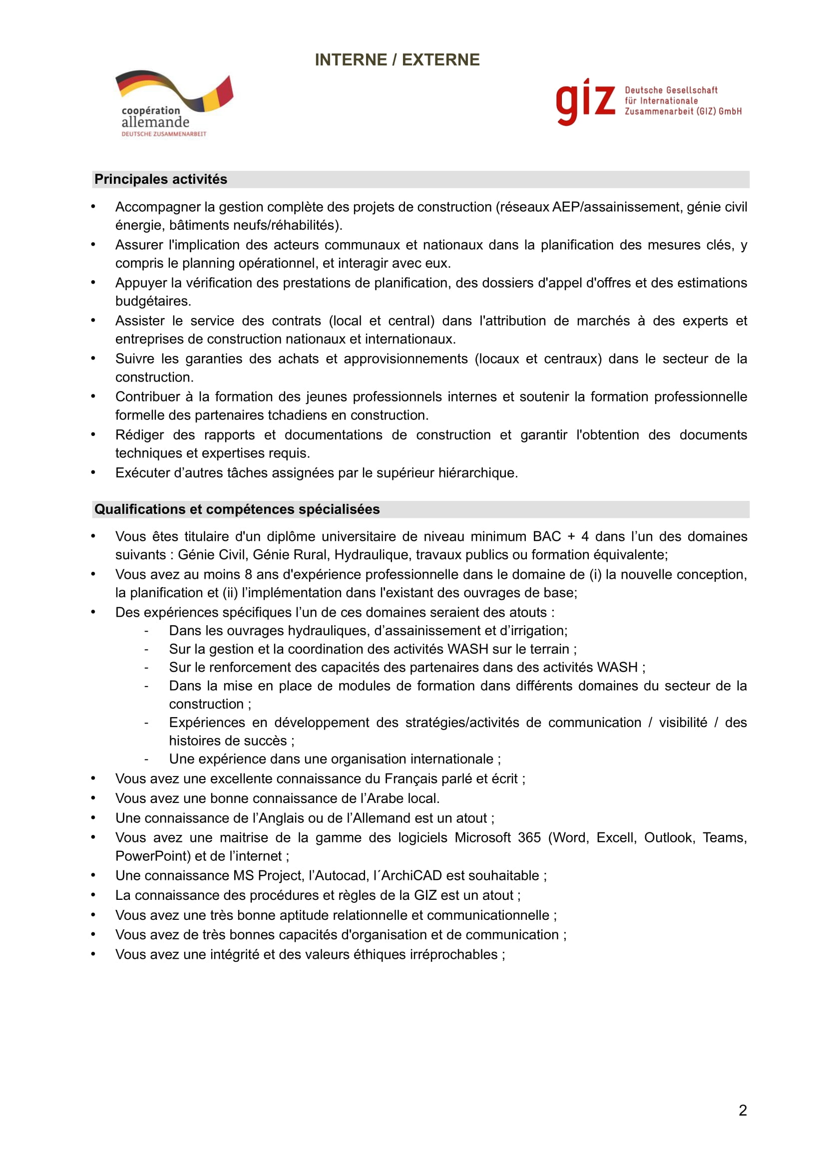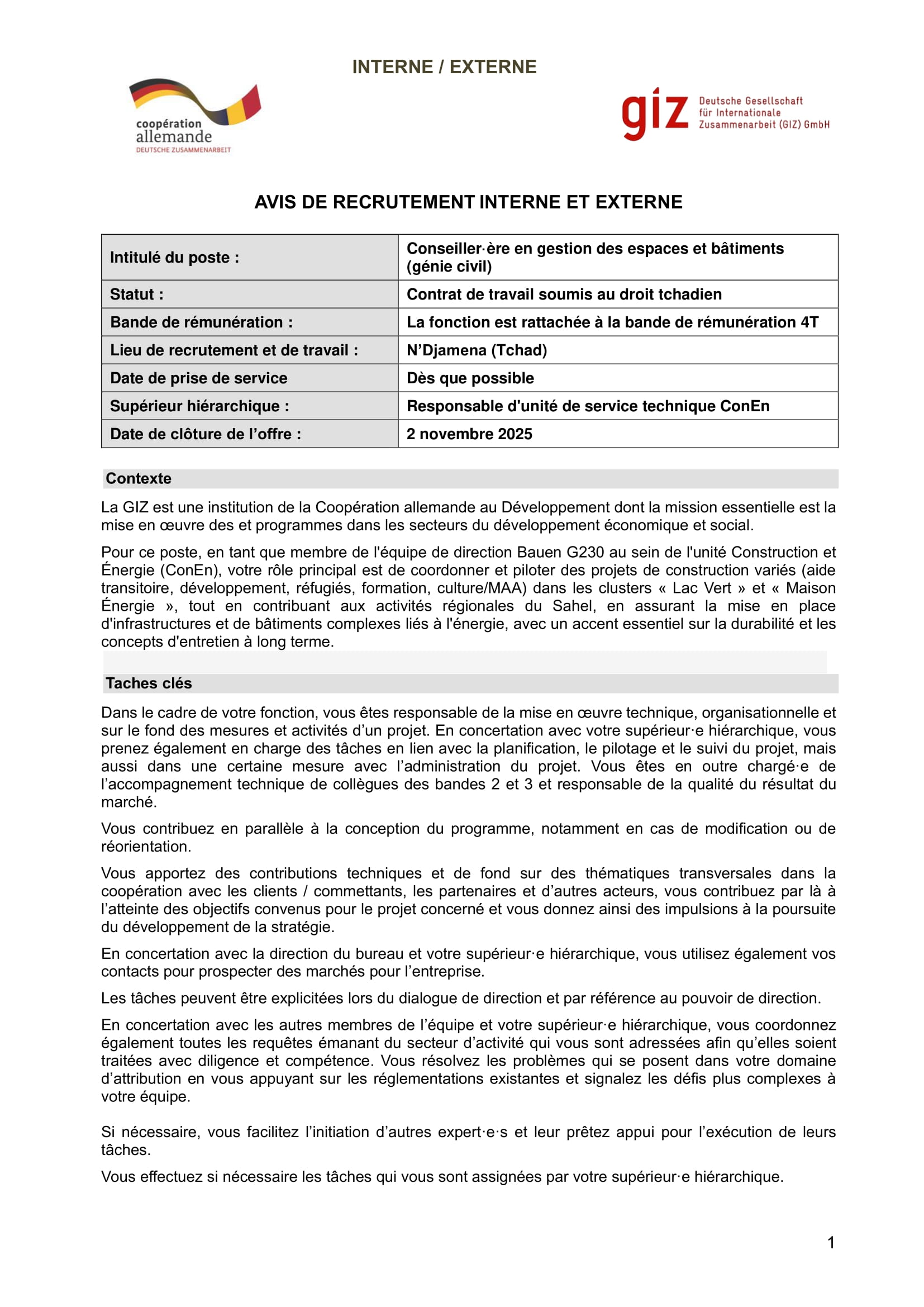Accueil » Opportunités » Afrique » Tchad » GIZ recrute un(e) Conseiller(ère) en gestion des espaces et bâtiments (génie civil) à N’Djamena, Tchad