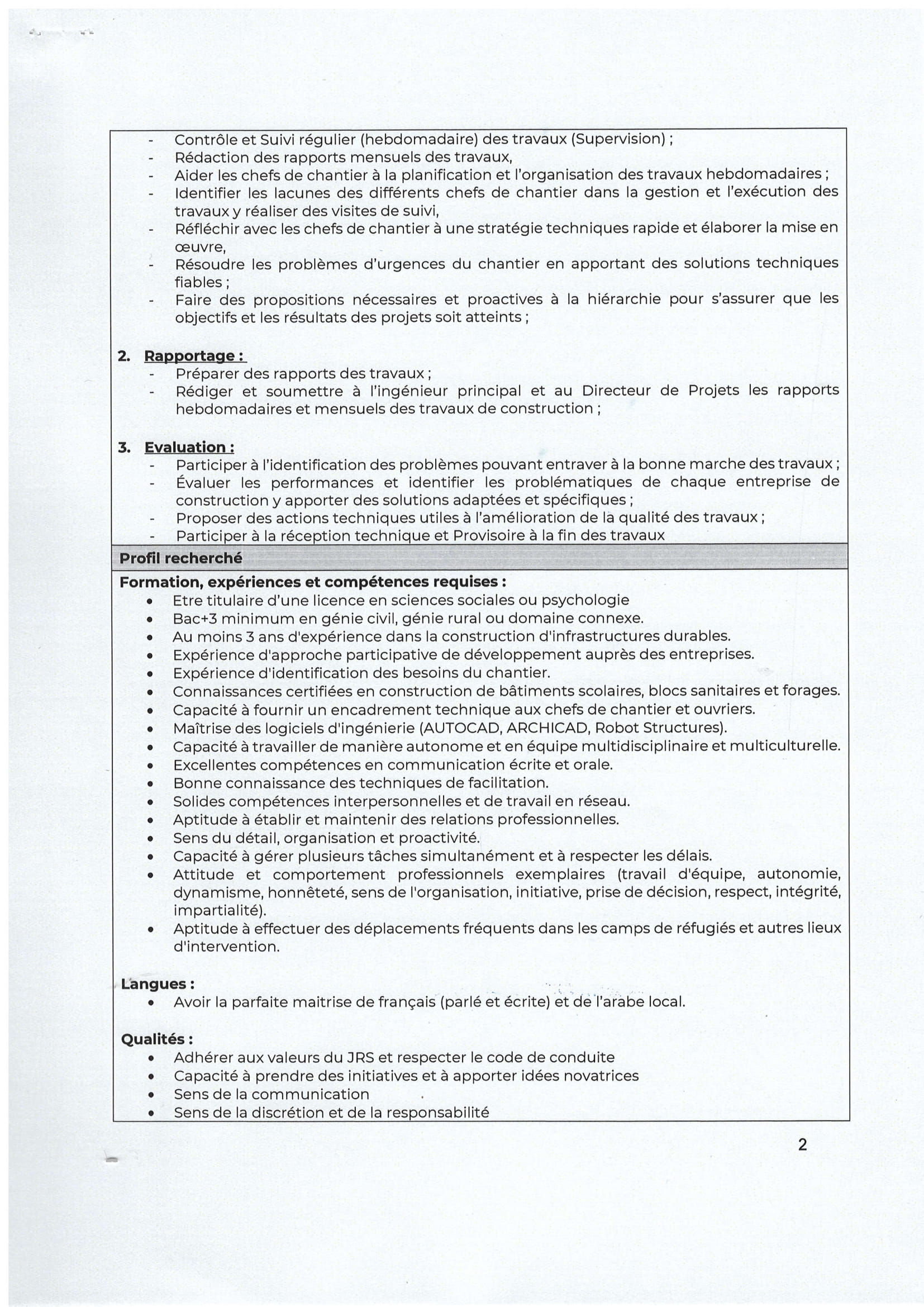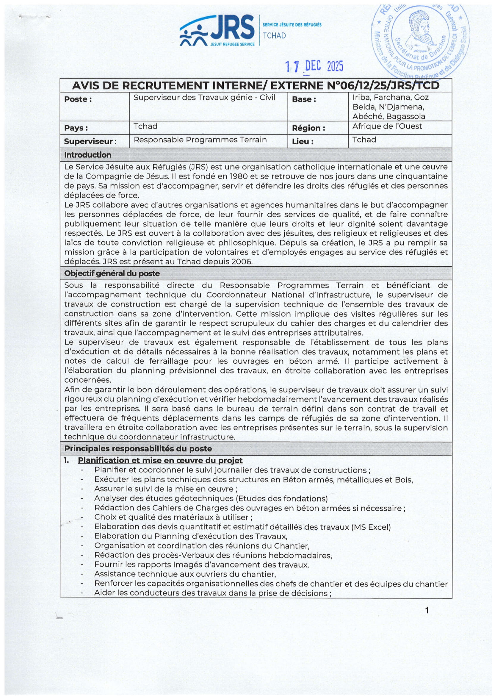 Le Service Jésuite des Réfugiés (JRS) au Tchad recherche des Superviseurs des Travaux génie civil, poste basés à Iriba, Farchana, Goz Beïda, N’Djamena, Abéché et Bagassola