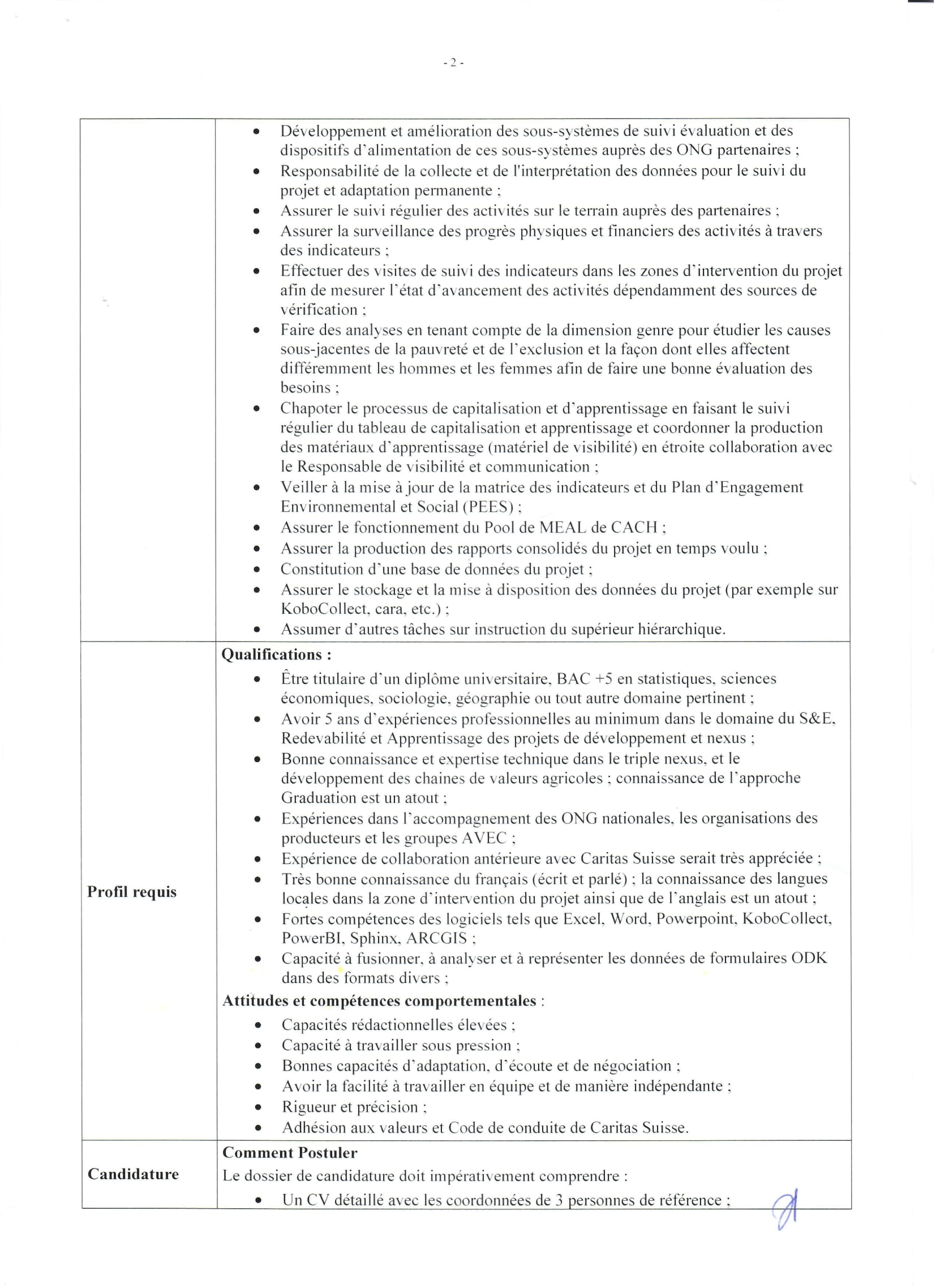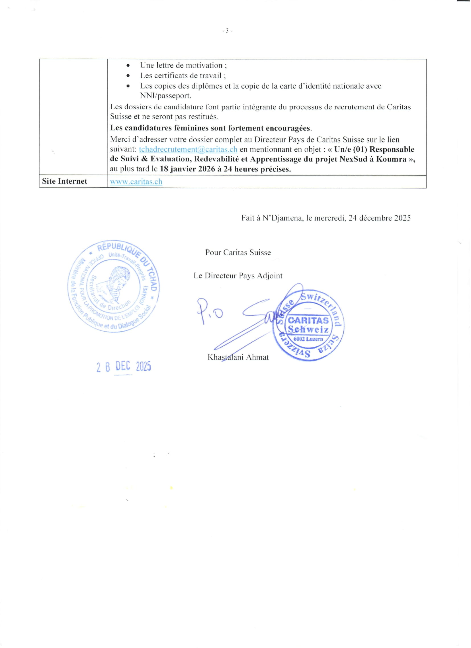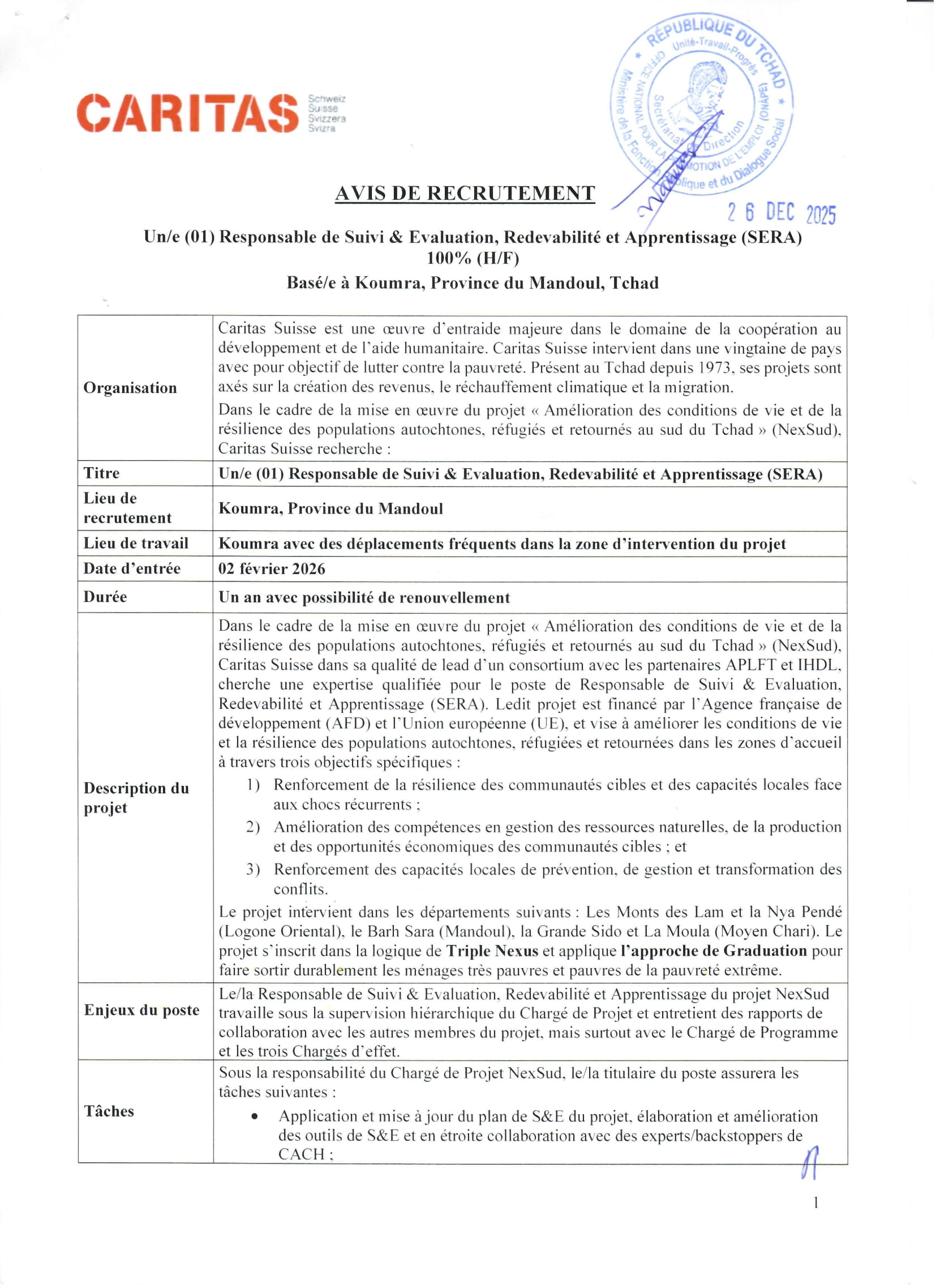 La Caritas Suisse au Tchad recherche un(e) Responsable de Suivi & Evaluation, Redevabilité et Apprentissage (SERA), poste basé à Koumra