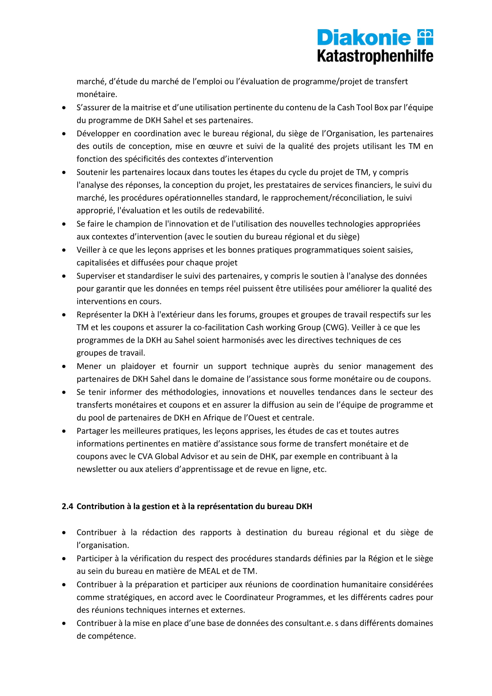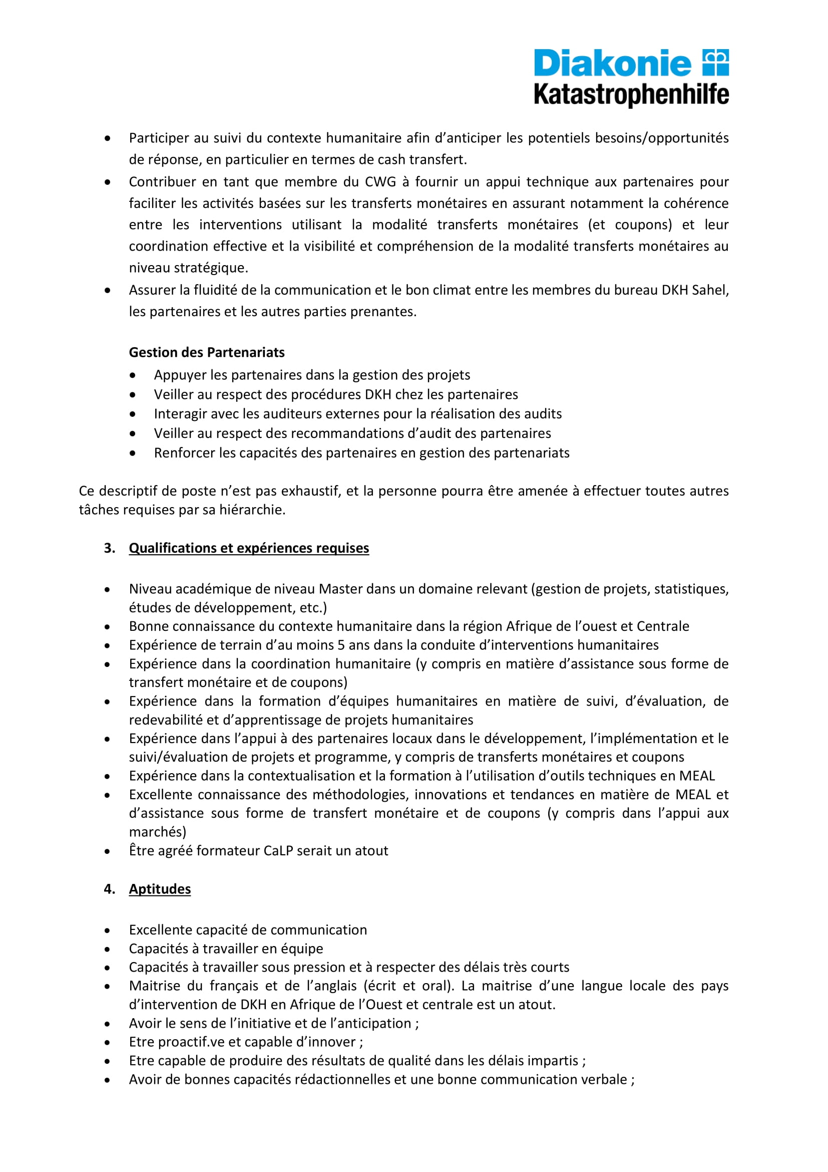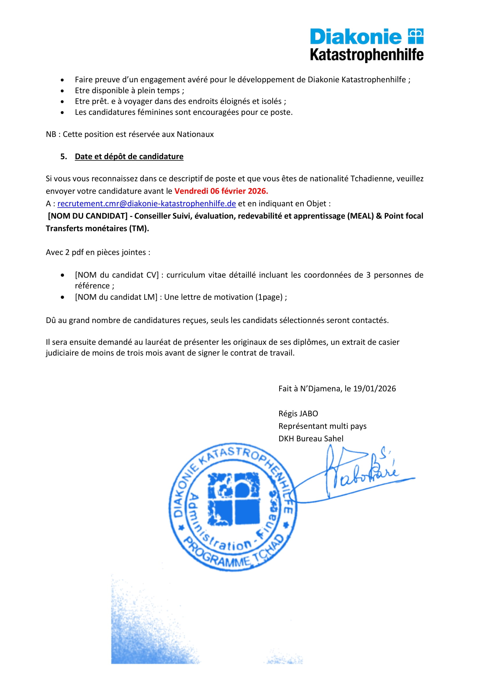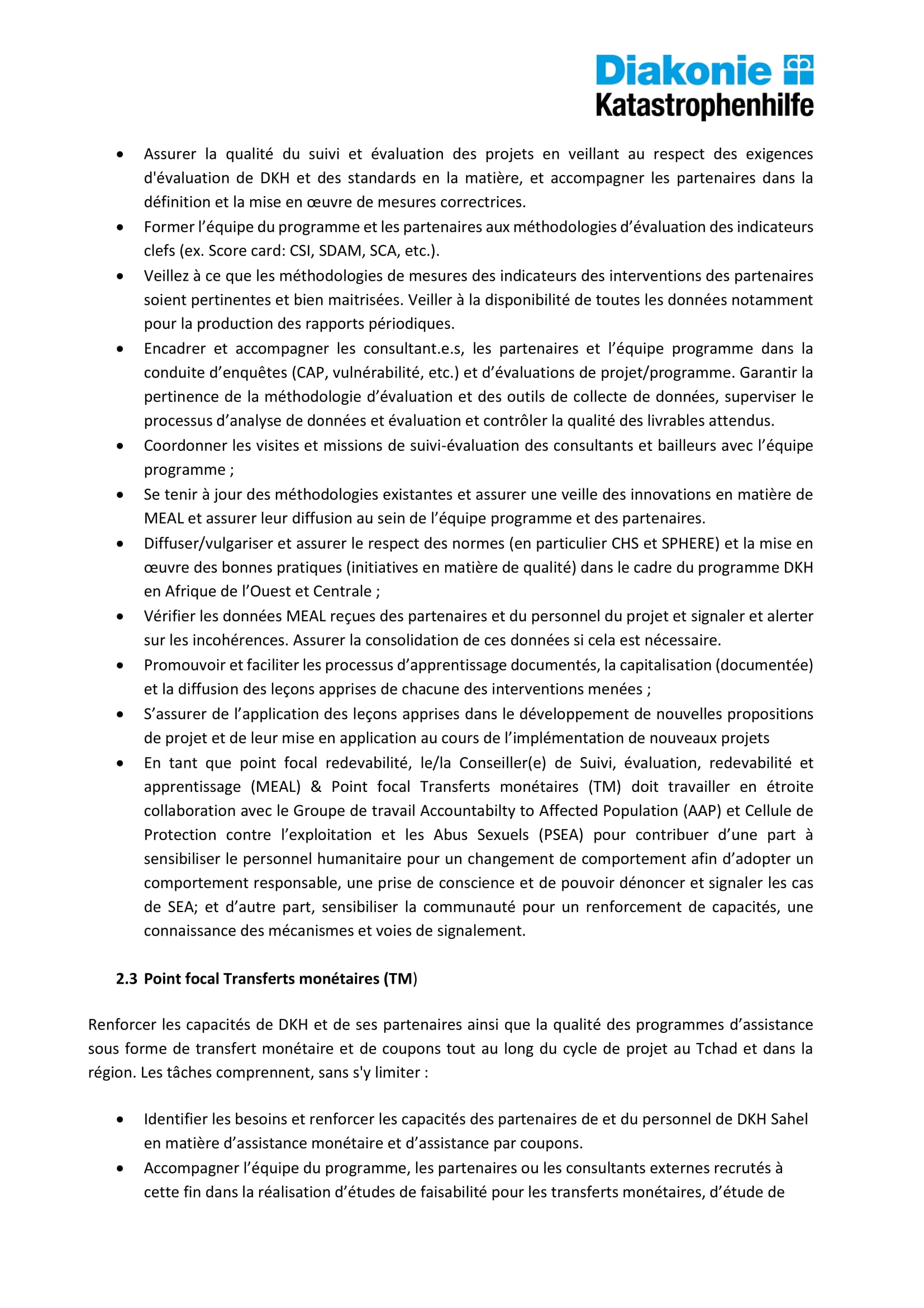 Diakonie Katastrophenhilfe au Tchad recherche un(e) Conseiller(ère) Suivi, évaluation, redevabilité et apprentissage (MEAL) & Point focal Transferts monétaires