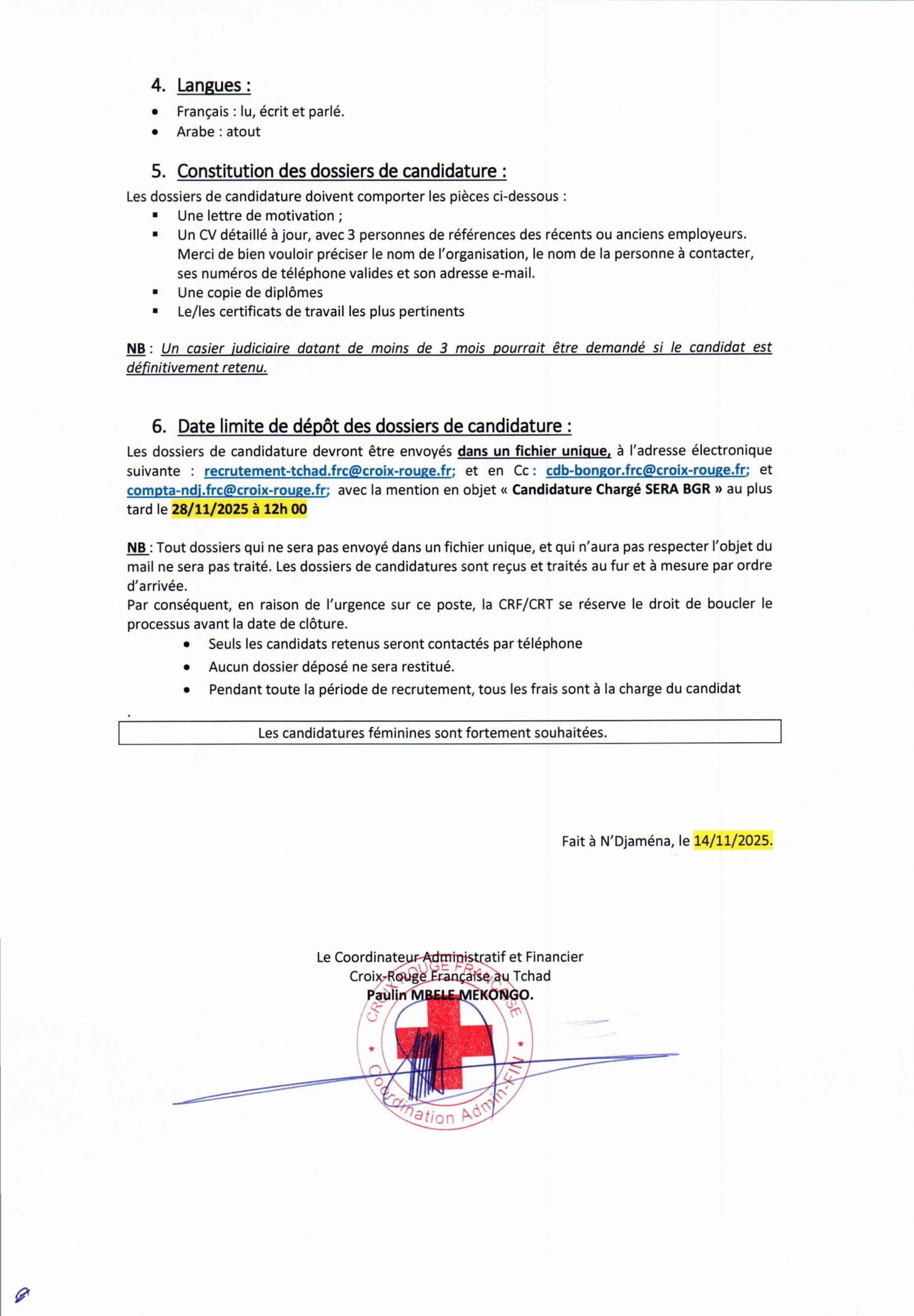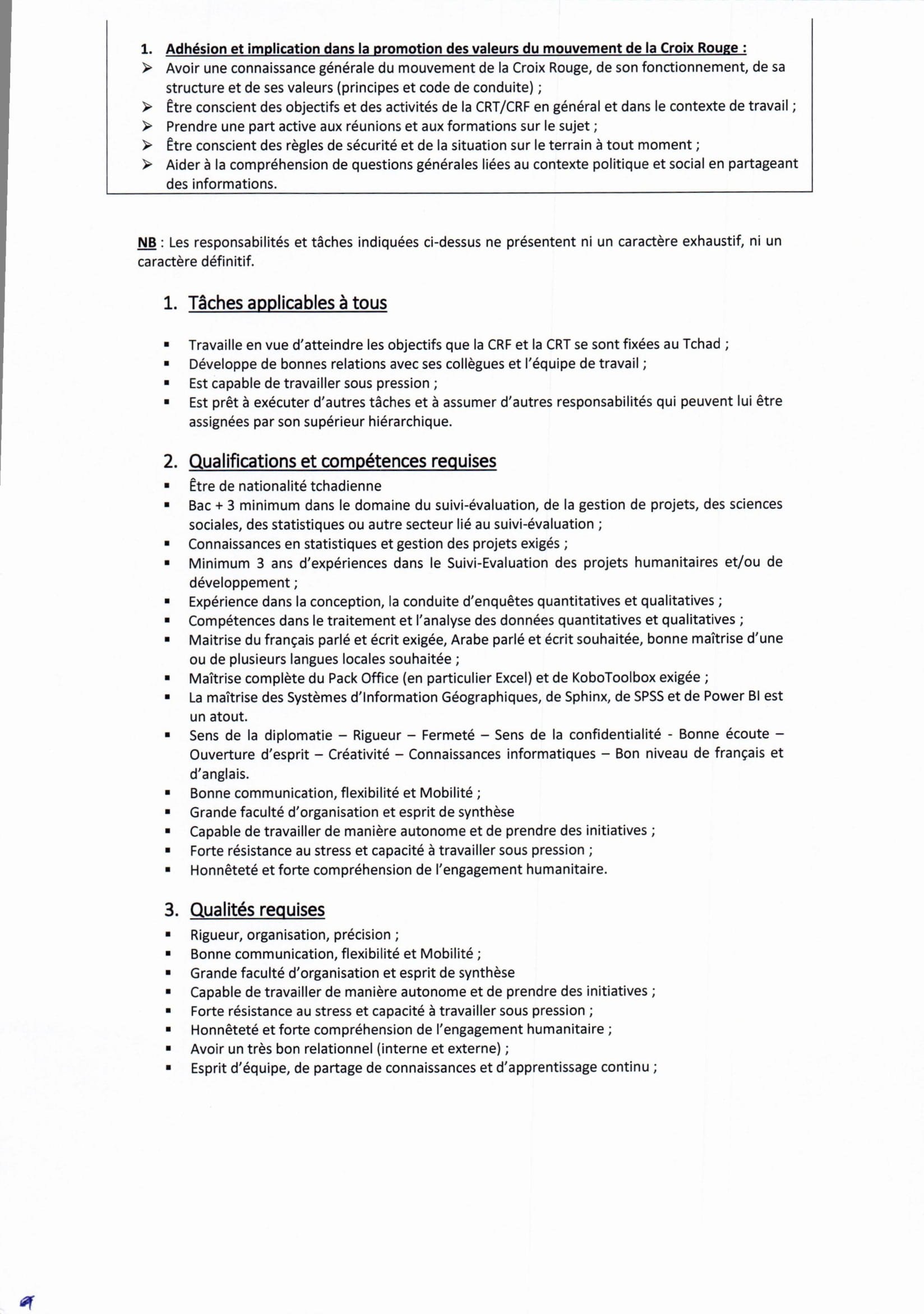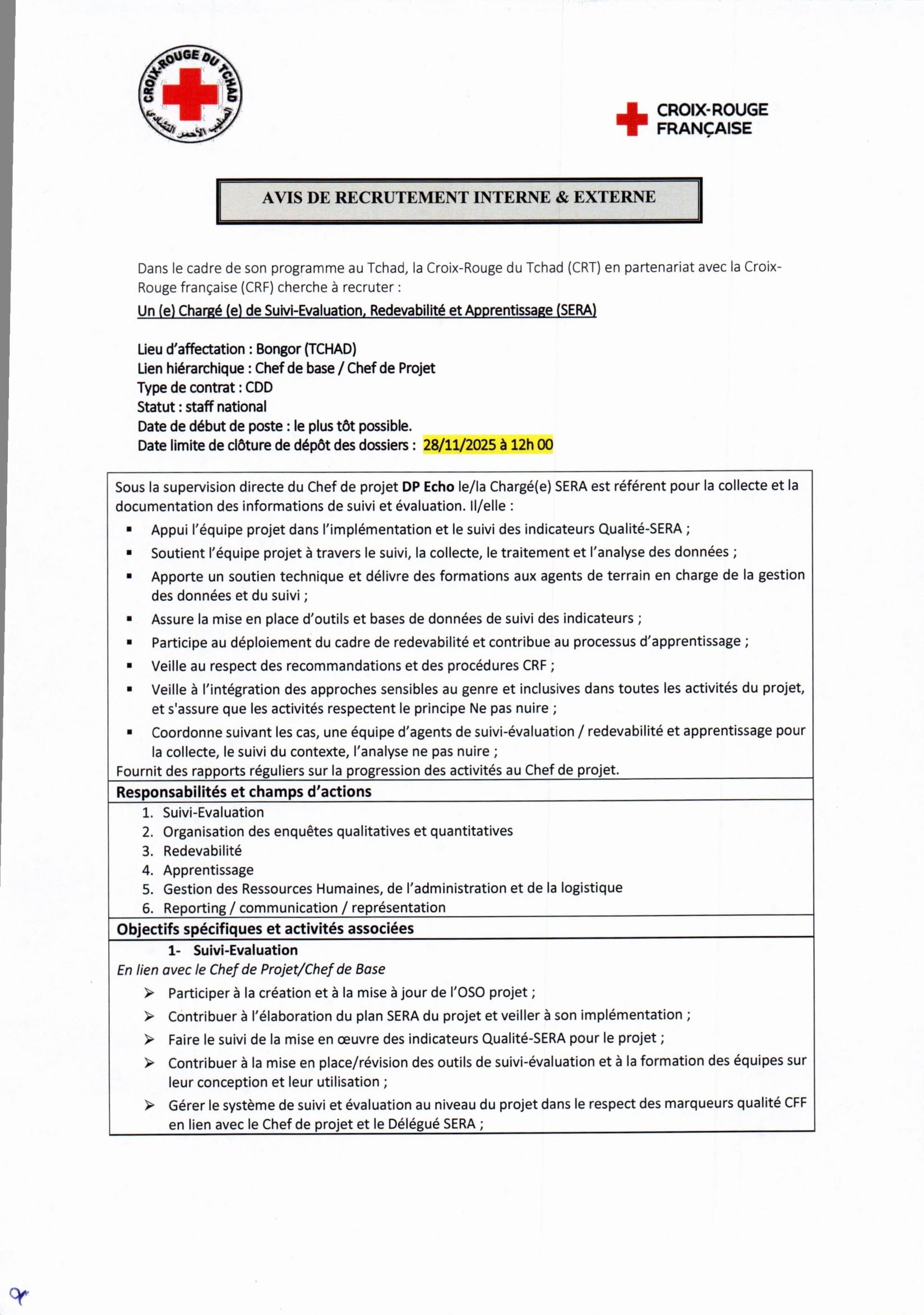Accueil » Opportunités » Afrique » Tchad » La Croix-Rouge du Tchad recrute un(e) Chargé(e) de Suivi-Evaluation, Redevabilité et Apprentissage (SERA) basé(e) à Bongor