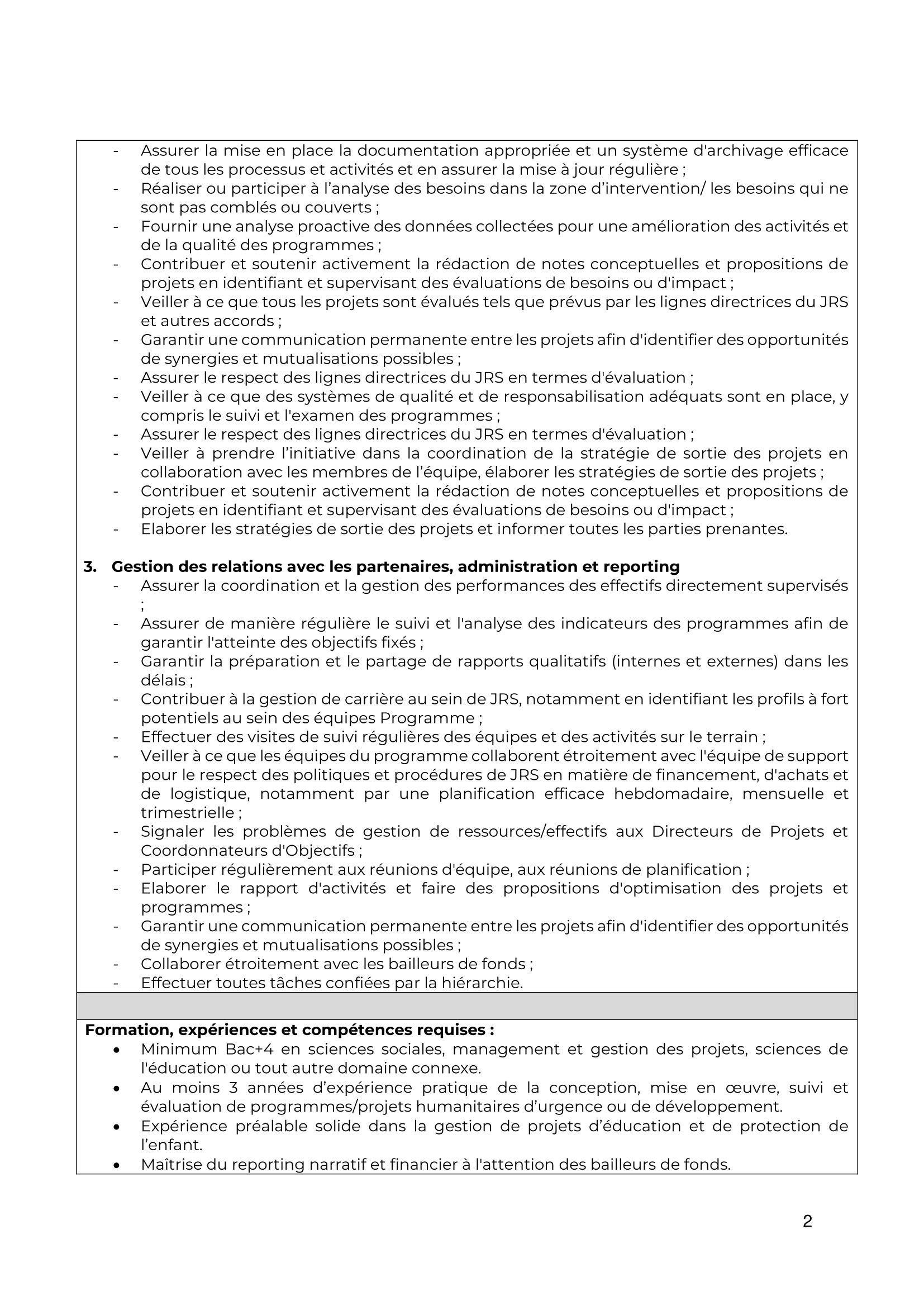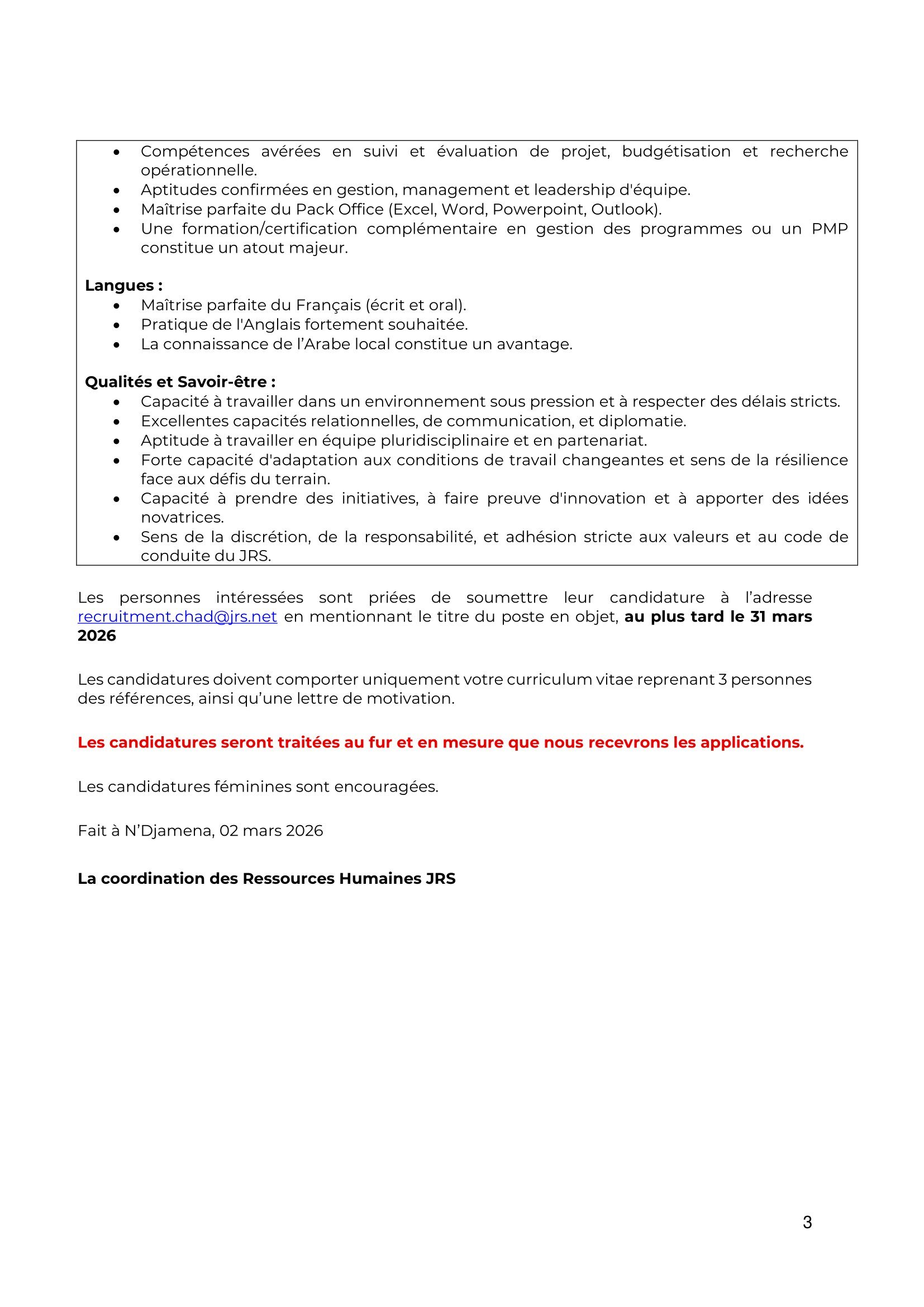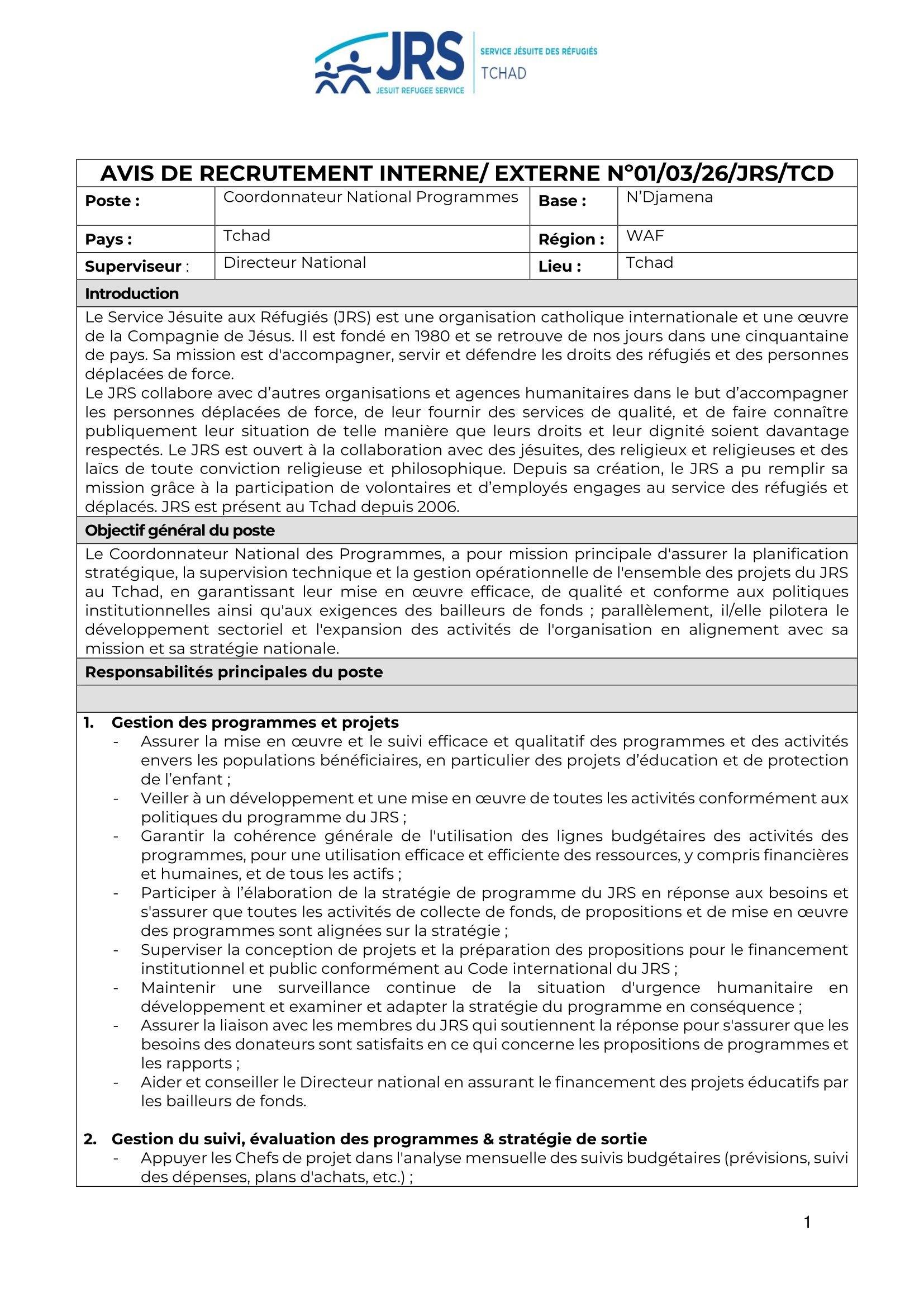 Accueil » Opportunités » Afrique » Tchad » Le Service Jésuite des Réfugiés (JRS) recherche un(e) Coordinateur(rice) National(e) Programmes, poste basé à N’Djamena (Tchad)