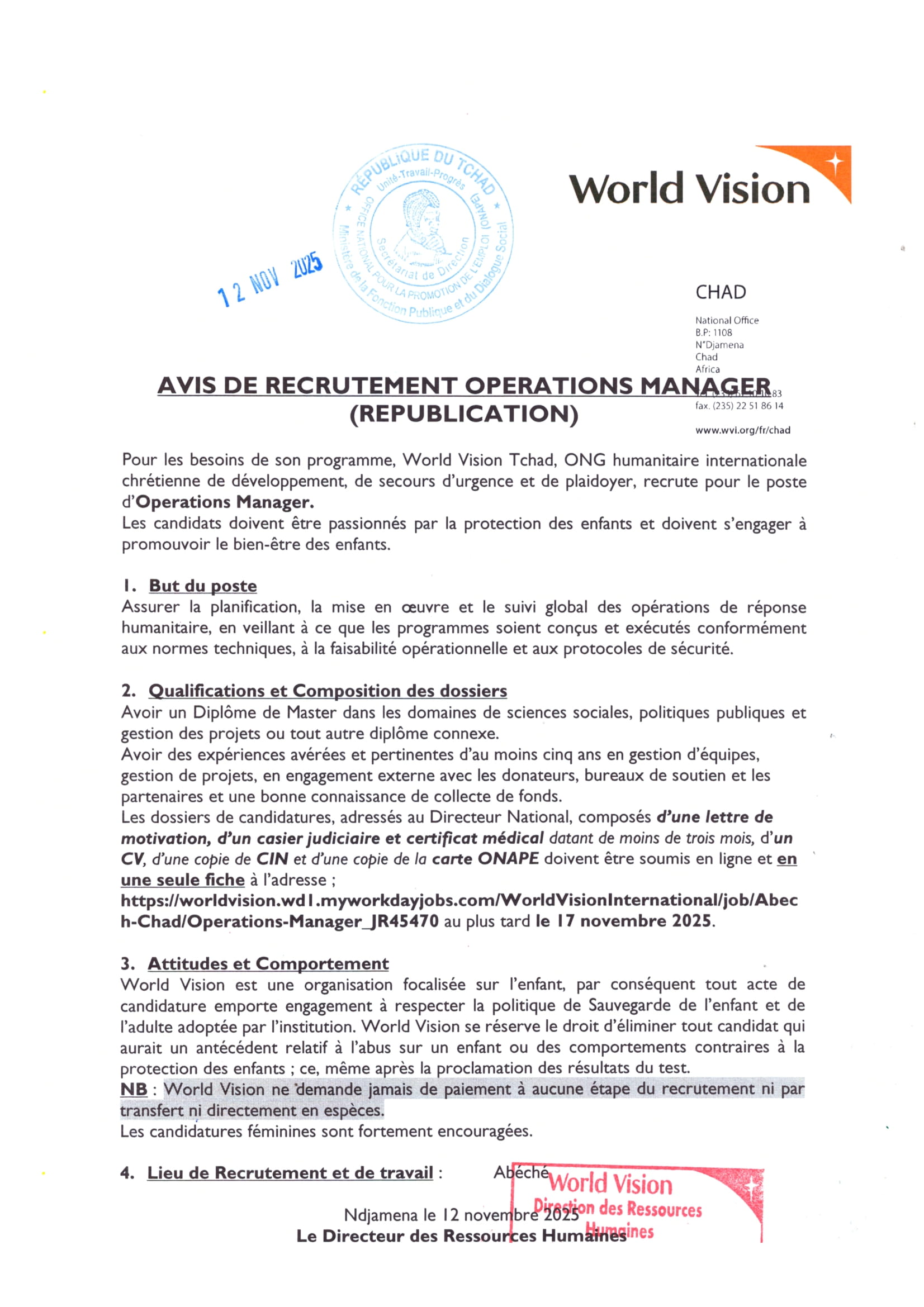 Accueil » Opportunités » Afrique » Tchad » World Vision lance un avis de recrutement d’un Operations Manager basé à Abéché, Tchad
