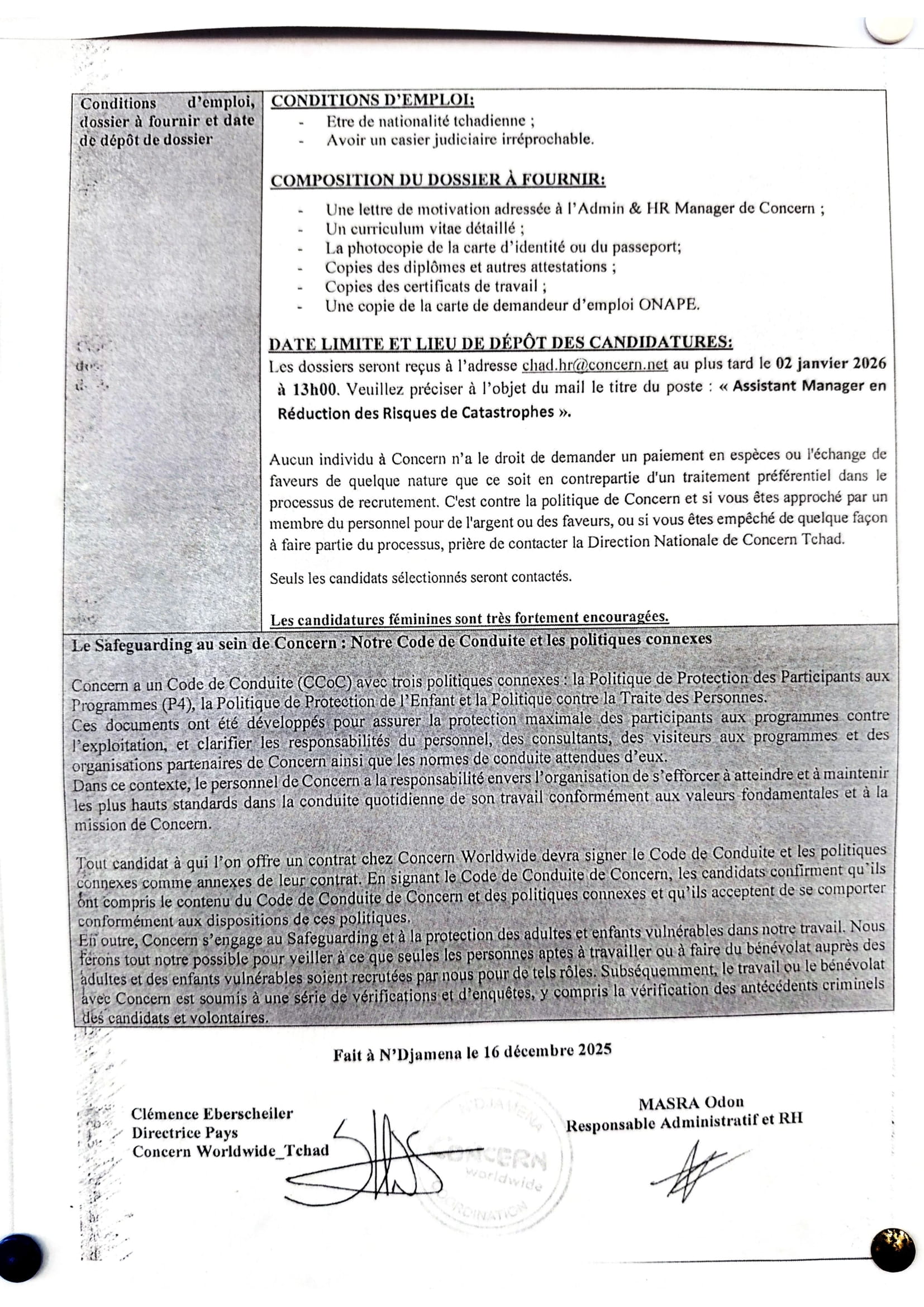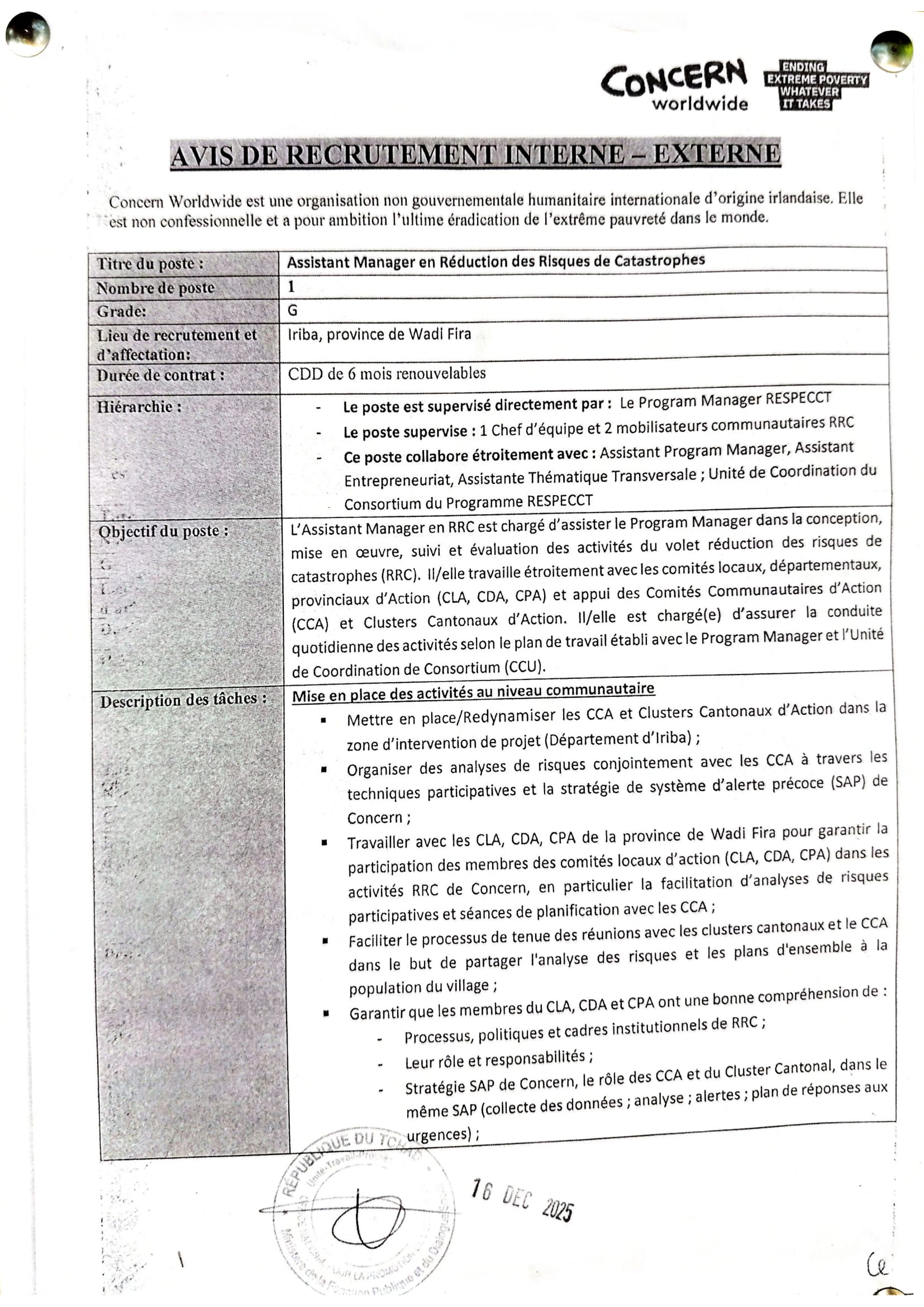 Accueil » Opportunités » Afrique » Tchad » Concern Worldwide au Tchad recherche un Assistant Manager en Réduction des Risques de Catastrophes, poste basé à Iriba