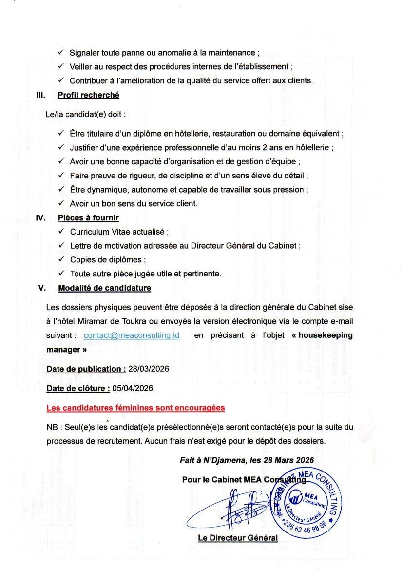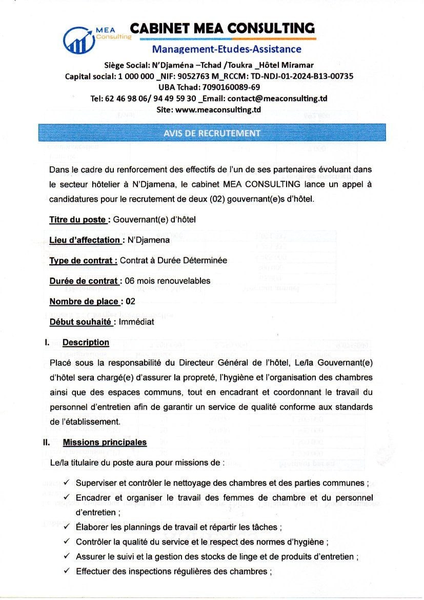 Accueil » Opportunités » Afrique » Tchad » Le Cabinet MEA CONSULTING recrute pour l’un des ses clients à N’Djamena (02) Gouvernant(e)s d’Hôtel