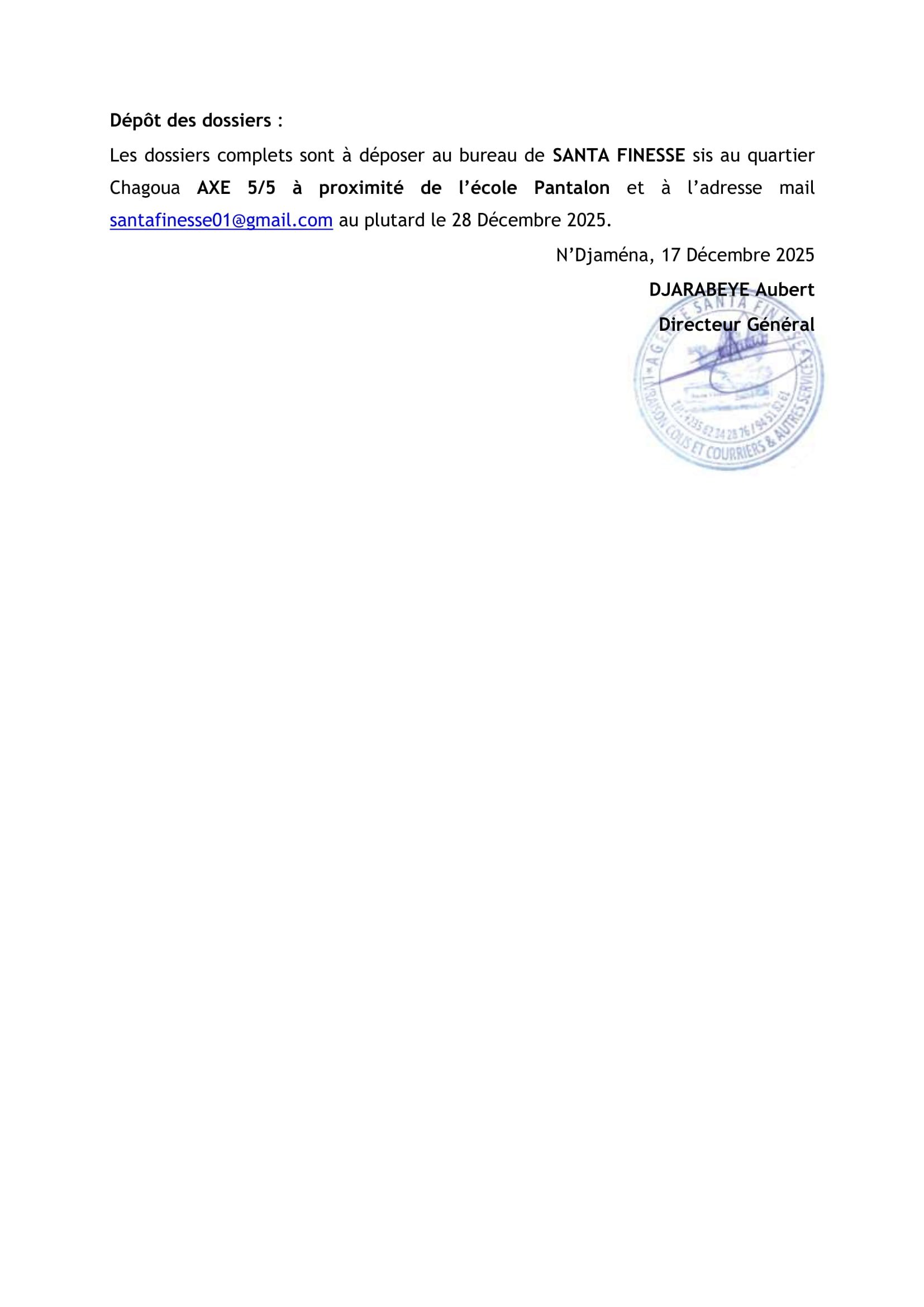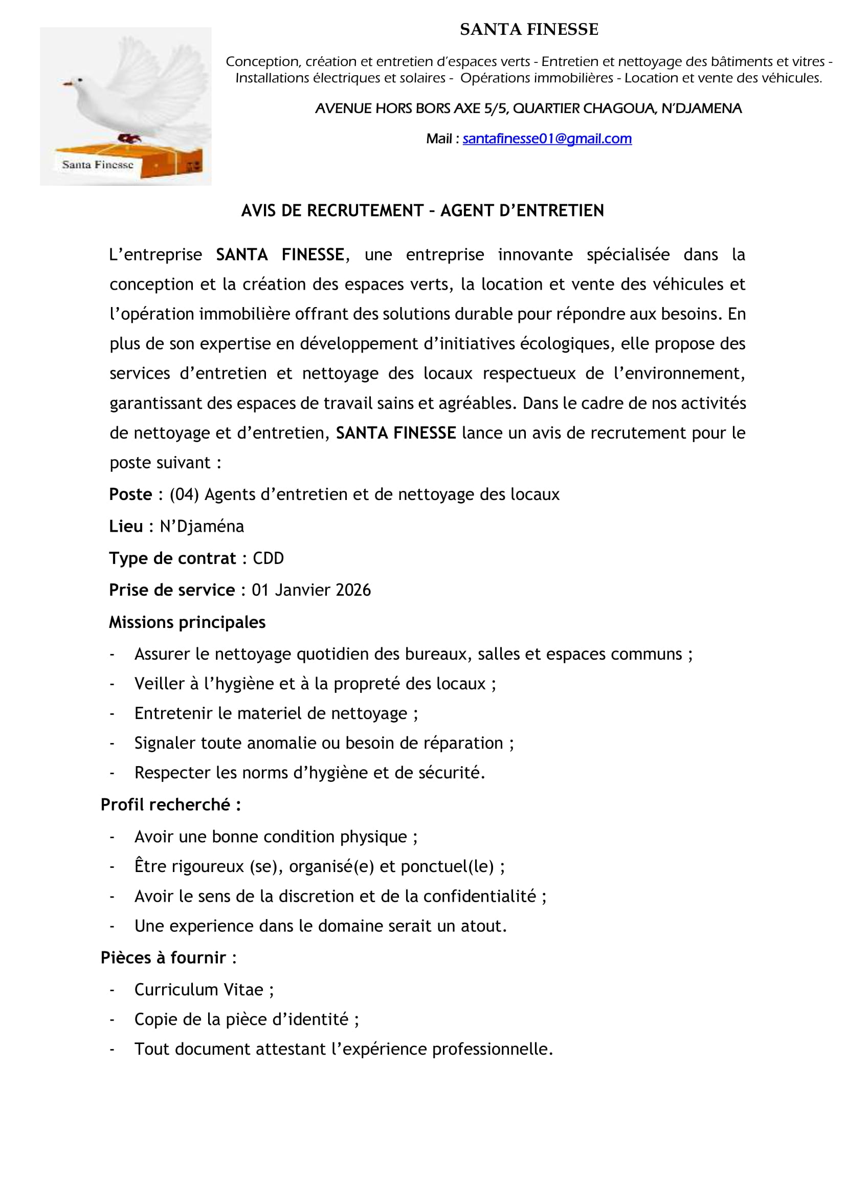 L’Entreprise SANTA FINESSE au  Tchad recherche (04) Agents d’entretien et de nettoyage des locaux, postes basés à N’Djamena