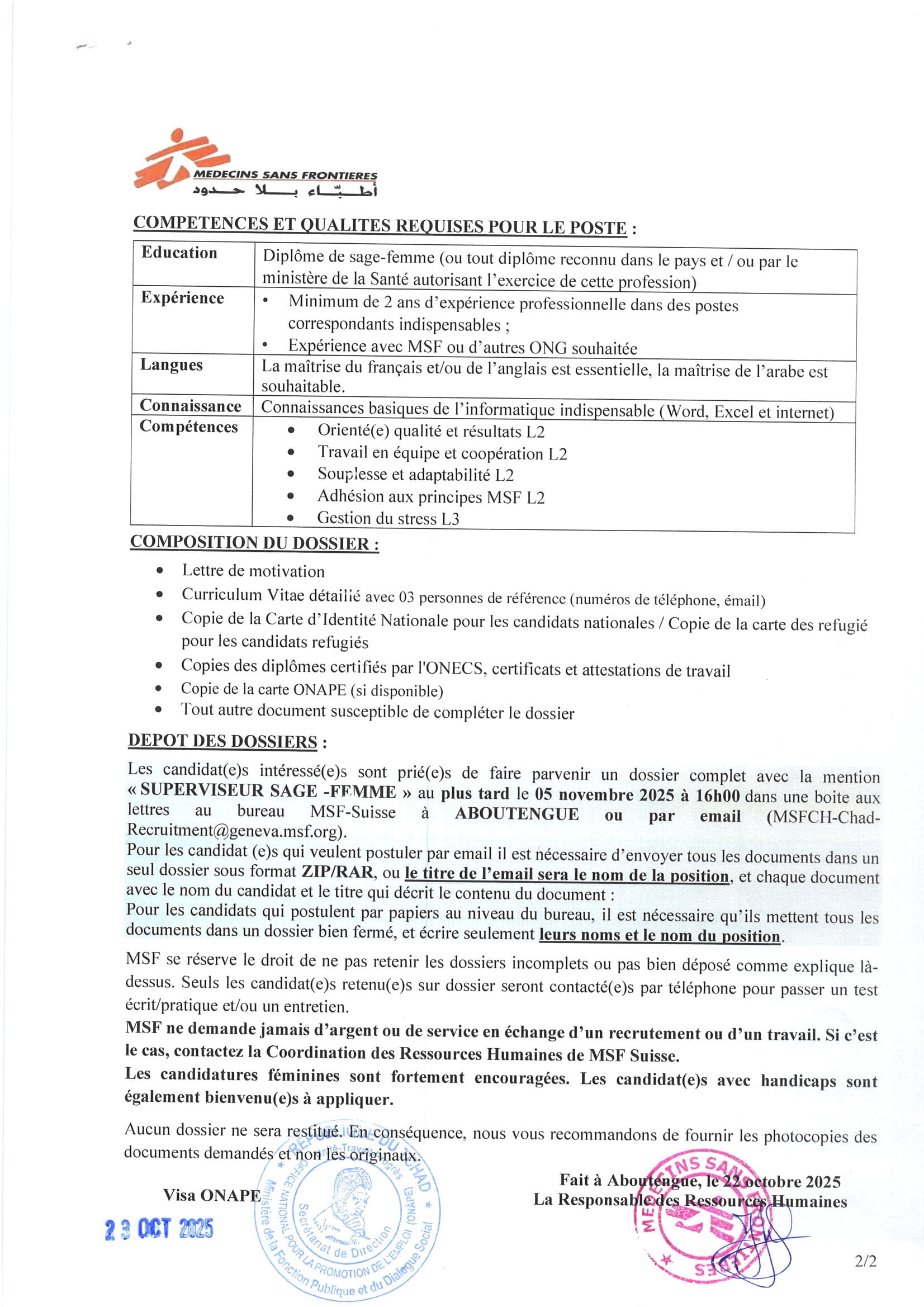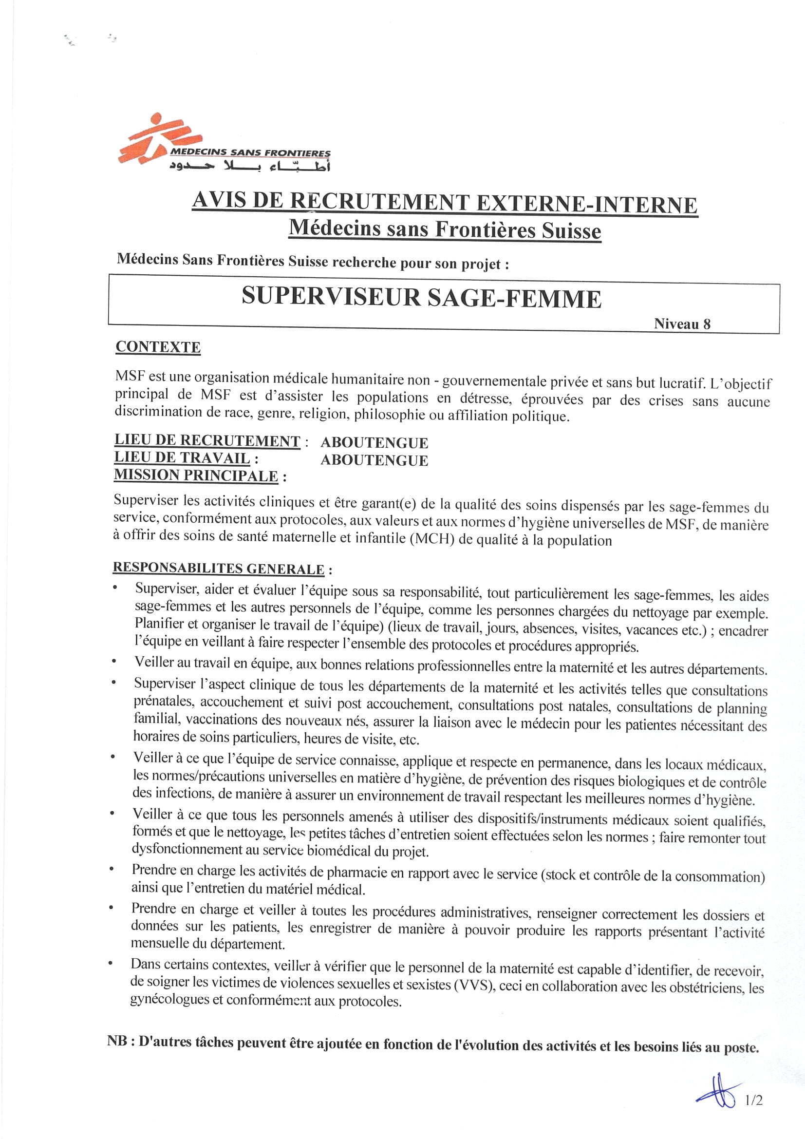 Accueil » Opportunités » Afrique » Tchad » Médecins Sans Frontières (MSF) recrute un Superviseur Sage-Femme (H/F) à Aboutengue, Tchad