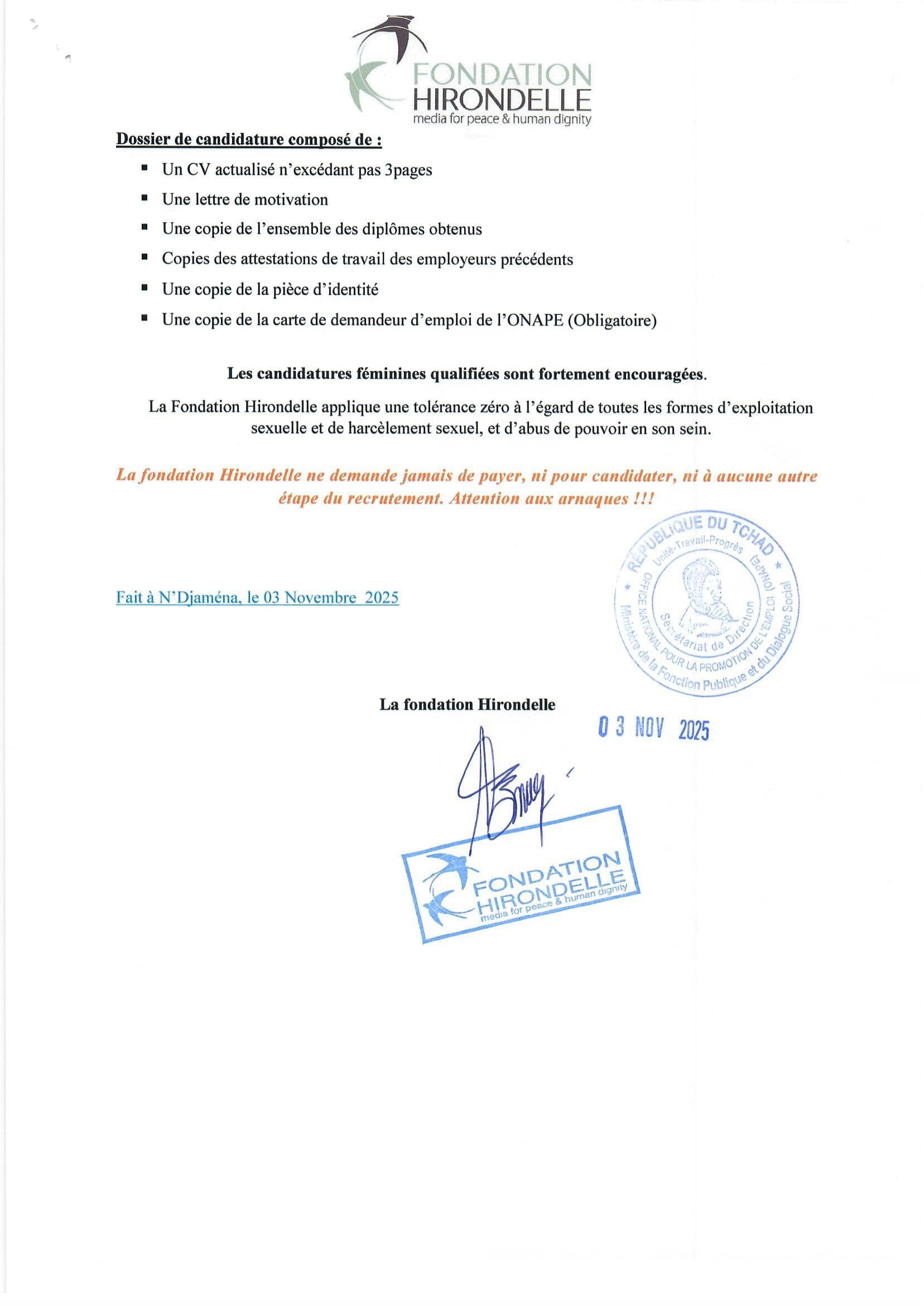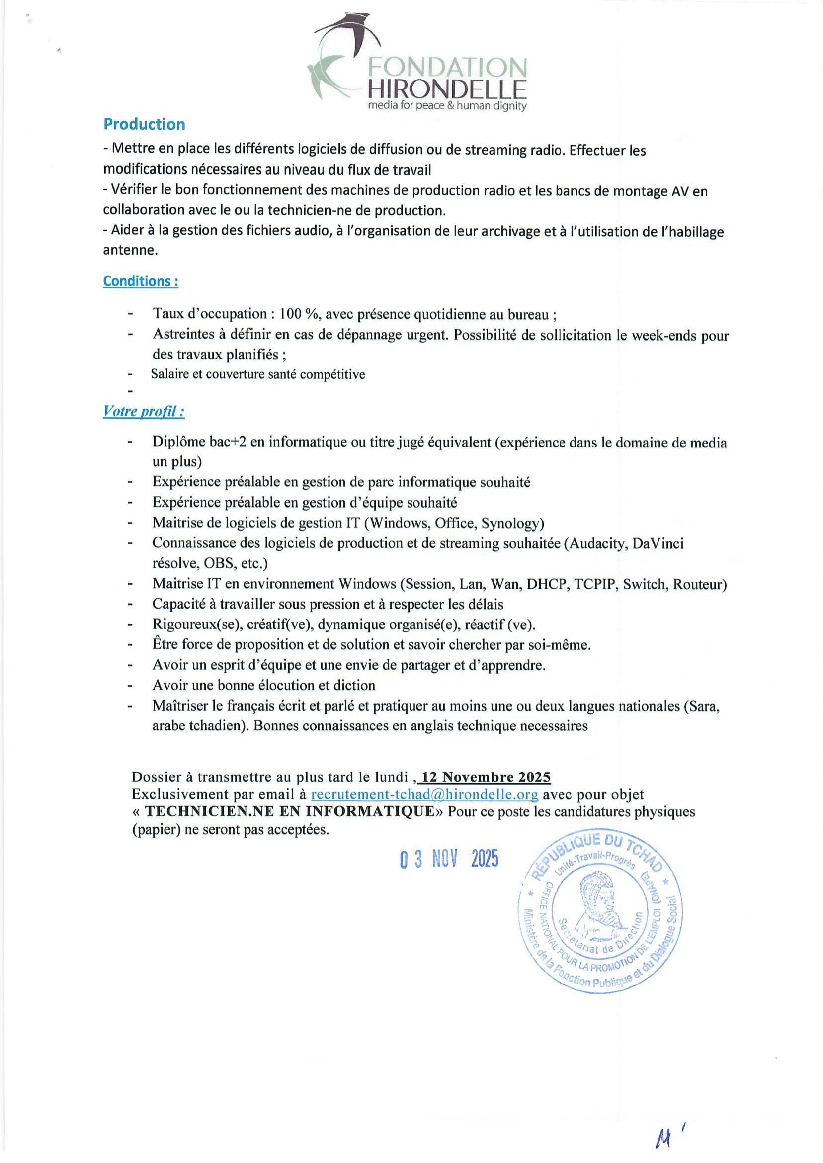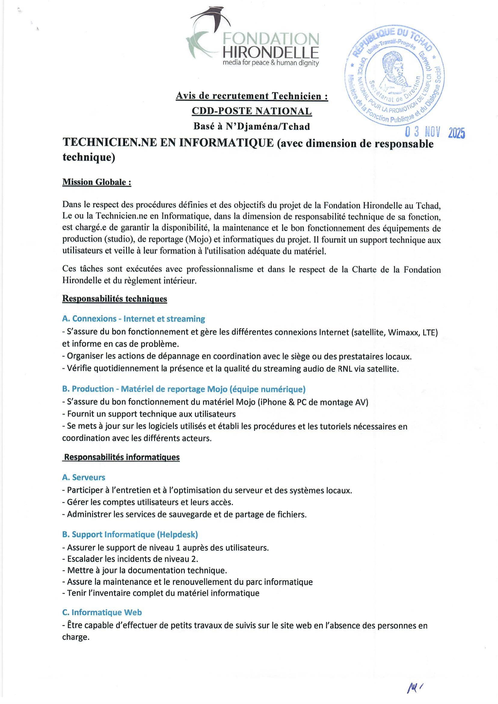 Accueil » Opportunités » Afrique » Tchad » La Fondation Hirondelle recrute un(e) Technicien(ne) en Informatique basé à N’Djamena, Tchad