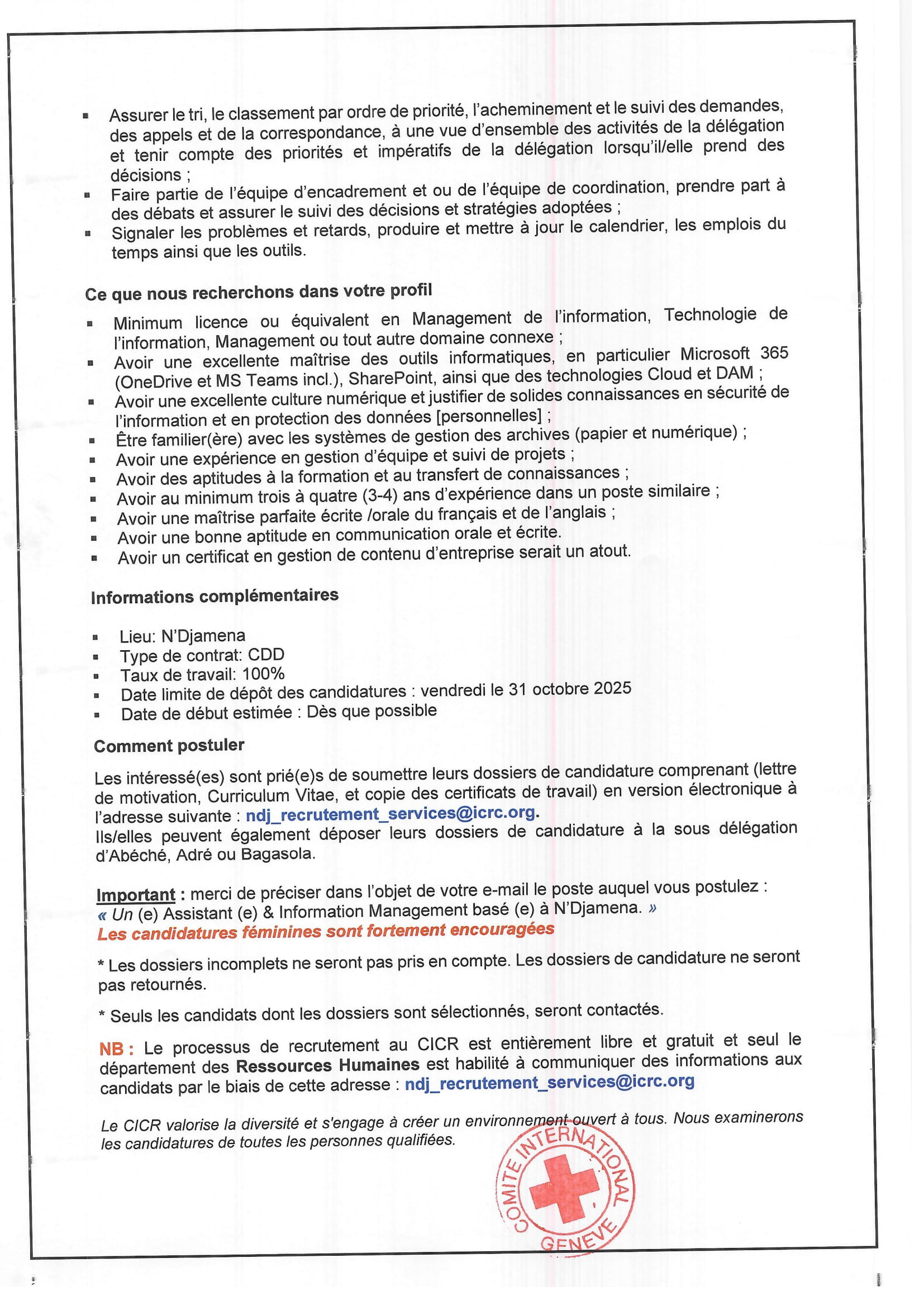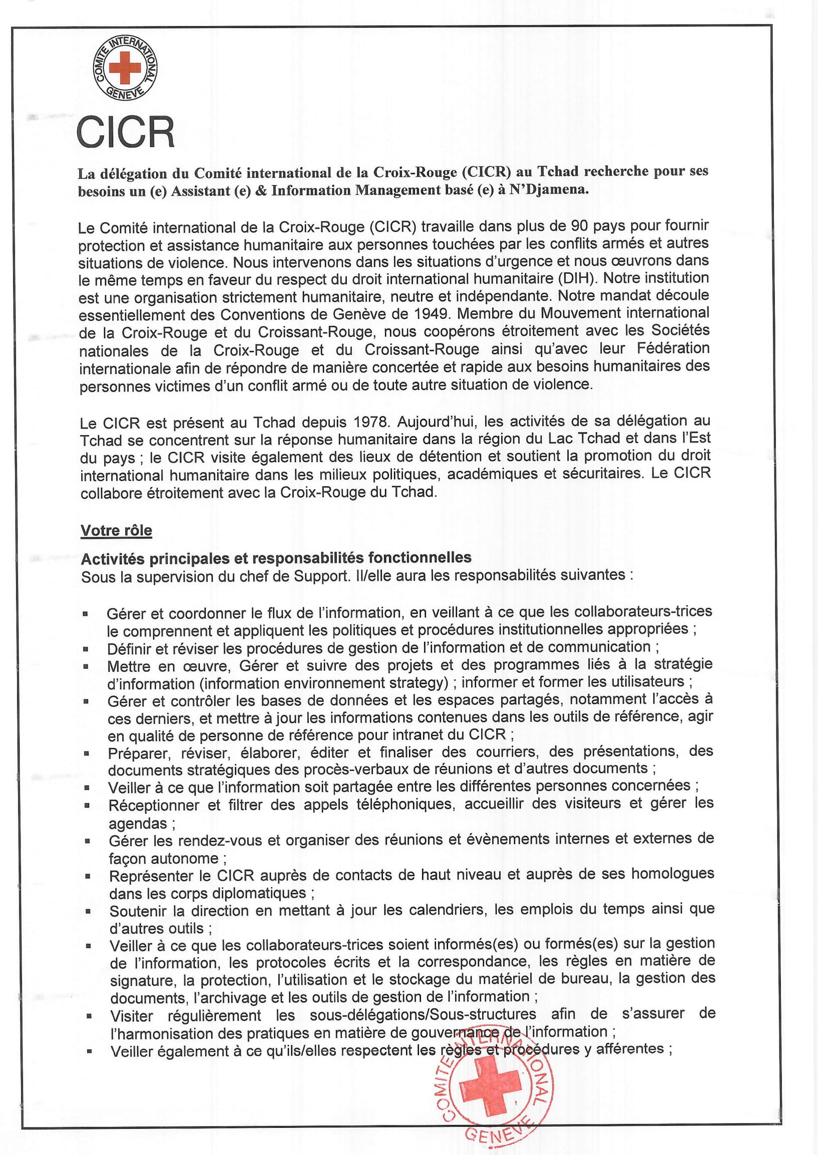 Accueil » Opportunités » Afrique » Tchad » Le Comité International de la Croix-Rouge (CICR) recrute à N’Djamena un Assistant & Information Management (H/F), Tchad
