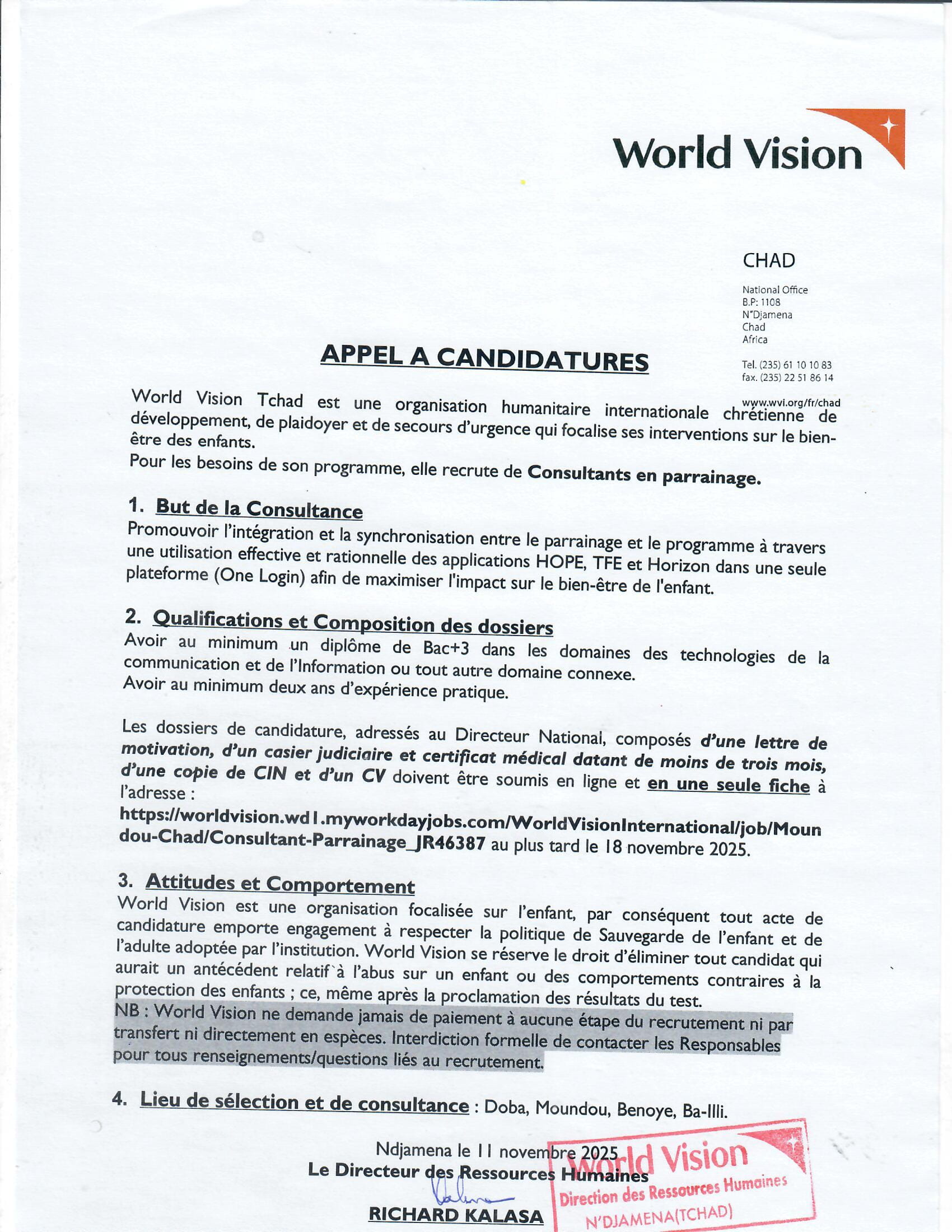 Accueil » Opportunités » Afrique » Tchad » World Vision recrute un Consultant en parrainage basé à Moundou, Tchad