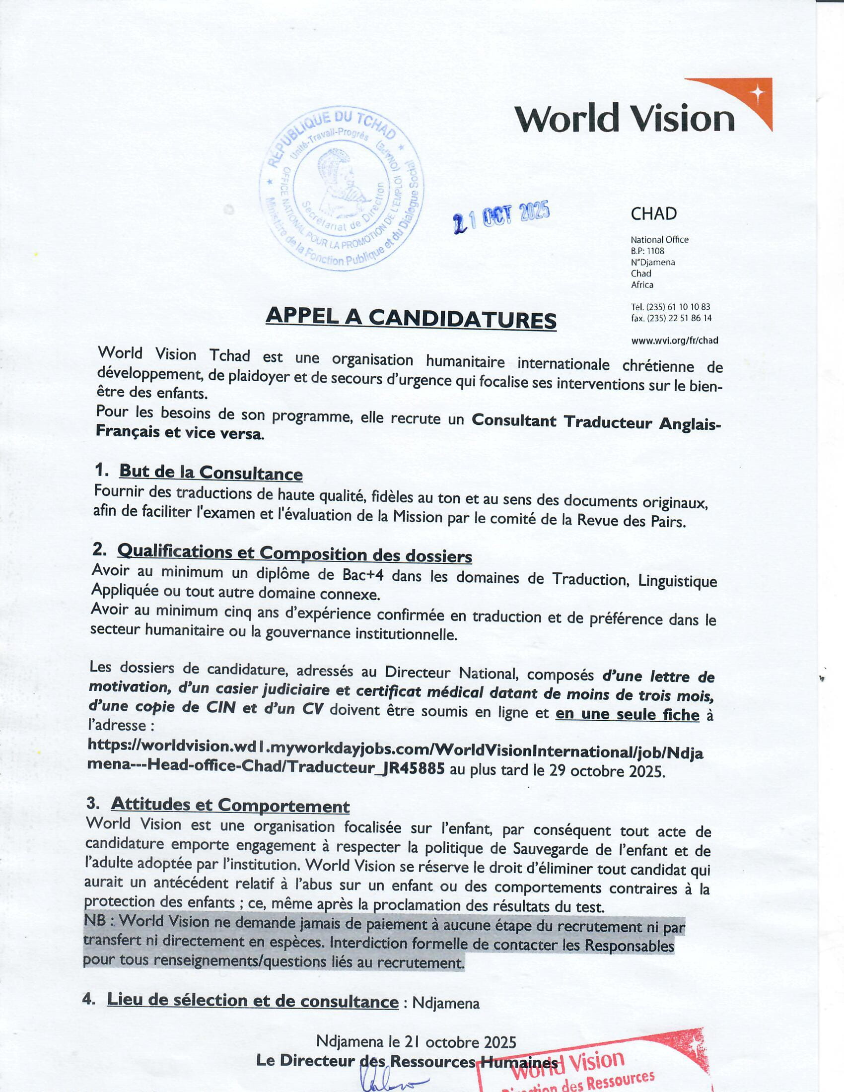 Accueil » Opportunités » Afrique » Tchad » World Vision recrute à N’Djamena un Consultant Traducteur Anglais-Français et vice versa, Tchad