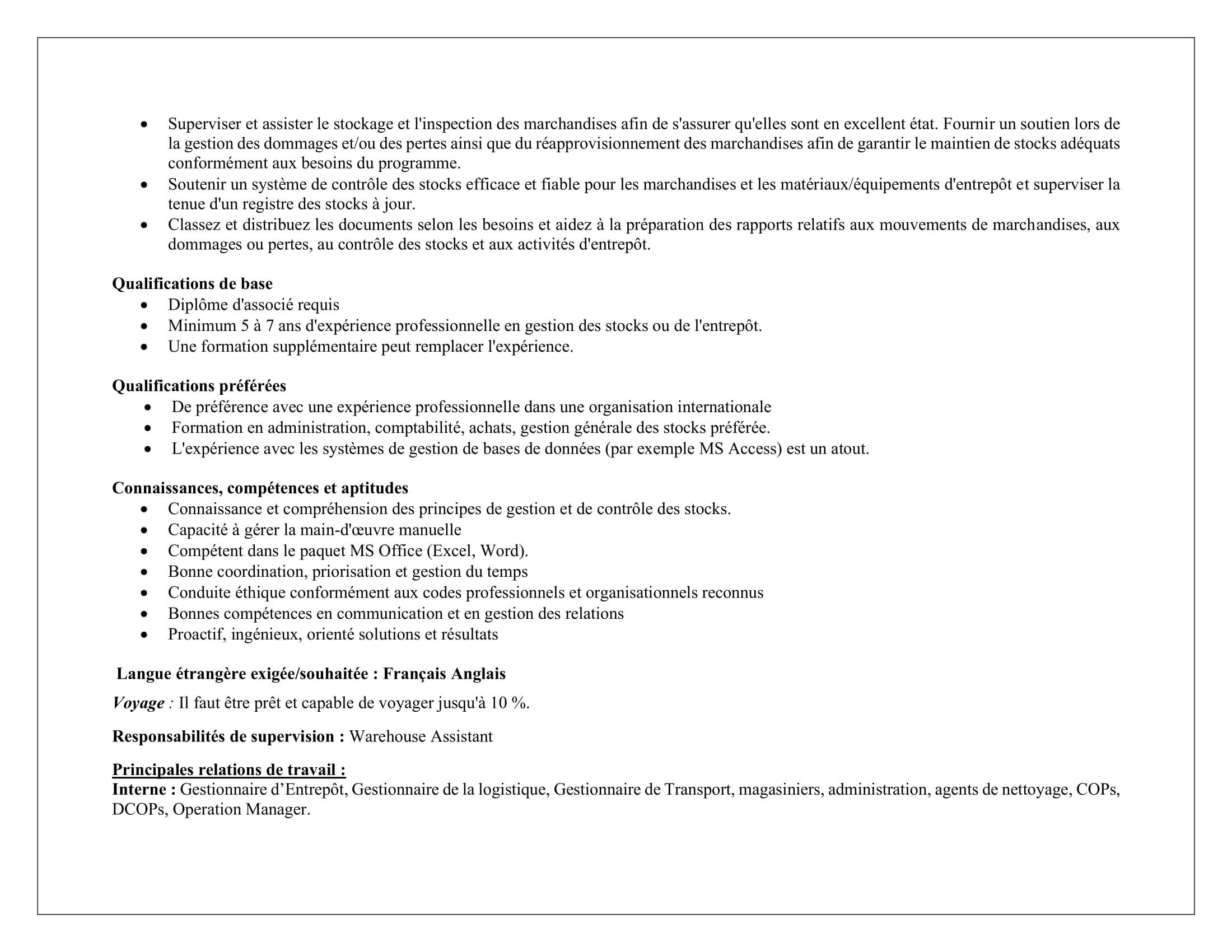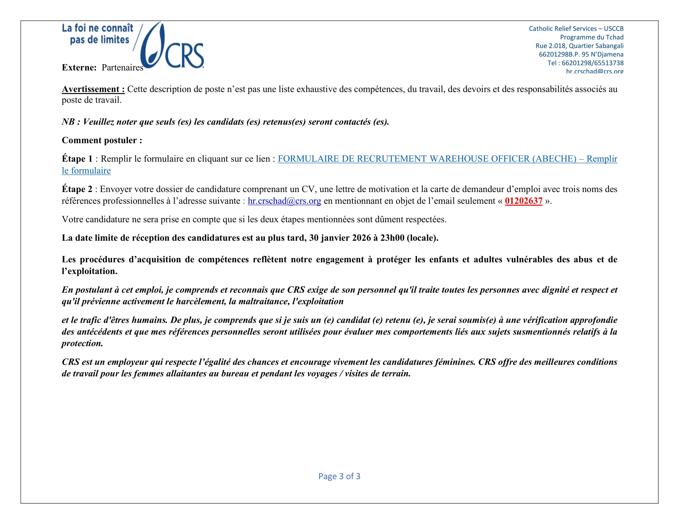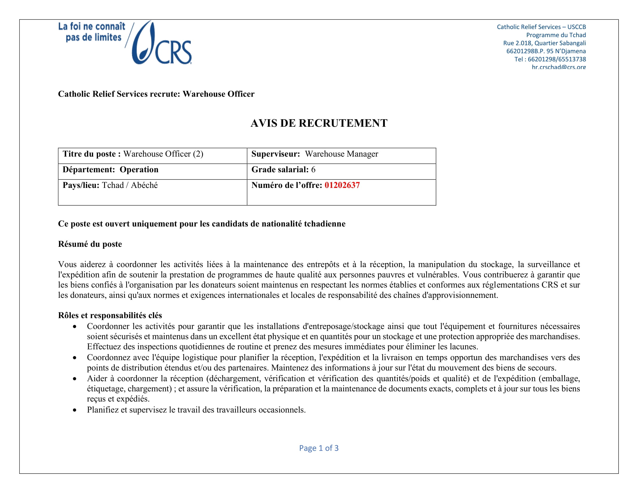 Accueil » Opportunités » Afrique » Tchad » Catholic Relief Services (CRS) au Tchad recherche (02) Warehouse Manager, postes basés à Abéché