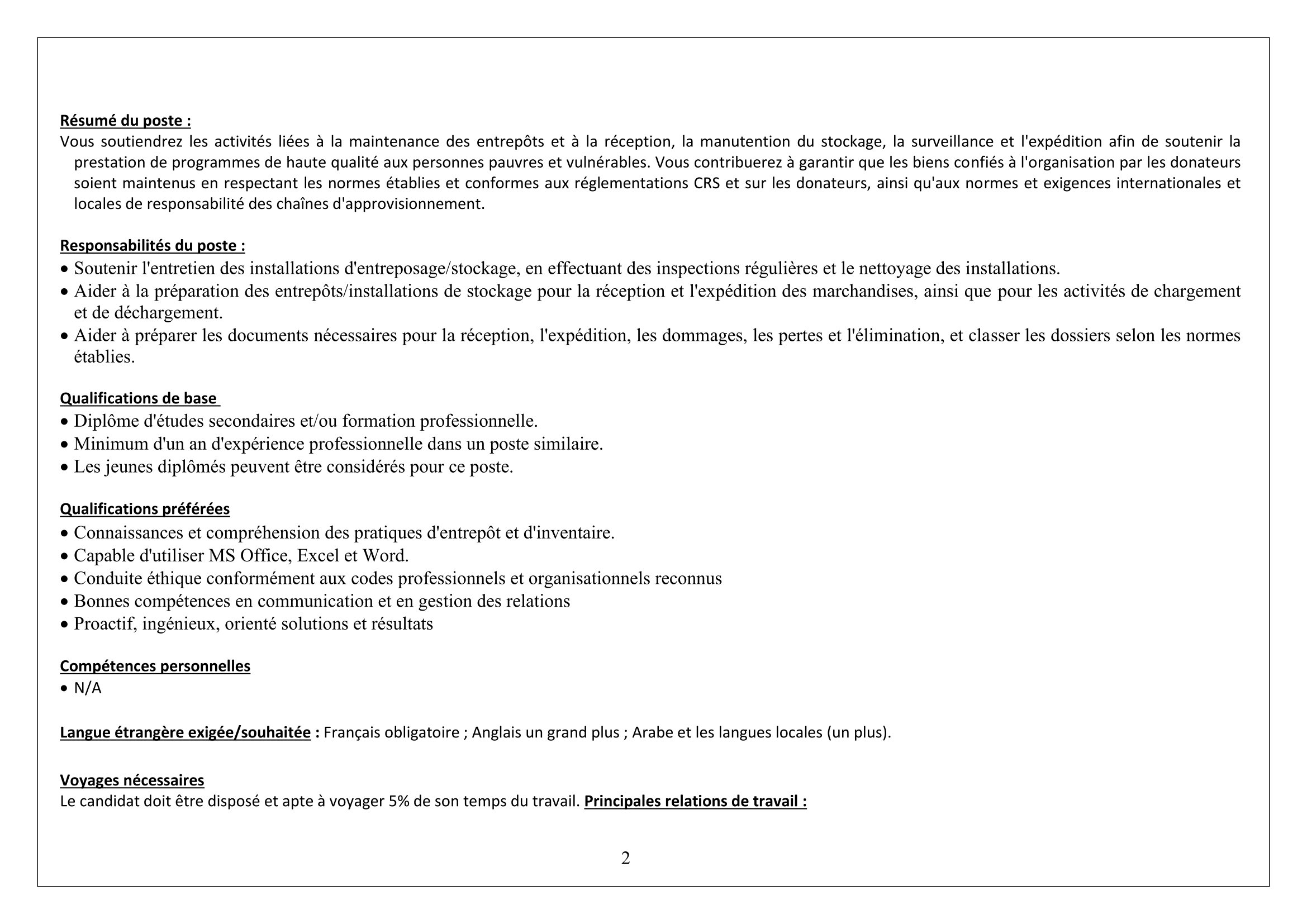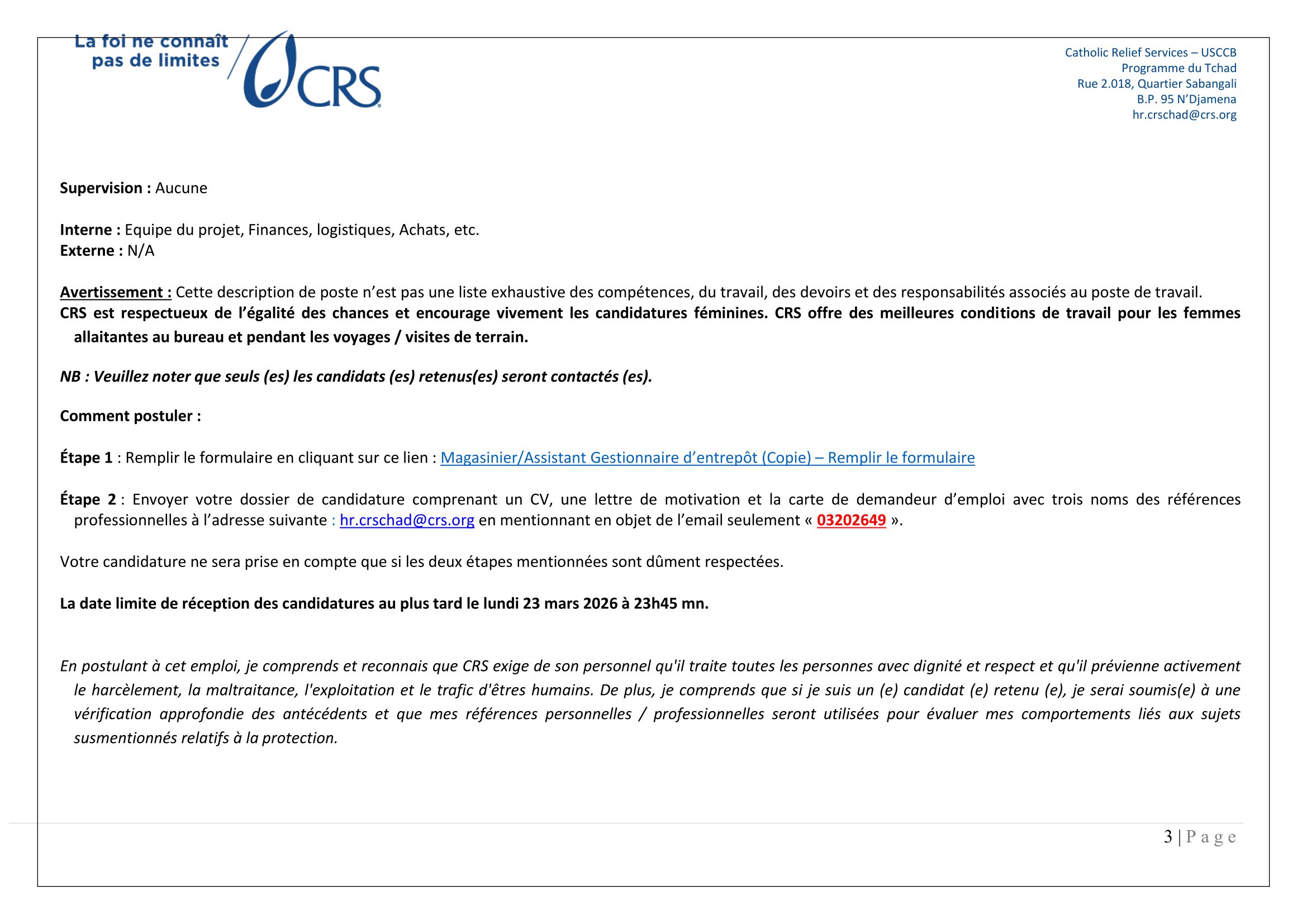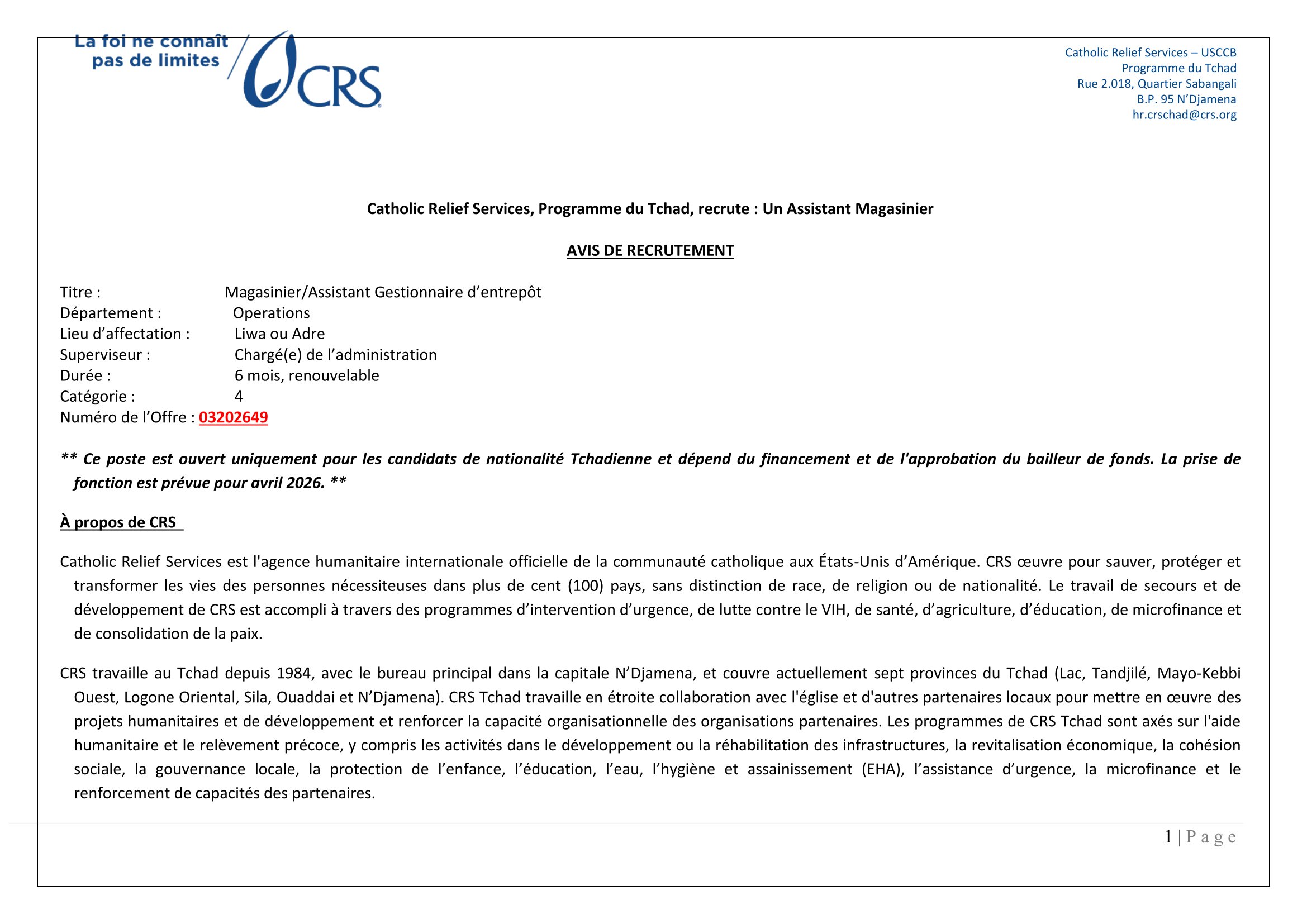 Accueil » Opportunités » Afrique » Tchad » Catholic Relief Services, programme du Tchad, lance un avis de recrutement d’un Assistant Magasinier, poste basé à Liwa ou Adré