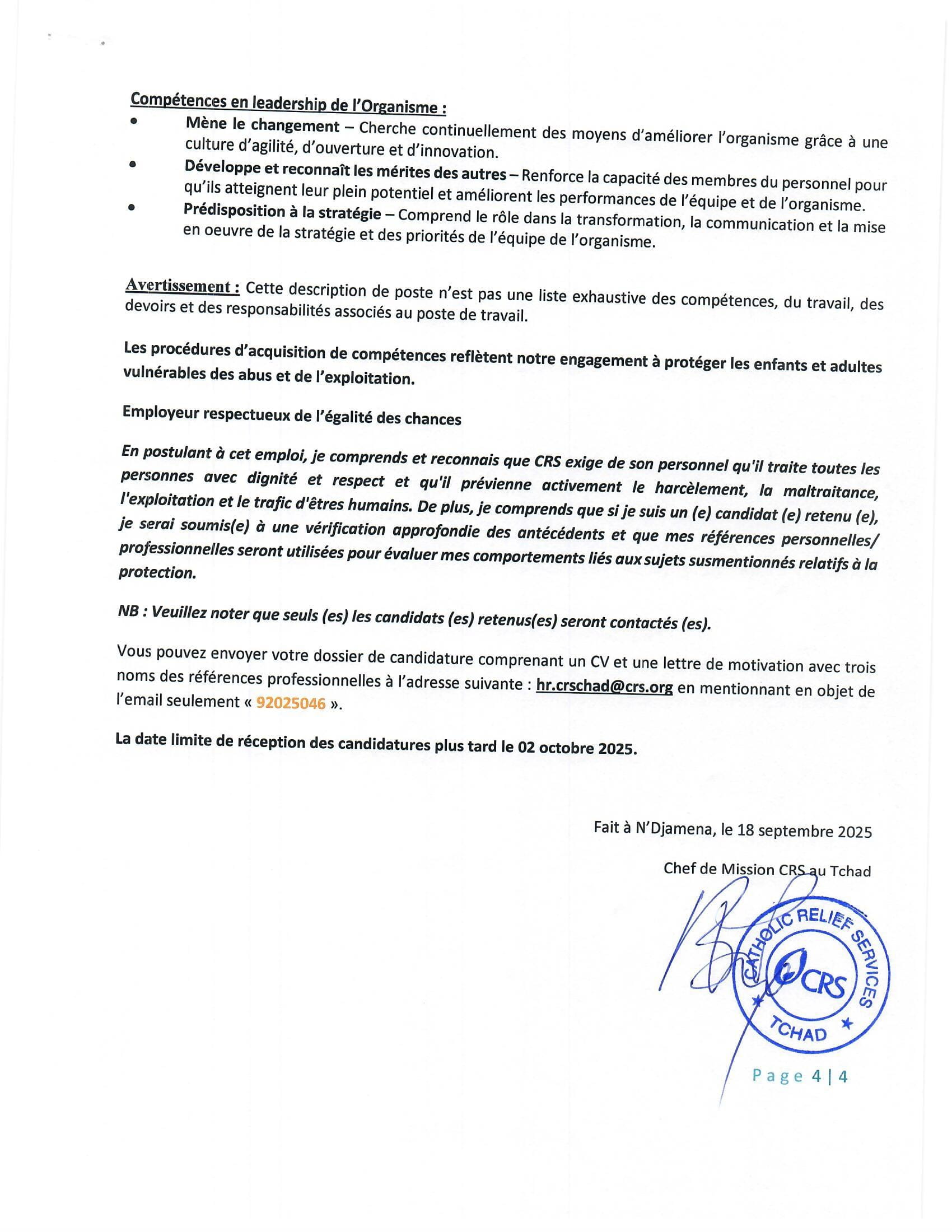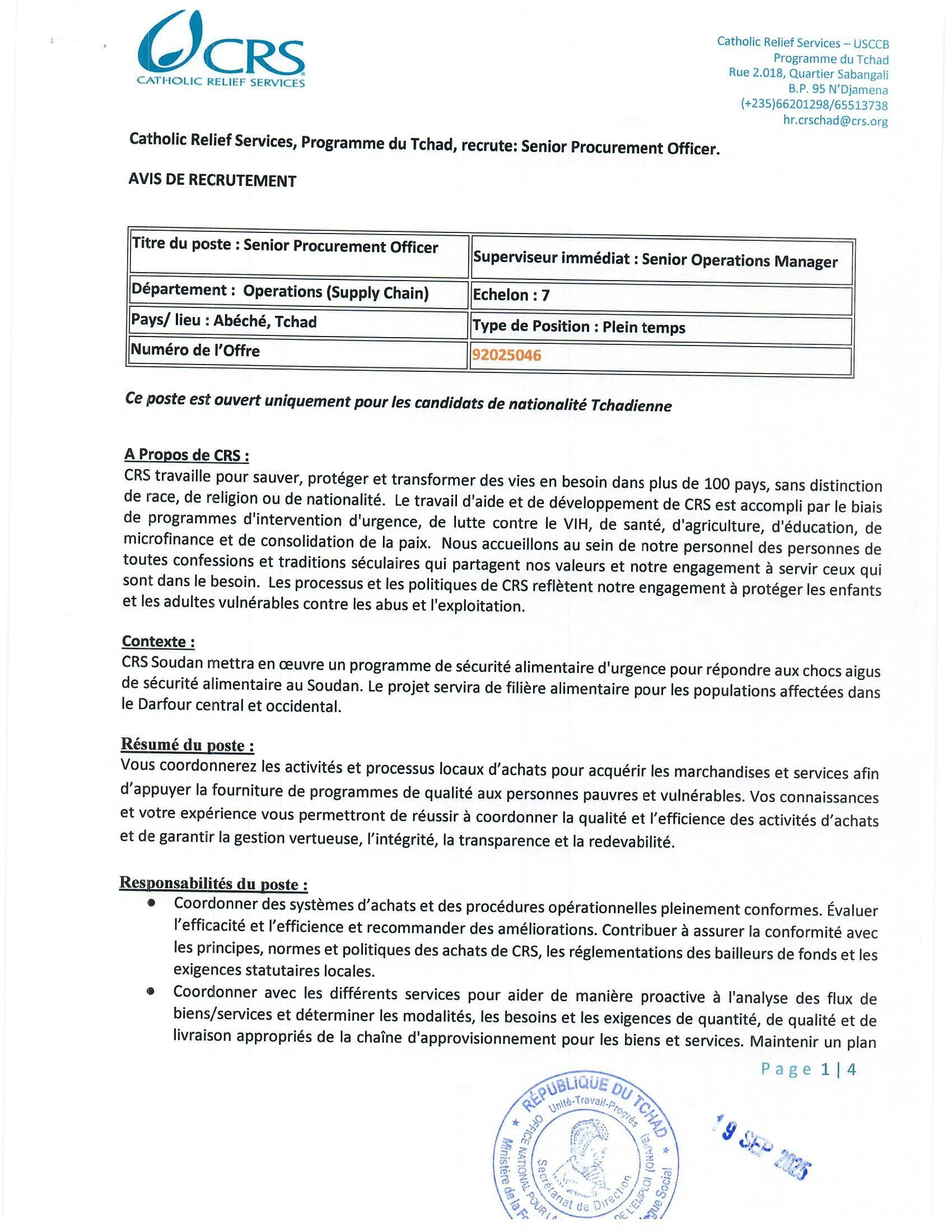 Accueil » Opportunités » Afrique » Tchad » Catholic Relief Services recrute un Senior Procurement Officer (H/F) à Abéché, Tchad