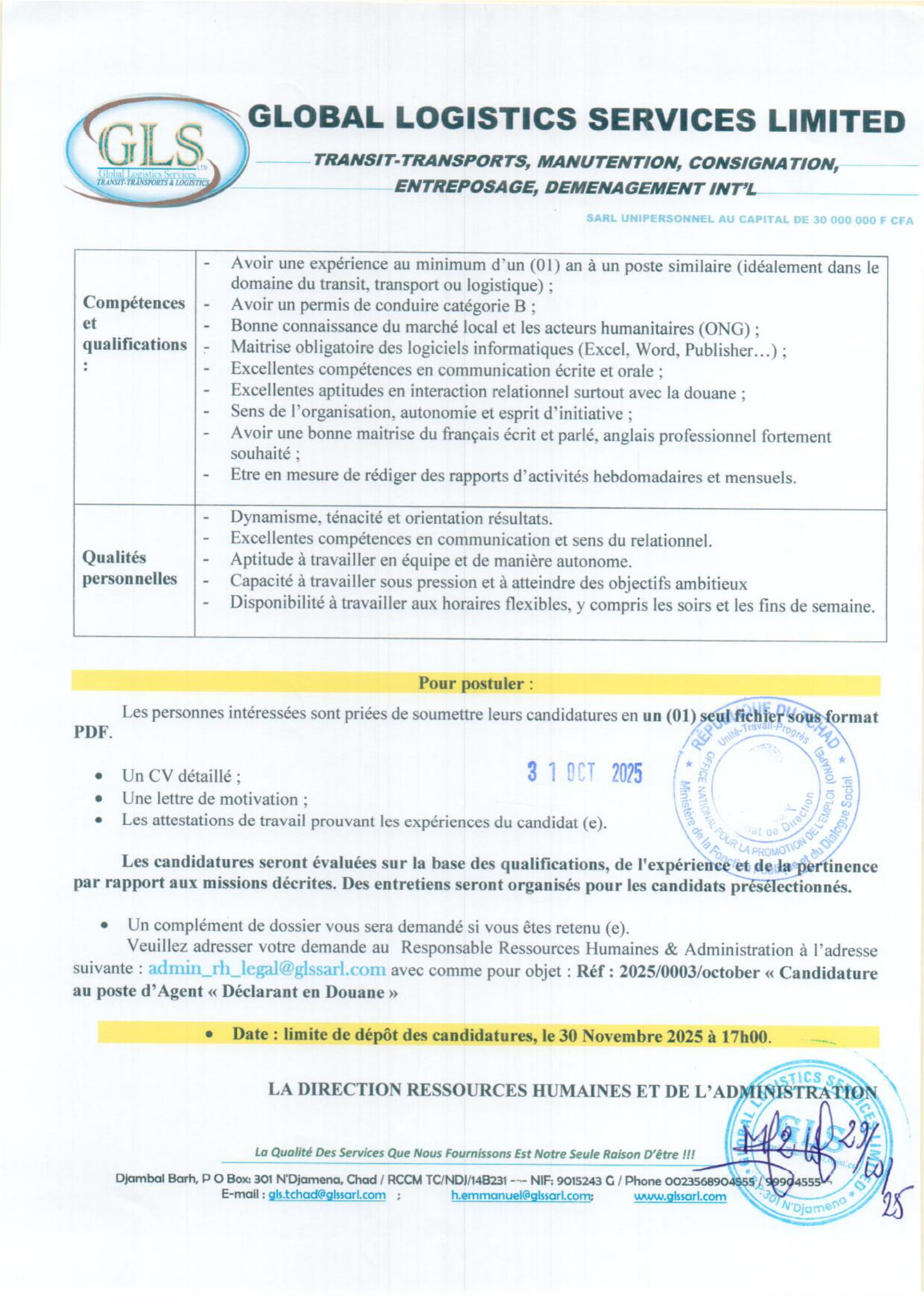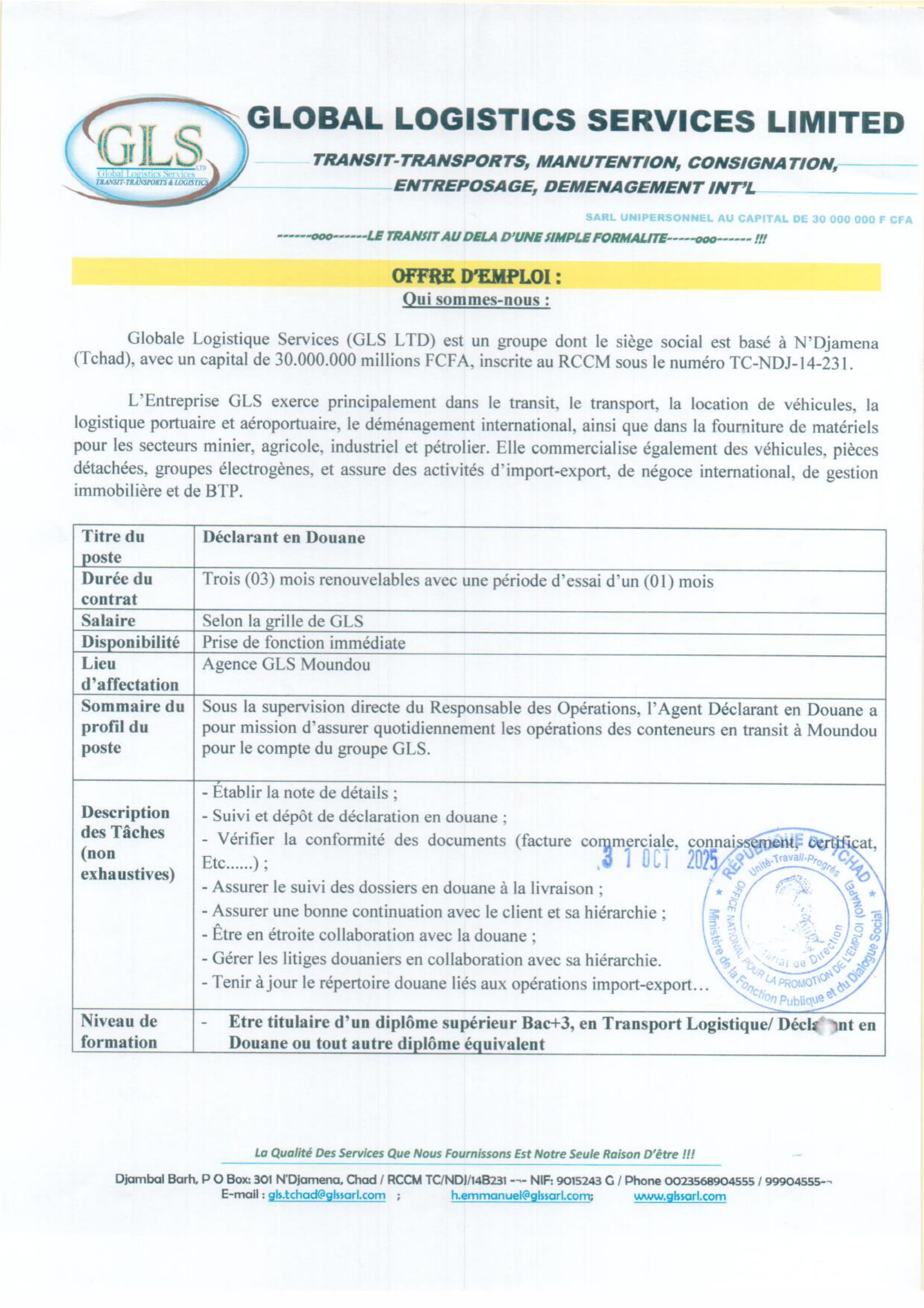 Accueil » Opportunités » Afrique » Tchad » Global Logistics Services Limited (GLS) recrute à Moundou un Déclarant en Douane (H/F), Tchad
