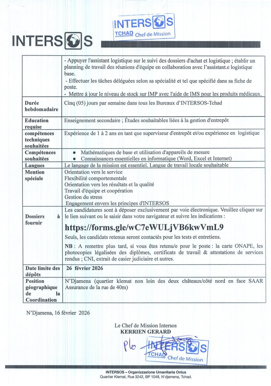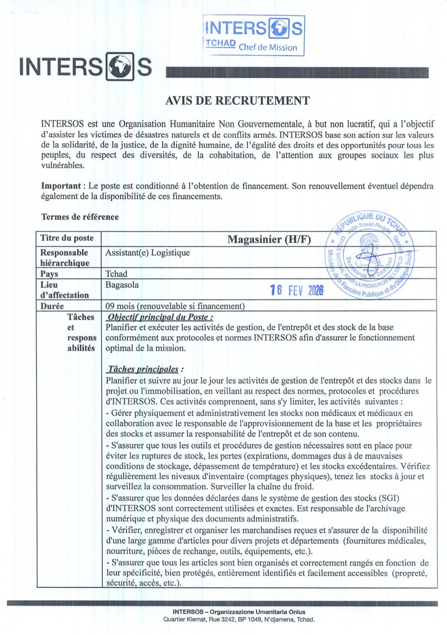 Accueil » Opportunités » Afrique » Tchad » INTERSOS recherche un(e) Assistant(e) Logistique basé(e) à Bagasola, Tchad