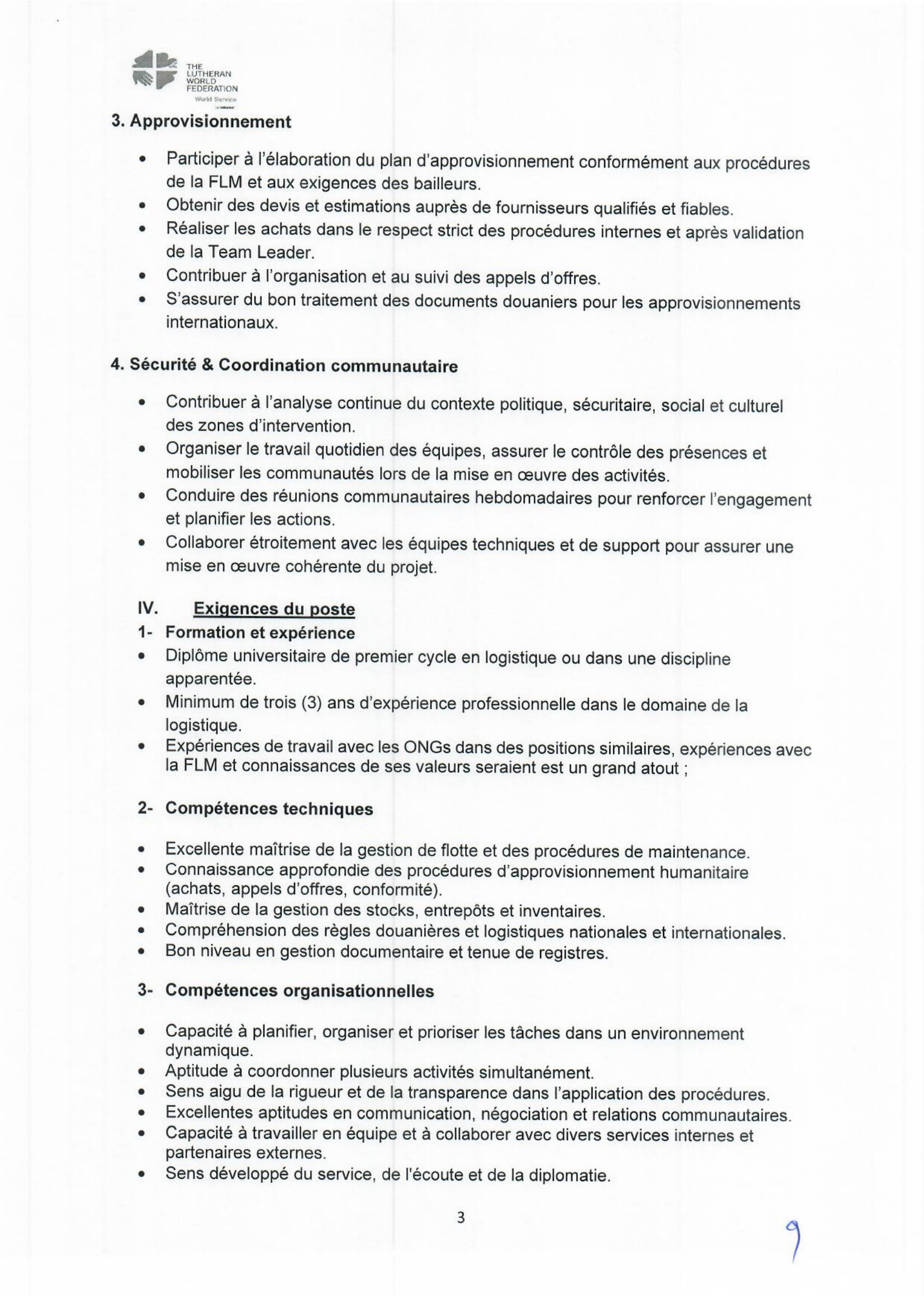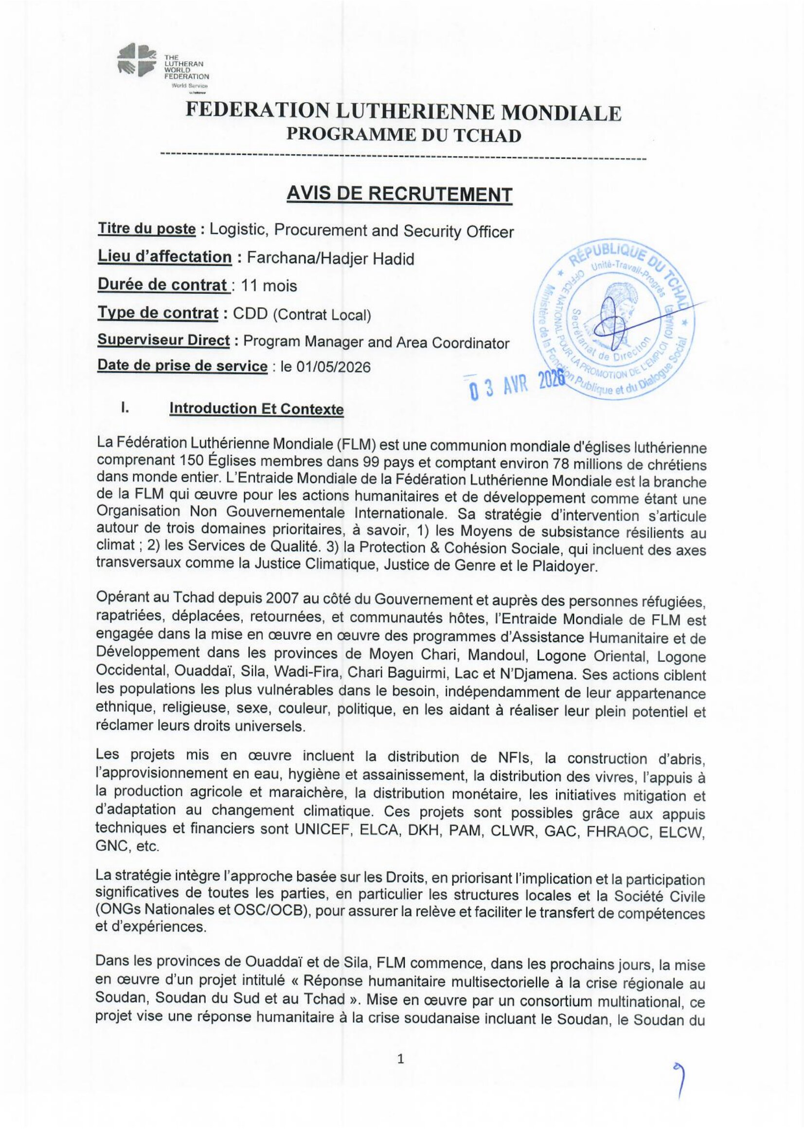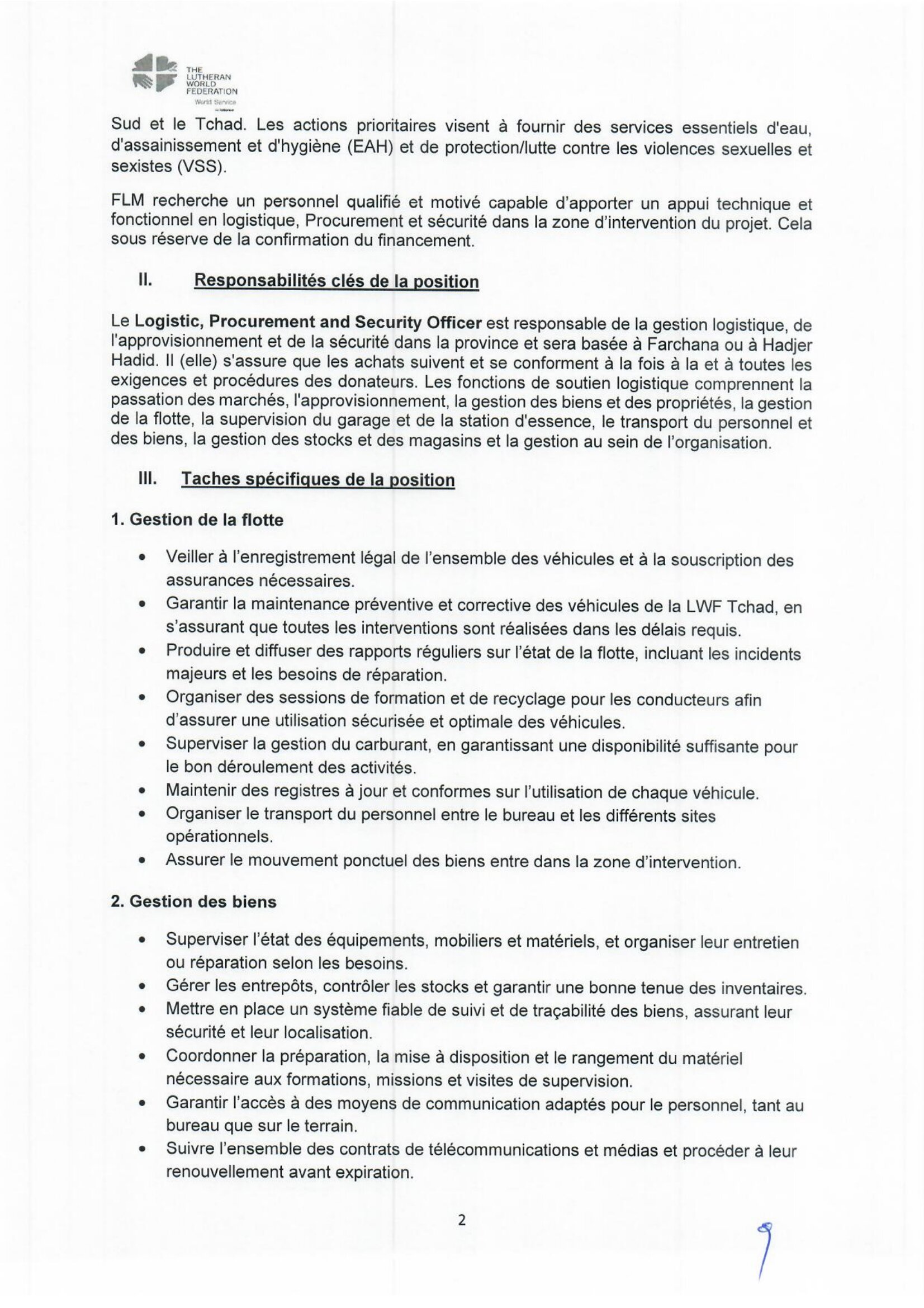 La Fédération Luthérienne Mondiale (FLM) au Tchad recrute un(e) Responsable de la logistique, des achats et de la sécurité, poste basé à Farchana/Hadjer-Hadid