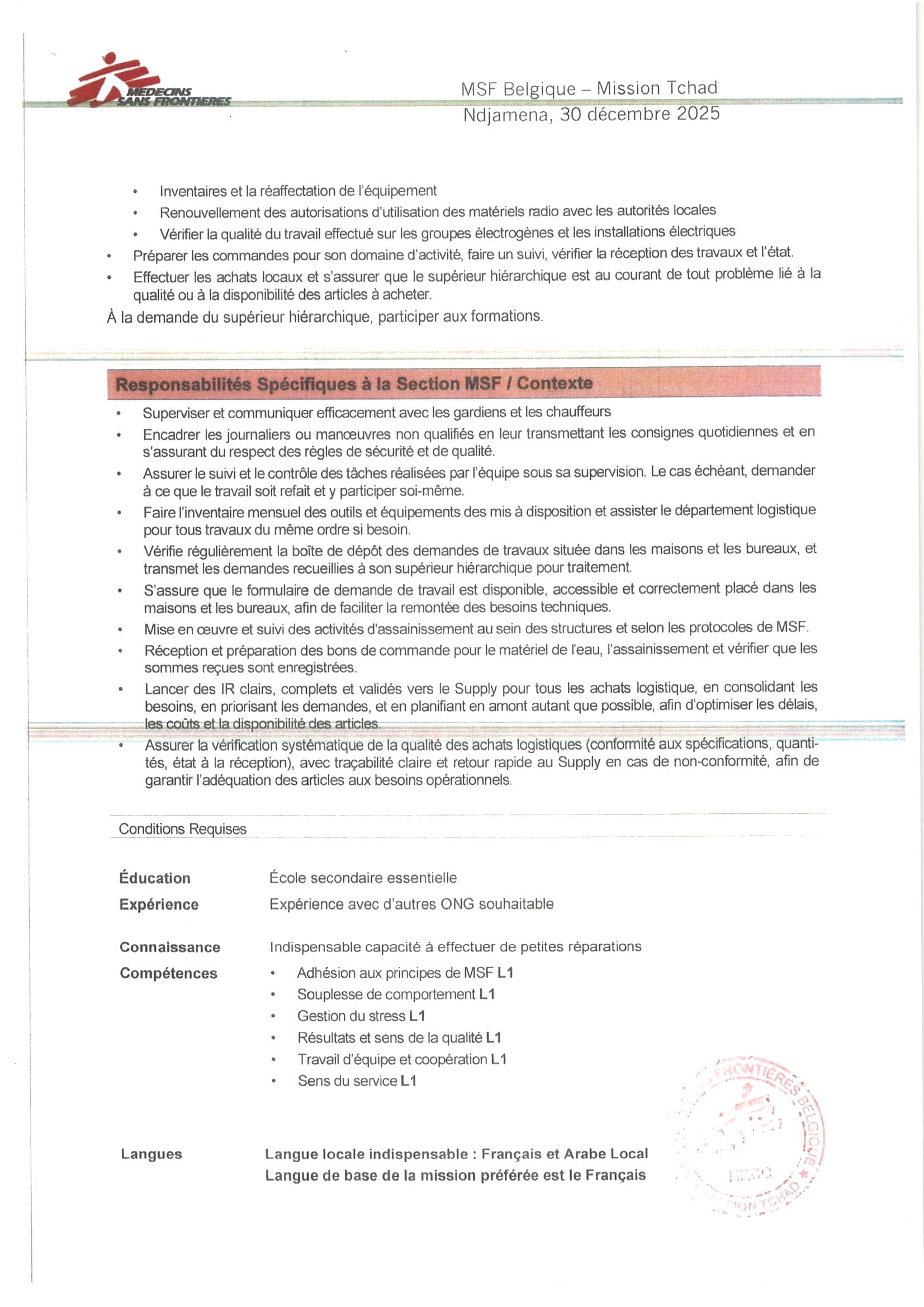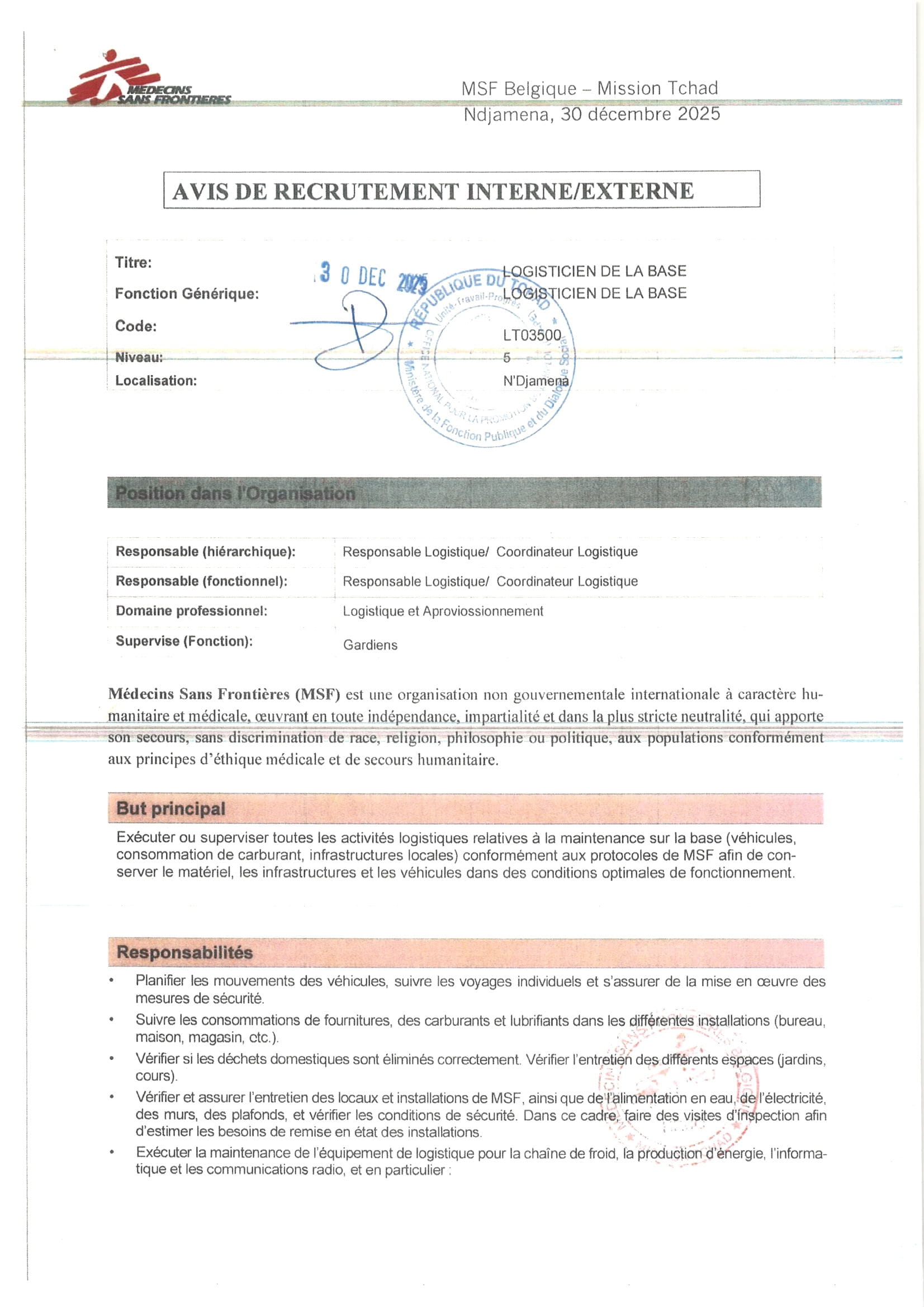 Accueil » Opportunités » Afrique » Tchad » Médecins Sans Frontières (MSF) au Tchad recherche un(e) Logisticien(ne) de Base, poste basé à N’Djamena