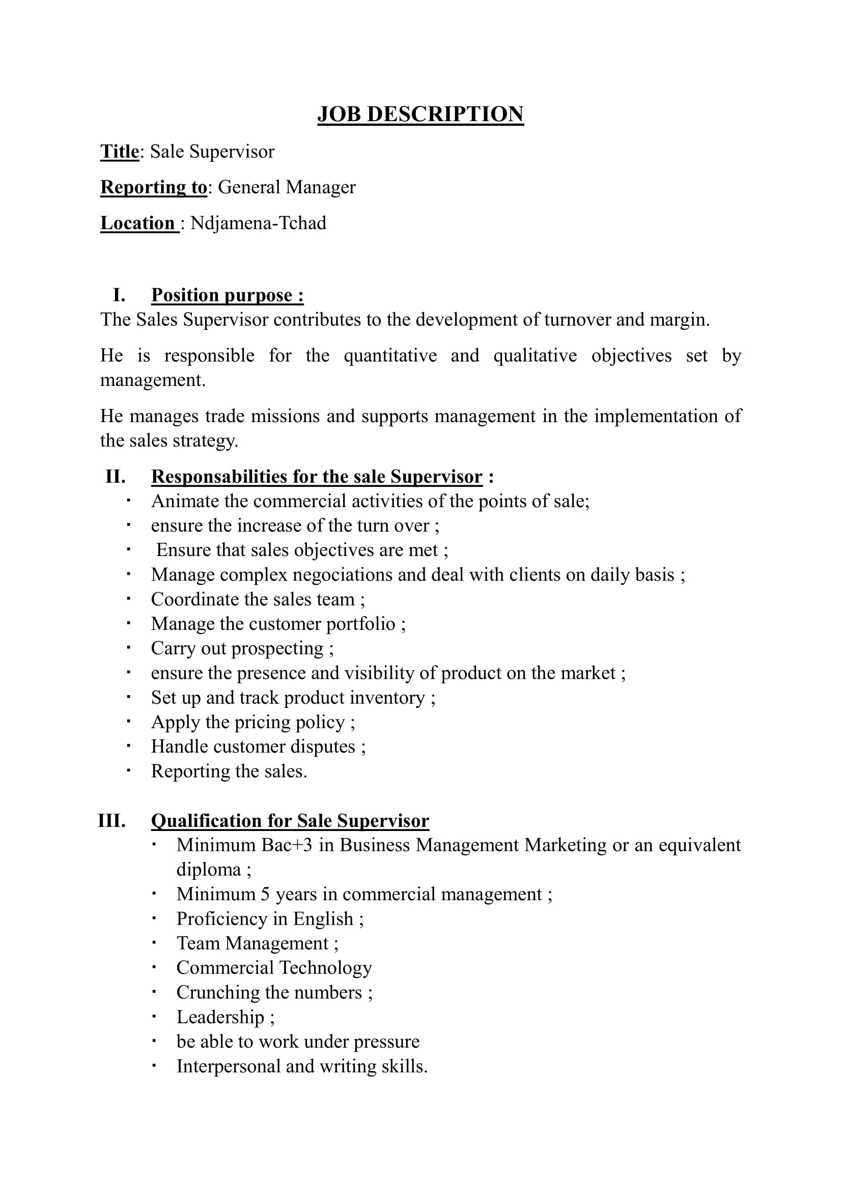 Accueil » Opportunités » Afrique » Tchad » A company based in N’Djamena is recruiting a Sale Supervisor, Chad