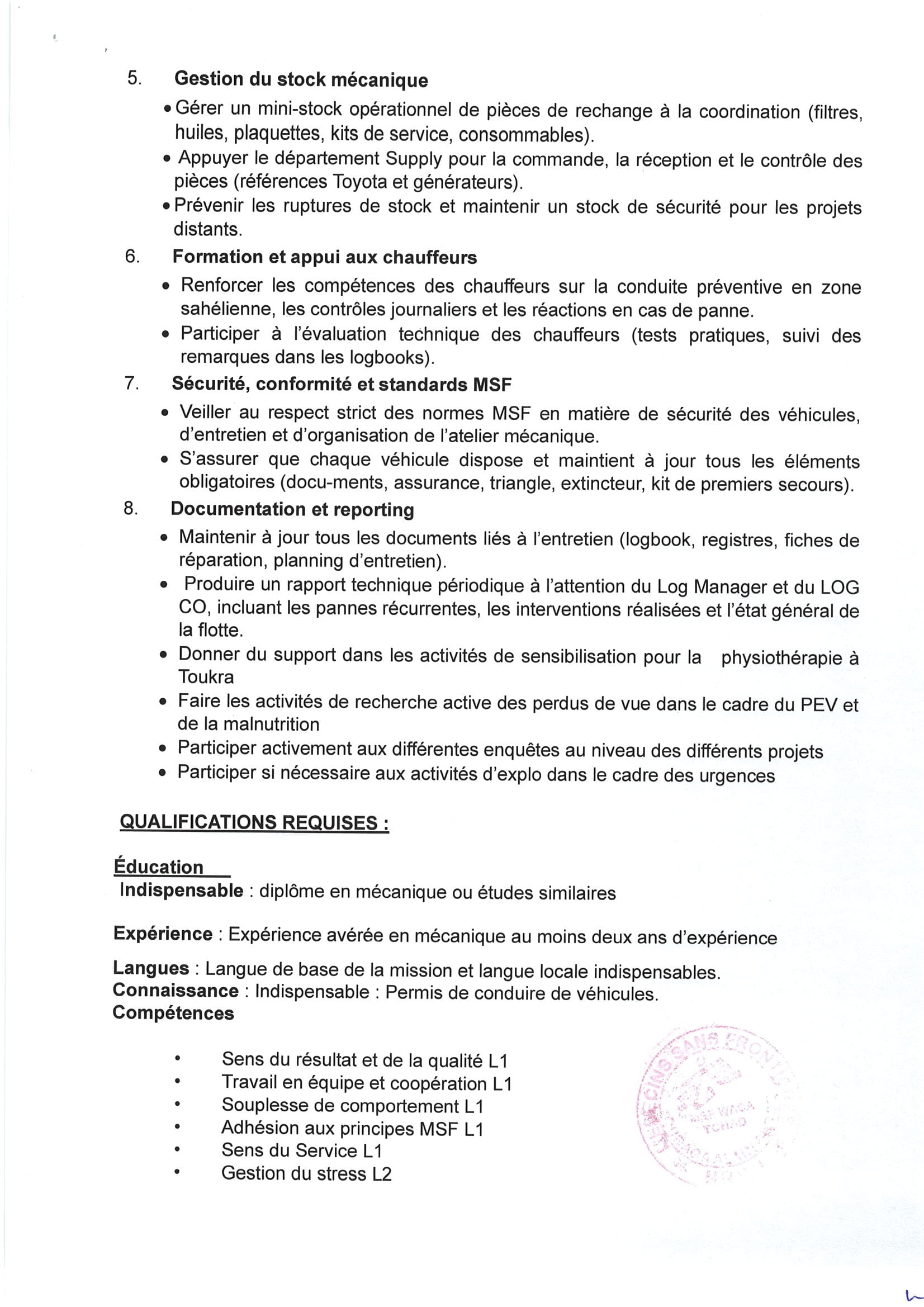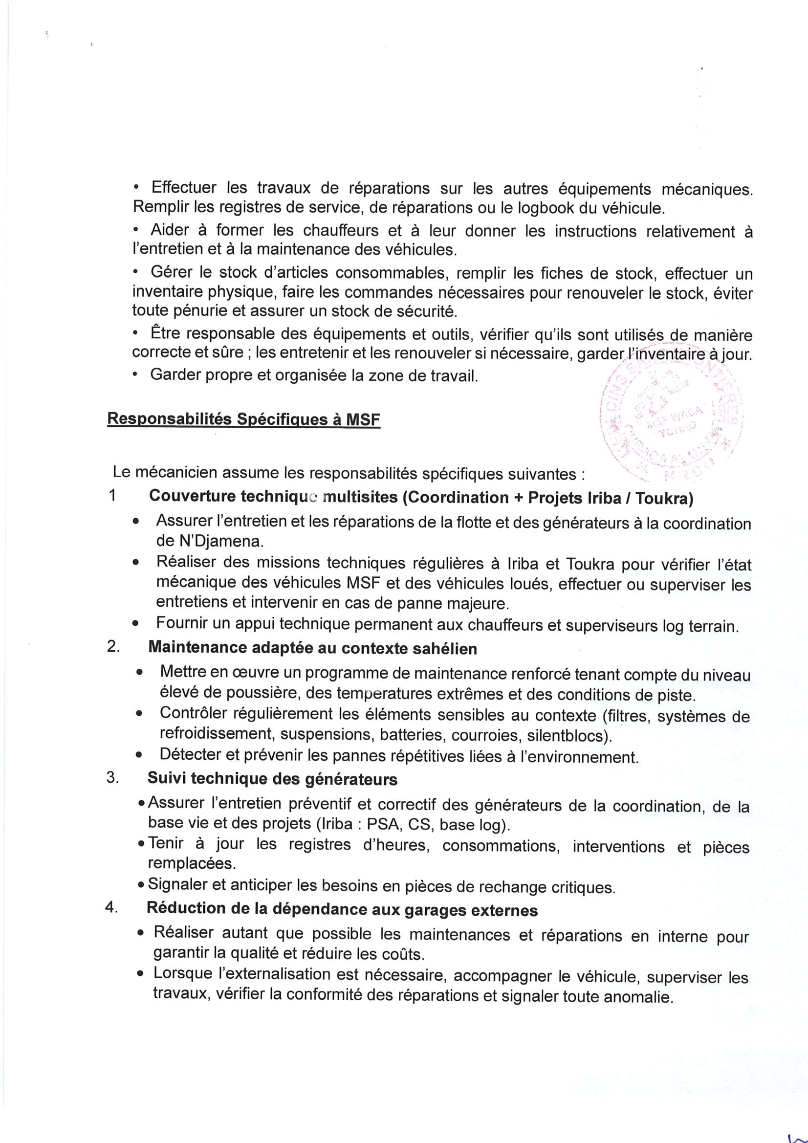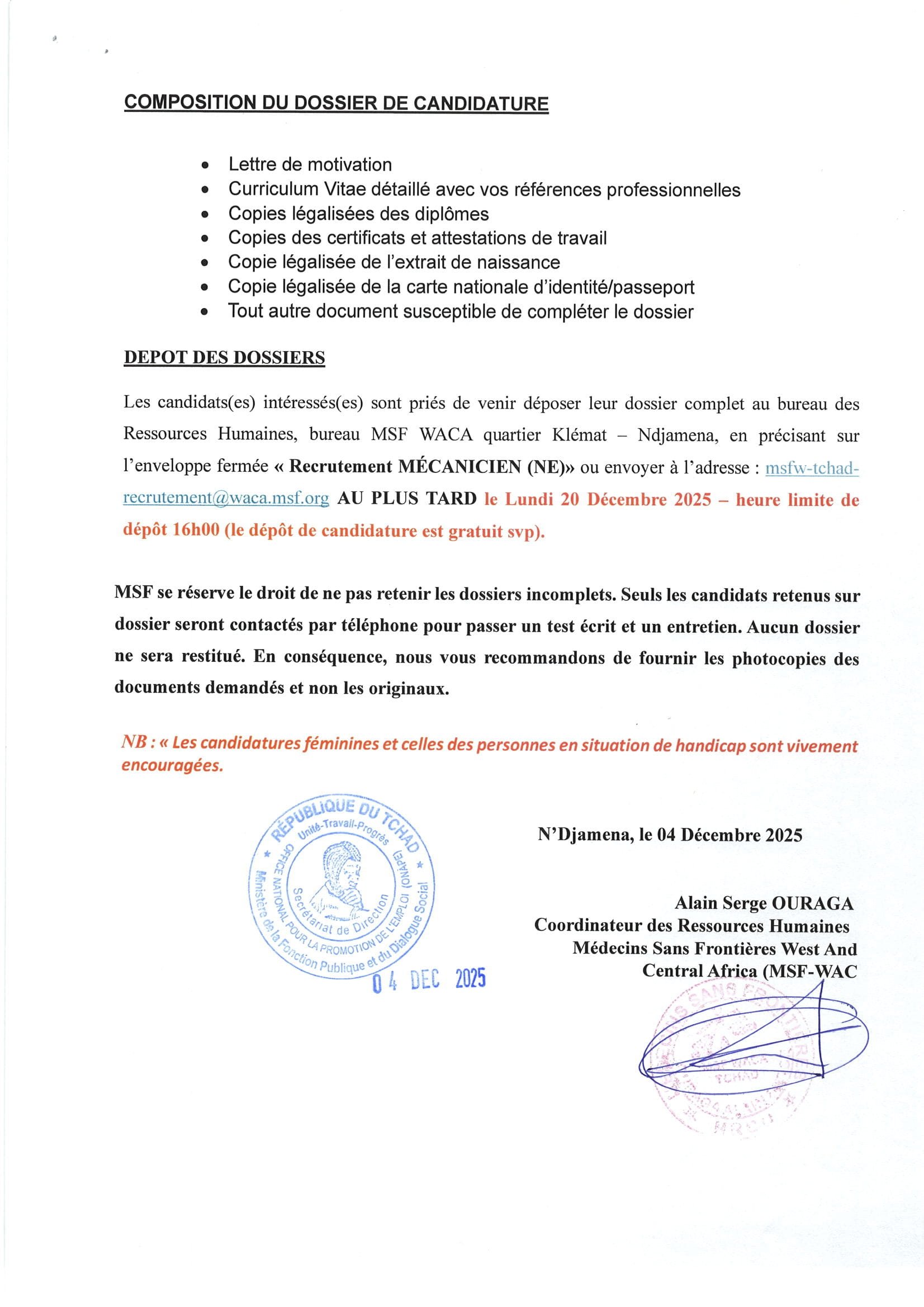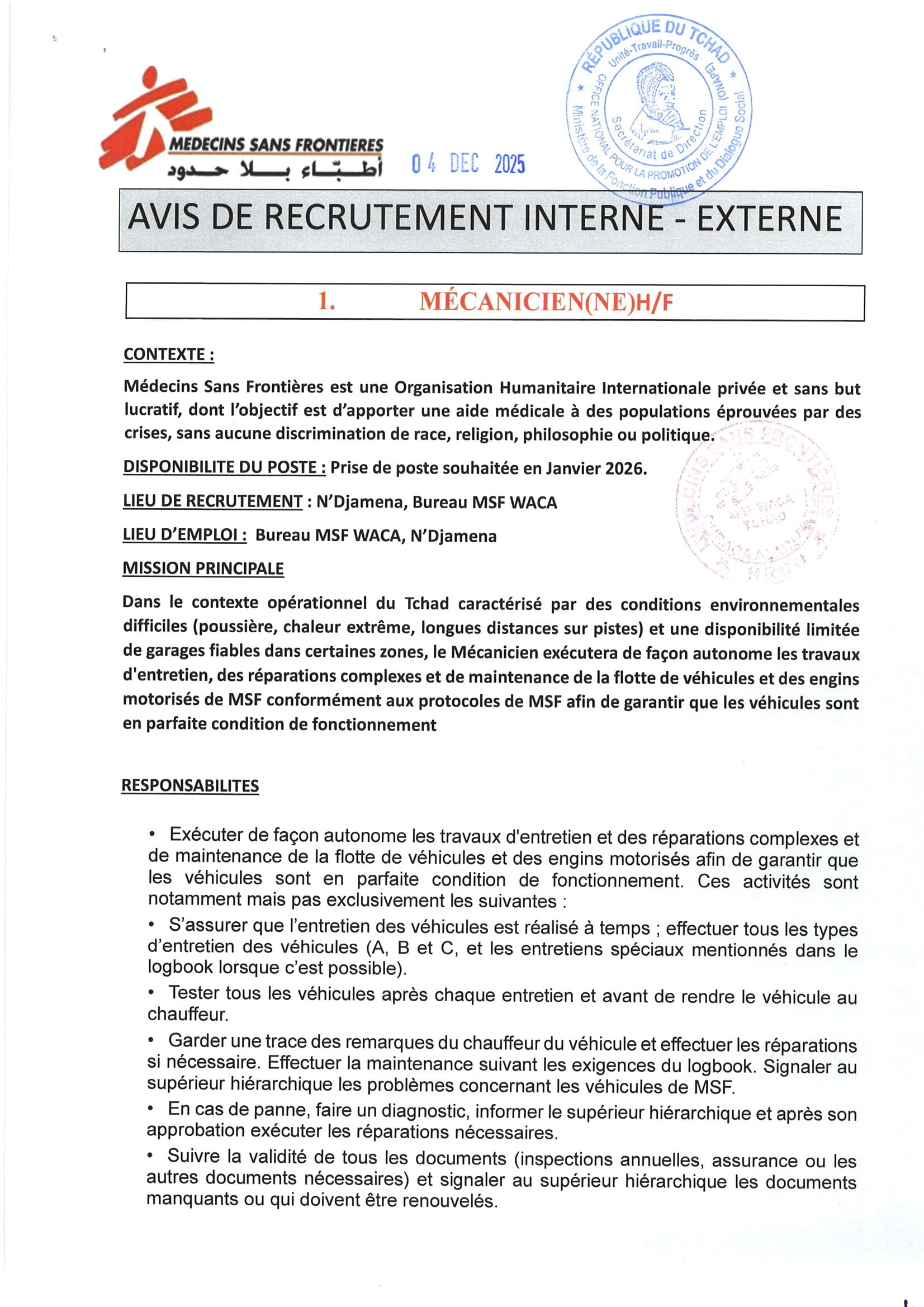 Accueil » Opportunités » Afrique » Tchad » Médecins Sans Frontières (MSF) recrute au Tchad un(e) Mécanicien(ne), poste basé à N’Djamena