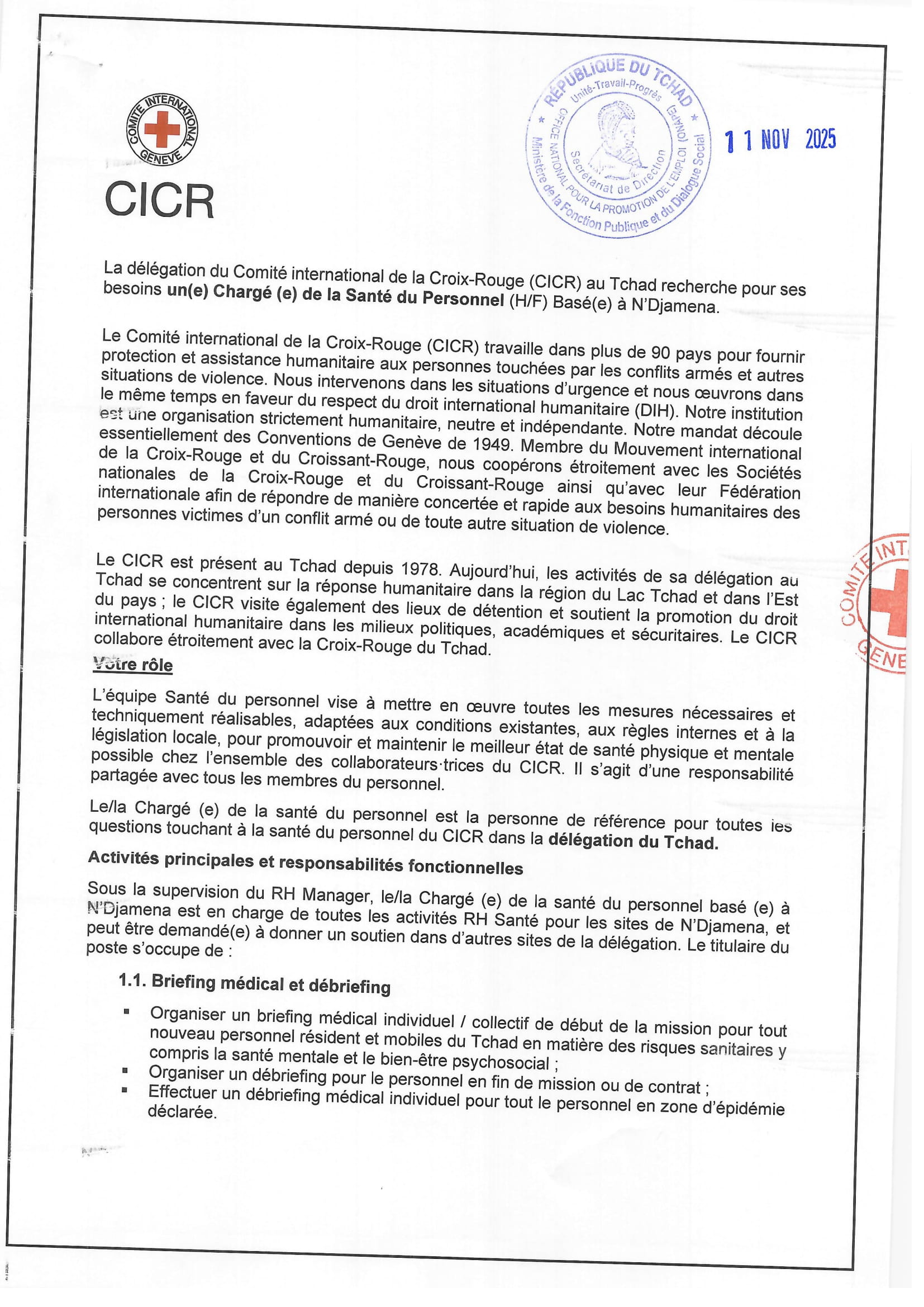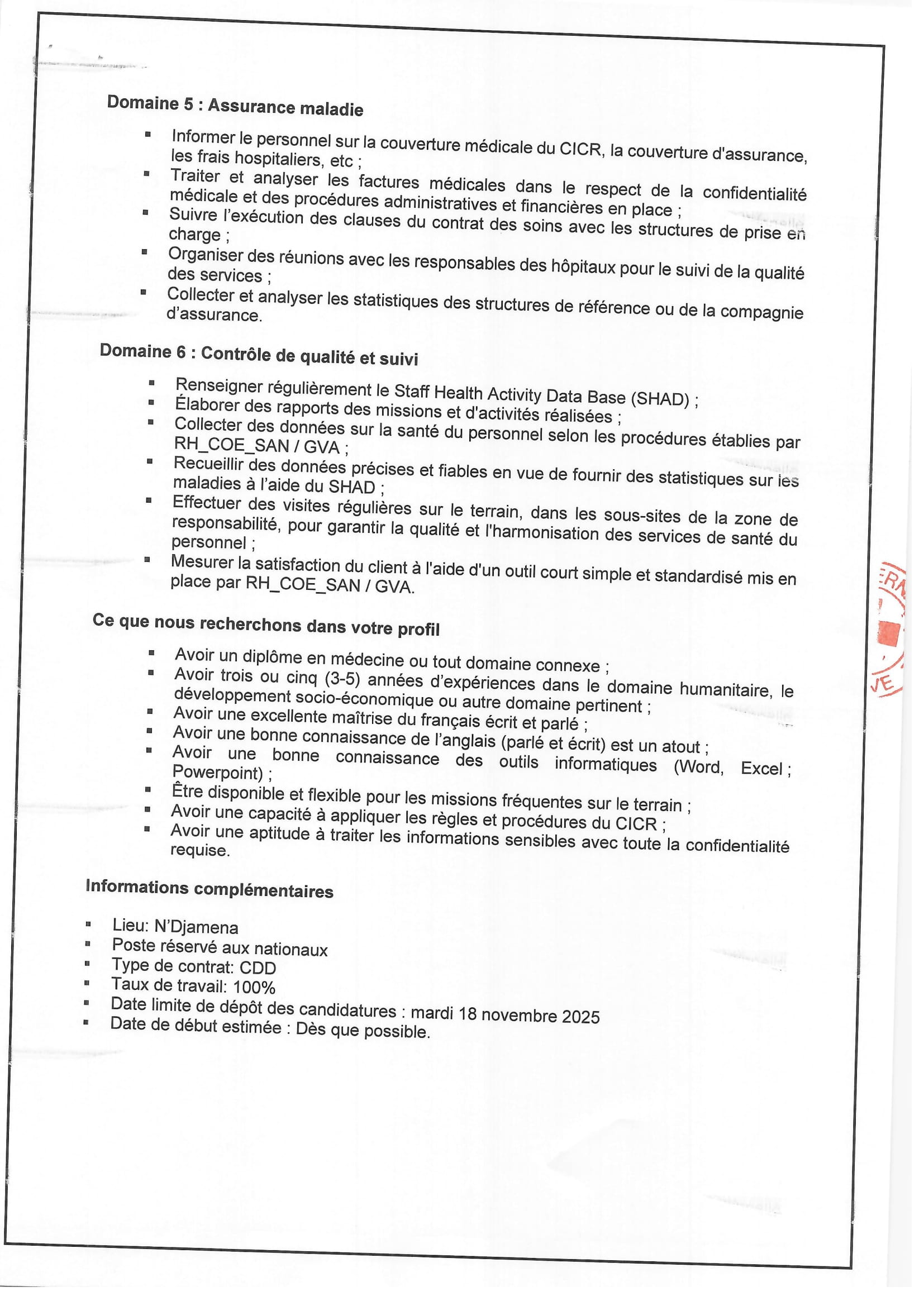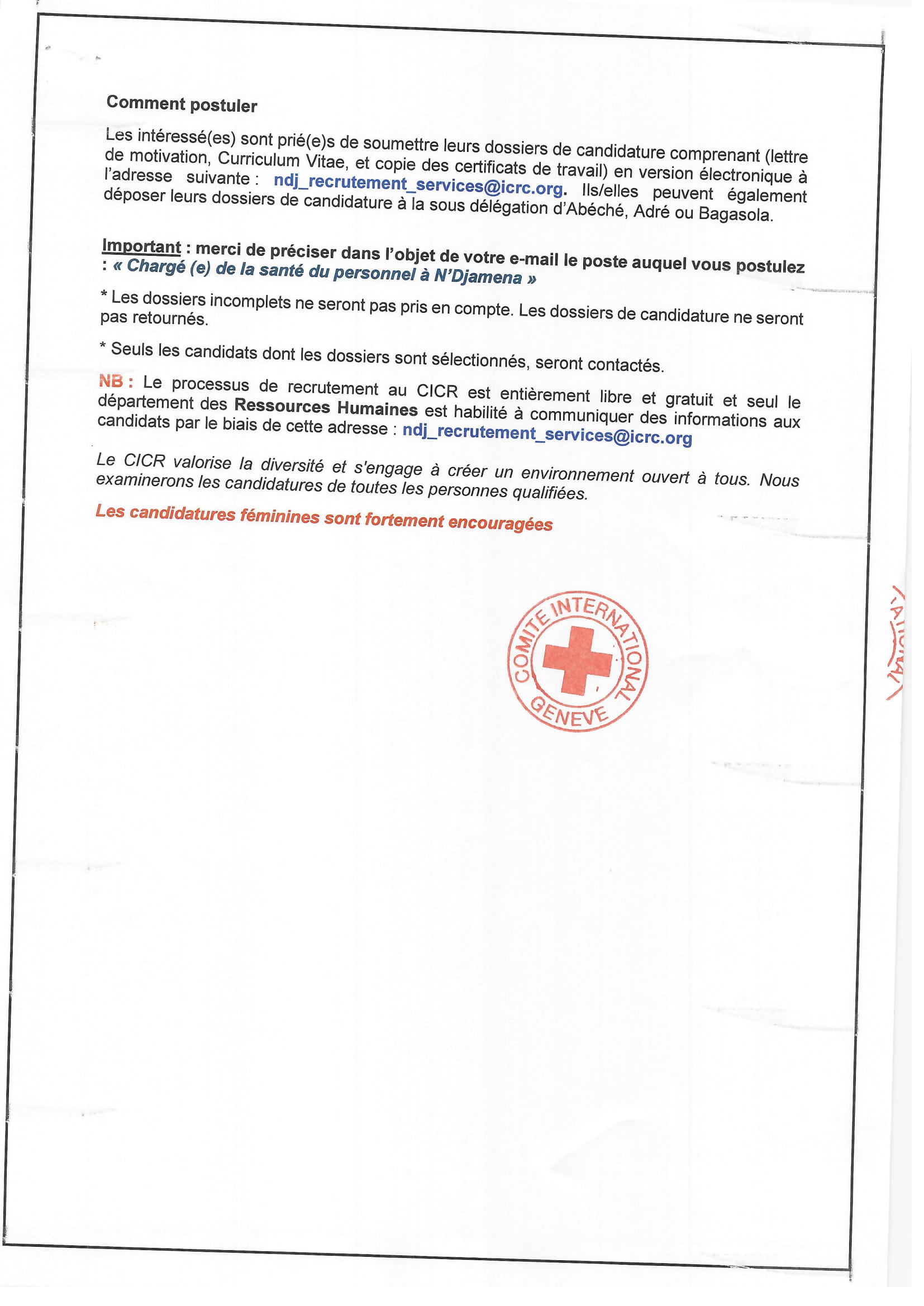 Accueil » Opportunités » Afrique » Tchad » Le Comité International de la Croix-Rouge (CICR) recrute un(e) Chargé(e) de la santé du personnel basé(e) à N’Djamena, Tchad