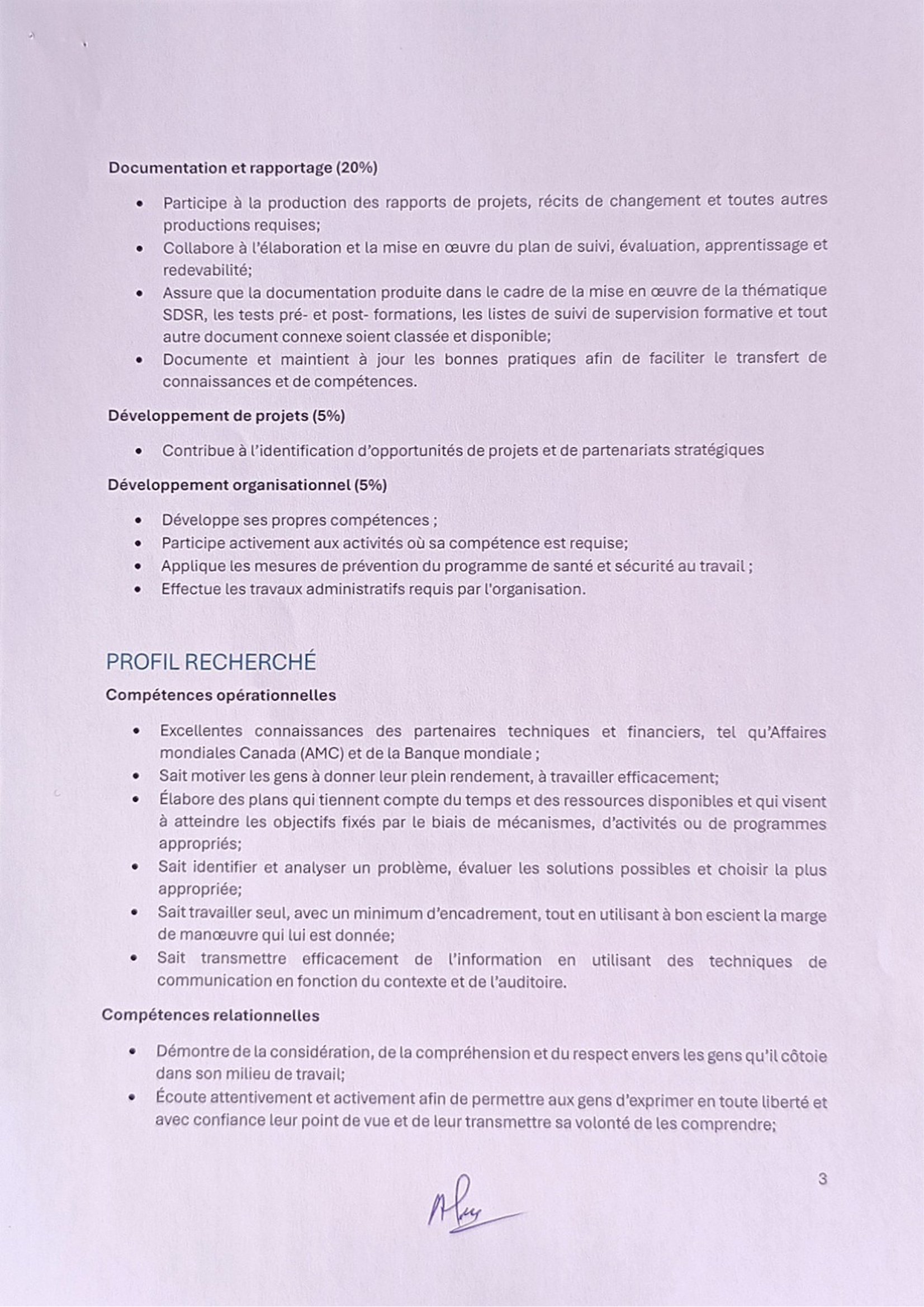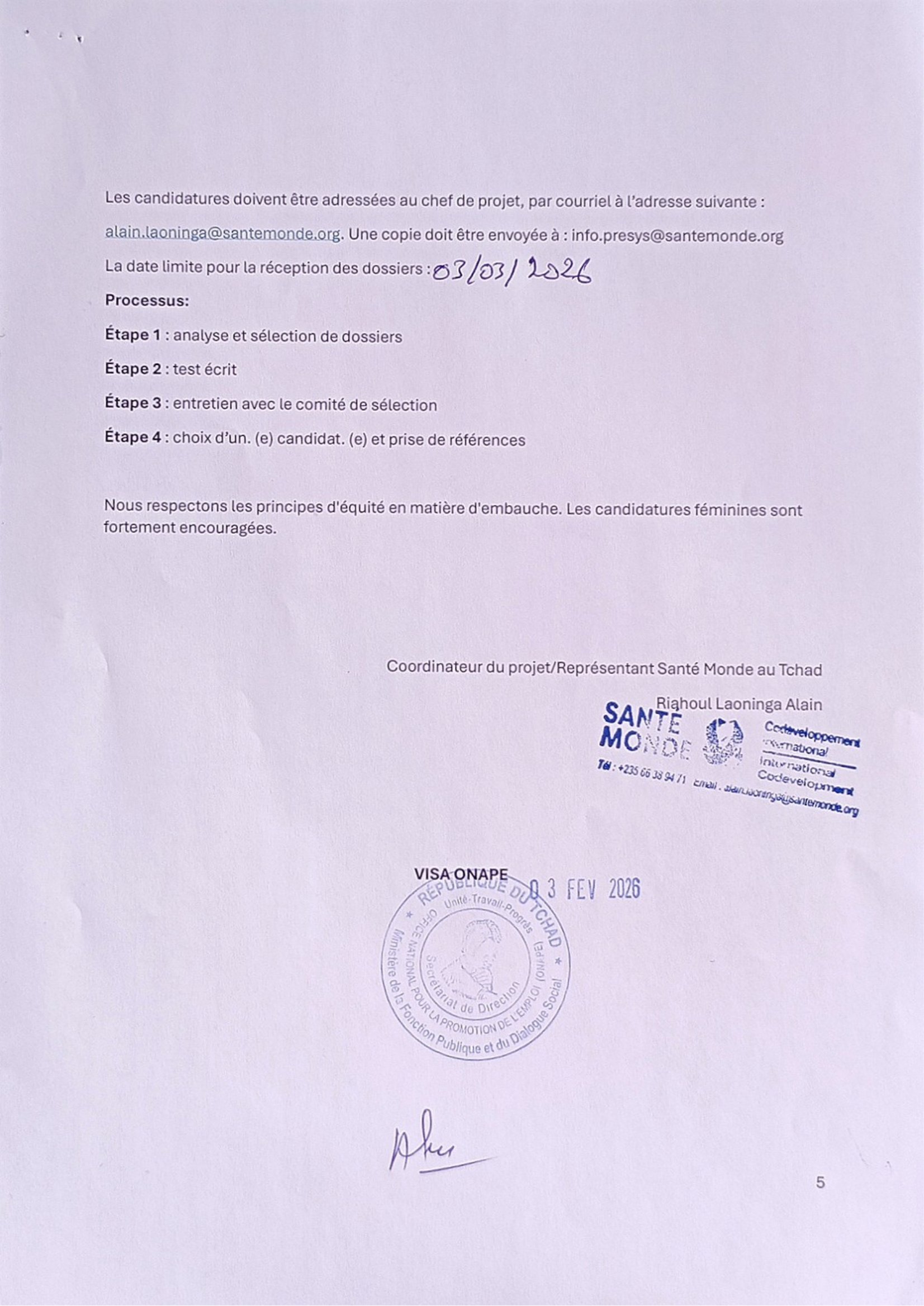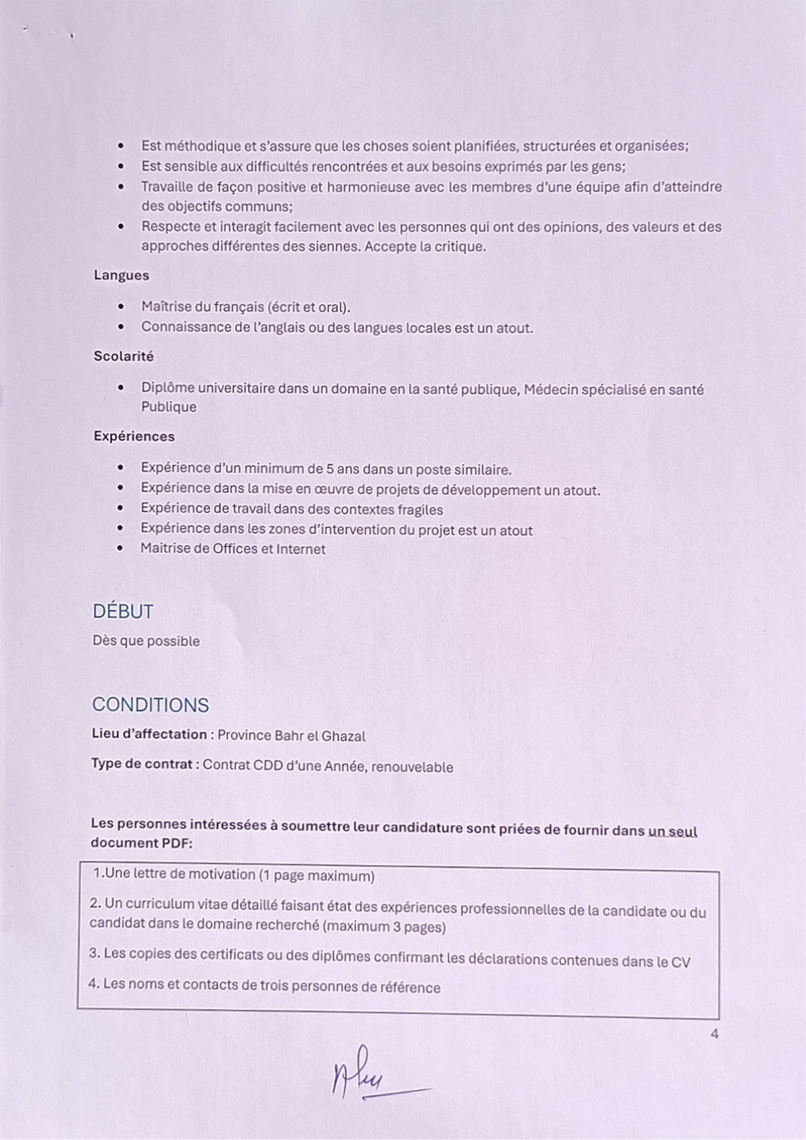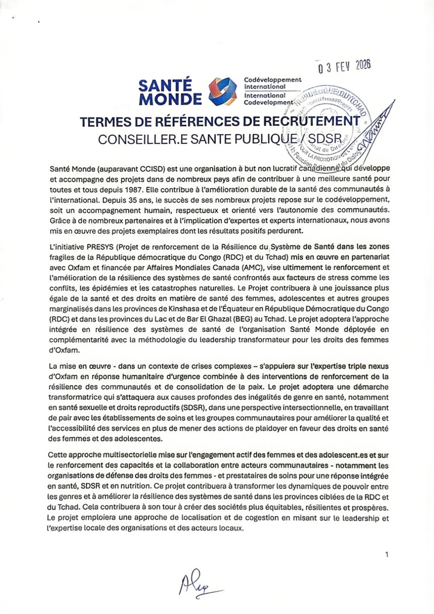 Santé Monde lance un avis de recrutement d’un(e) Conseiller(ère) en Santé Publique basé(e) dans la province du Bar El Ghazal, au Tchad