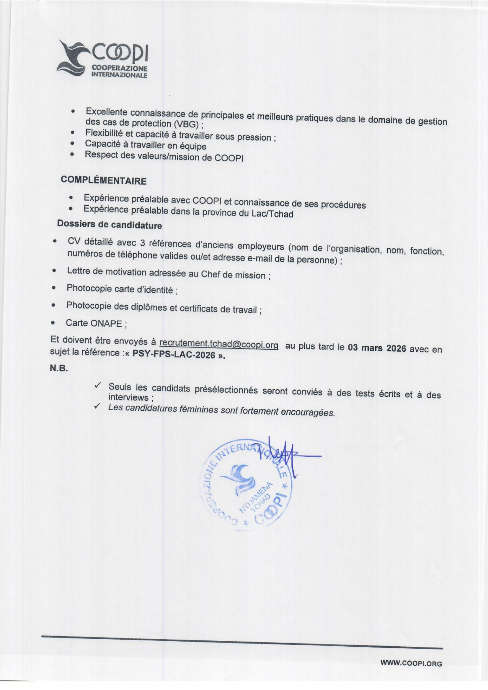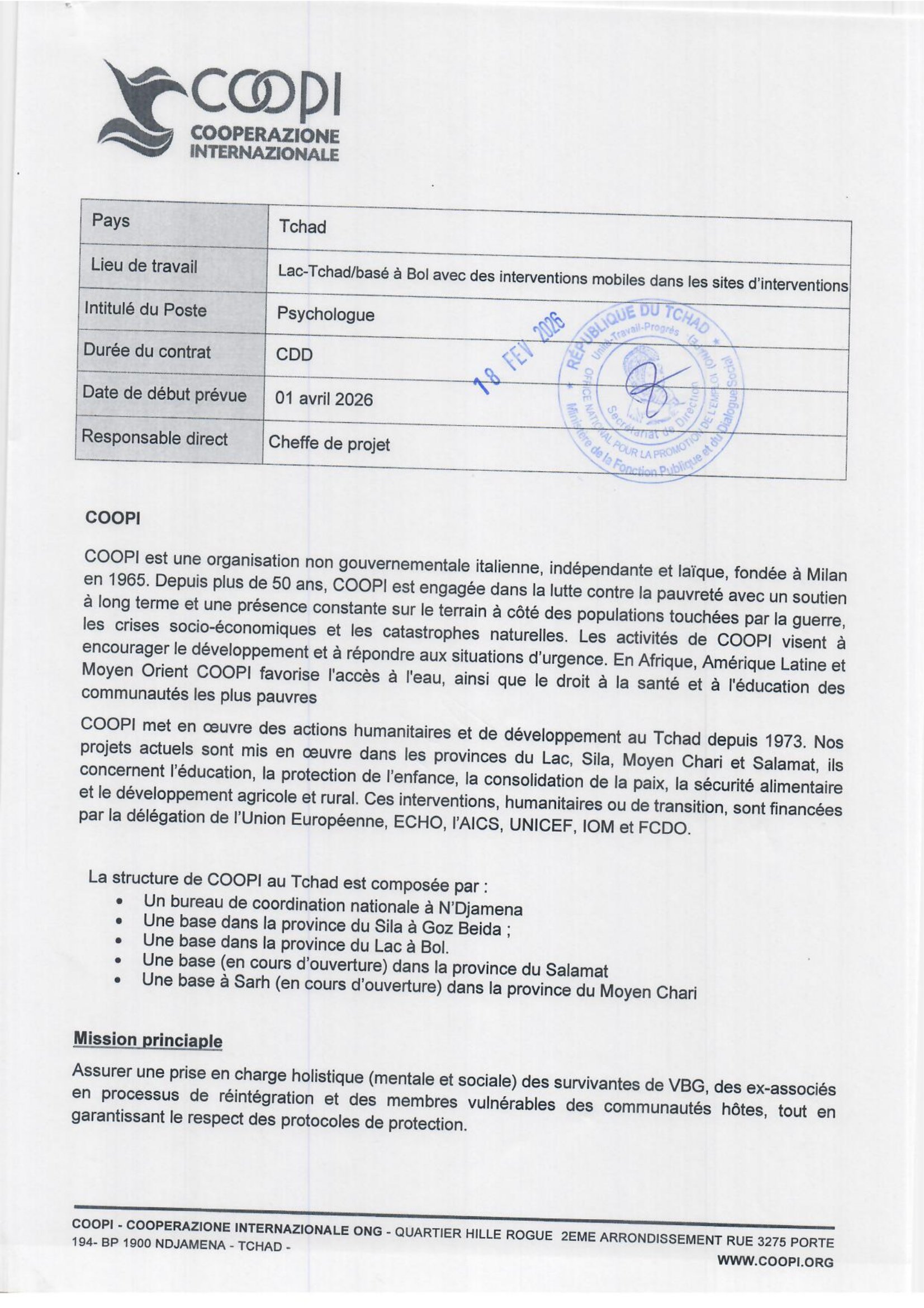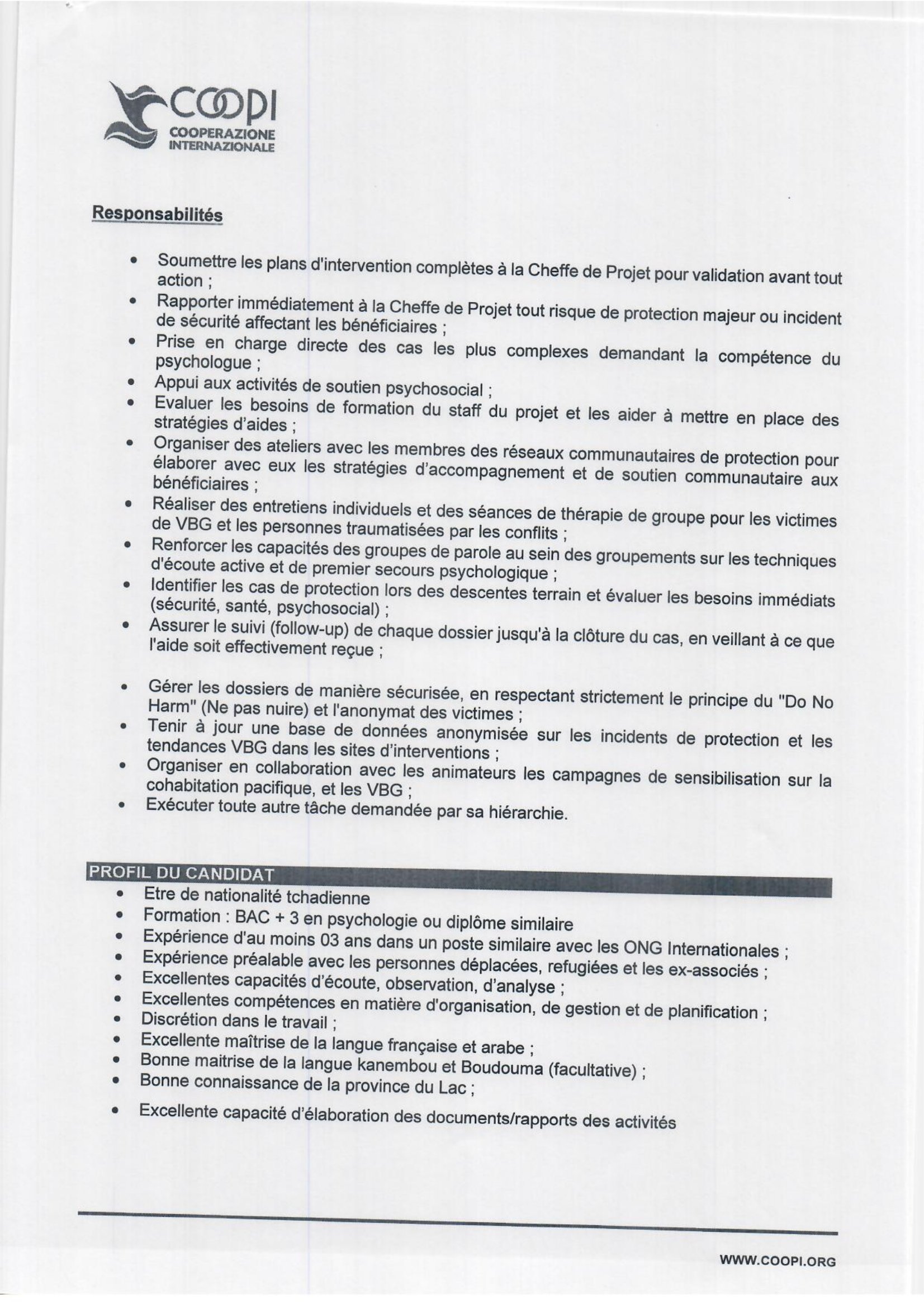 Accueil » Opportunités » Afrique » Tchad » COOPI Tchad recherche un(e) Psychologue, poste basé à Bol