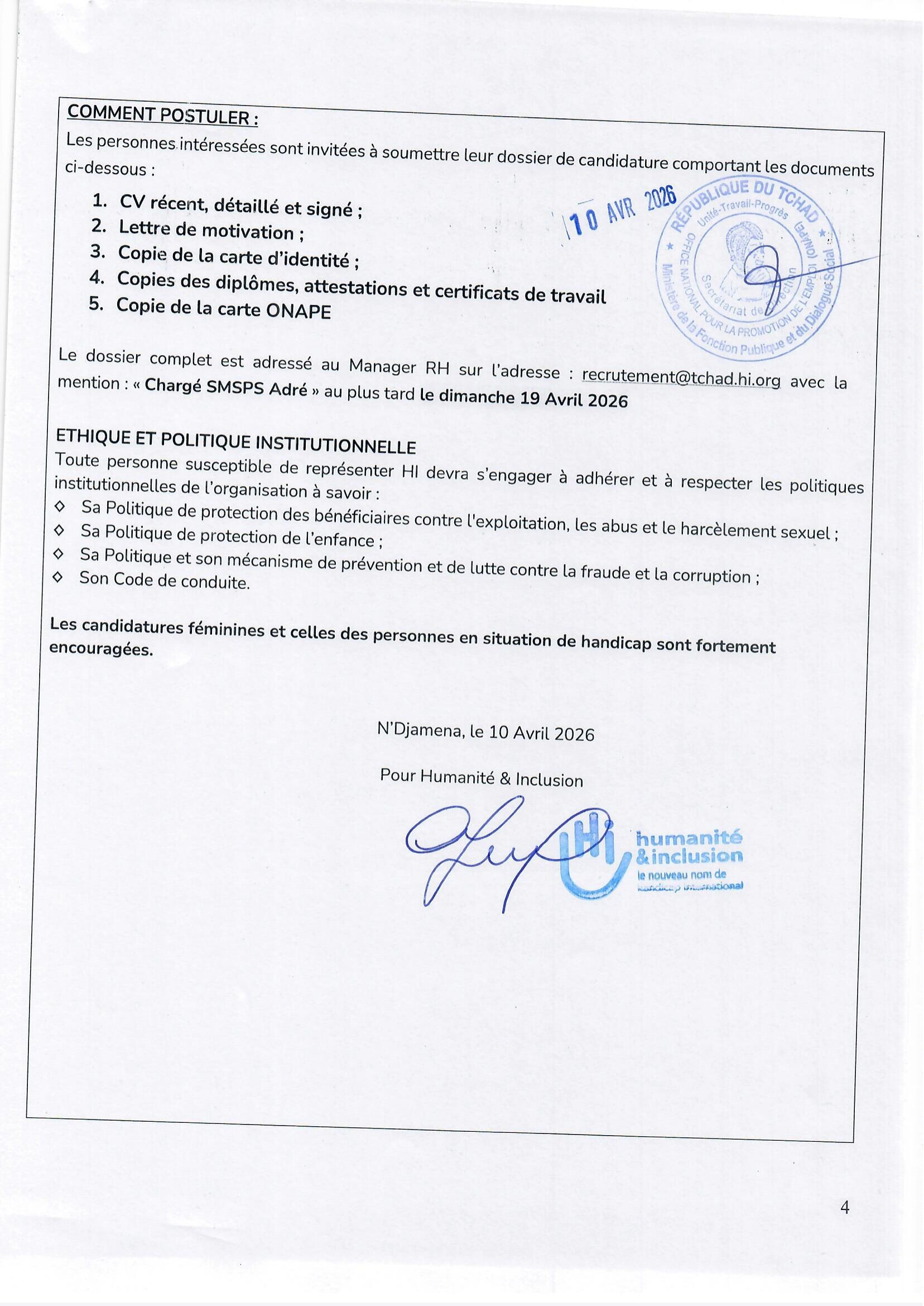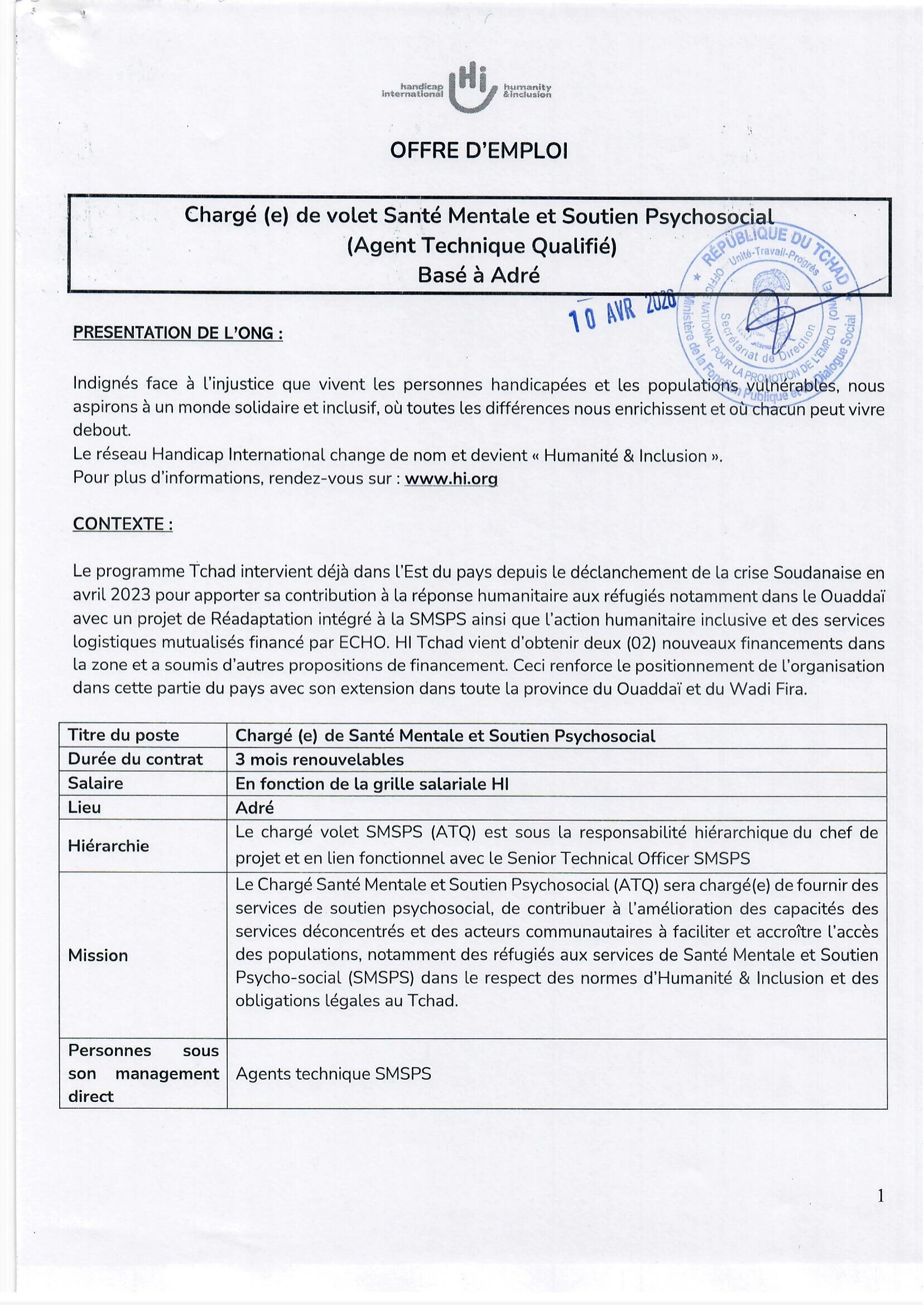 Accueil » Opportunités » Afrique » Tchad » Humanité & Inclusion recrute un(e) Chargé(e) de Santé Mentale et Soutien Psychosocial basé à Adré, Tchad