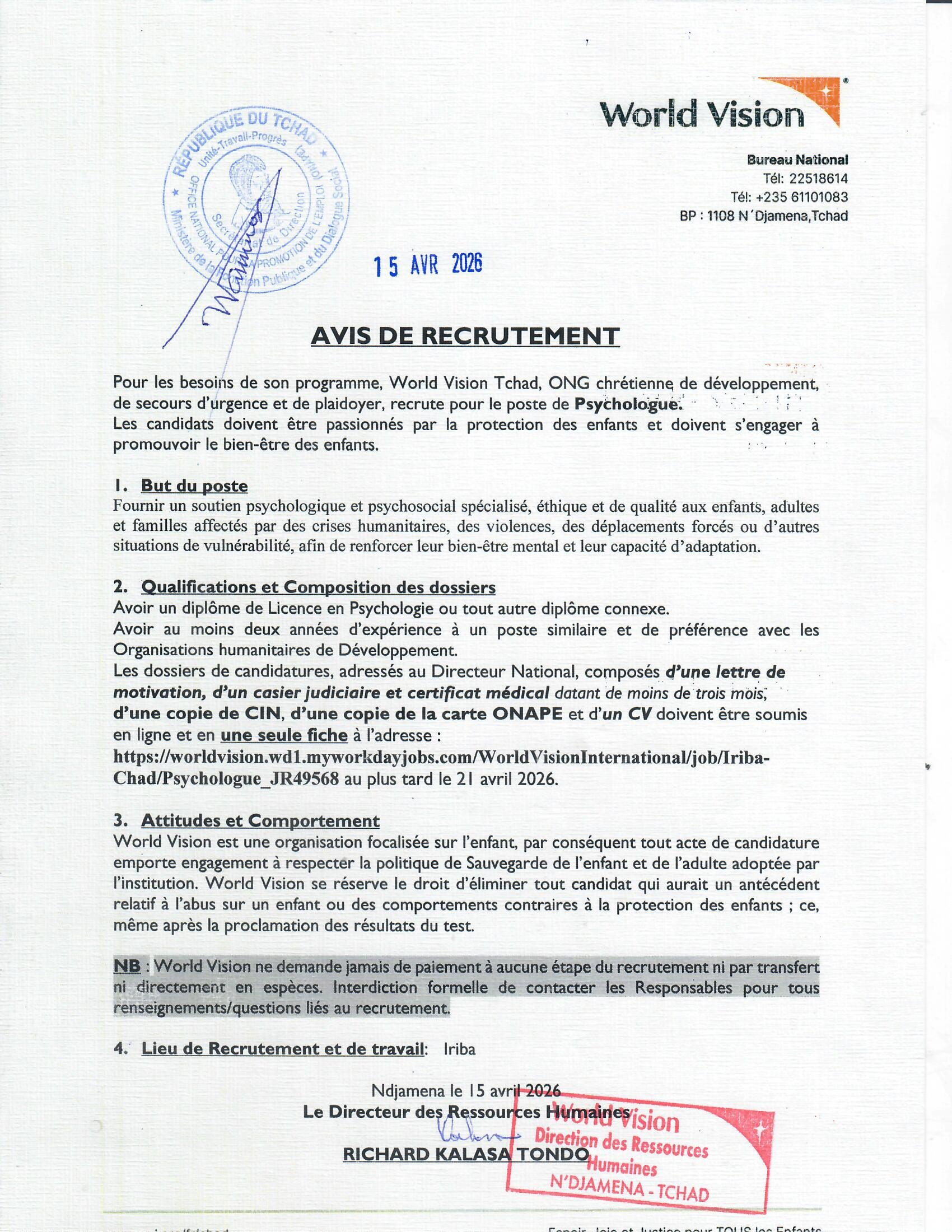 Accueil » Opportunités » Afrique » Tchad » World Vision Tchad recrute un(e) Psychologue, poste basé à Iriba