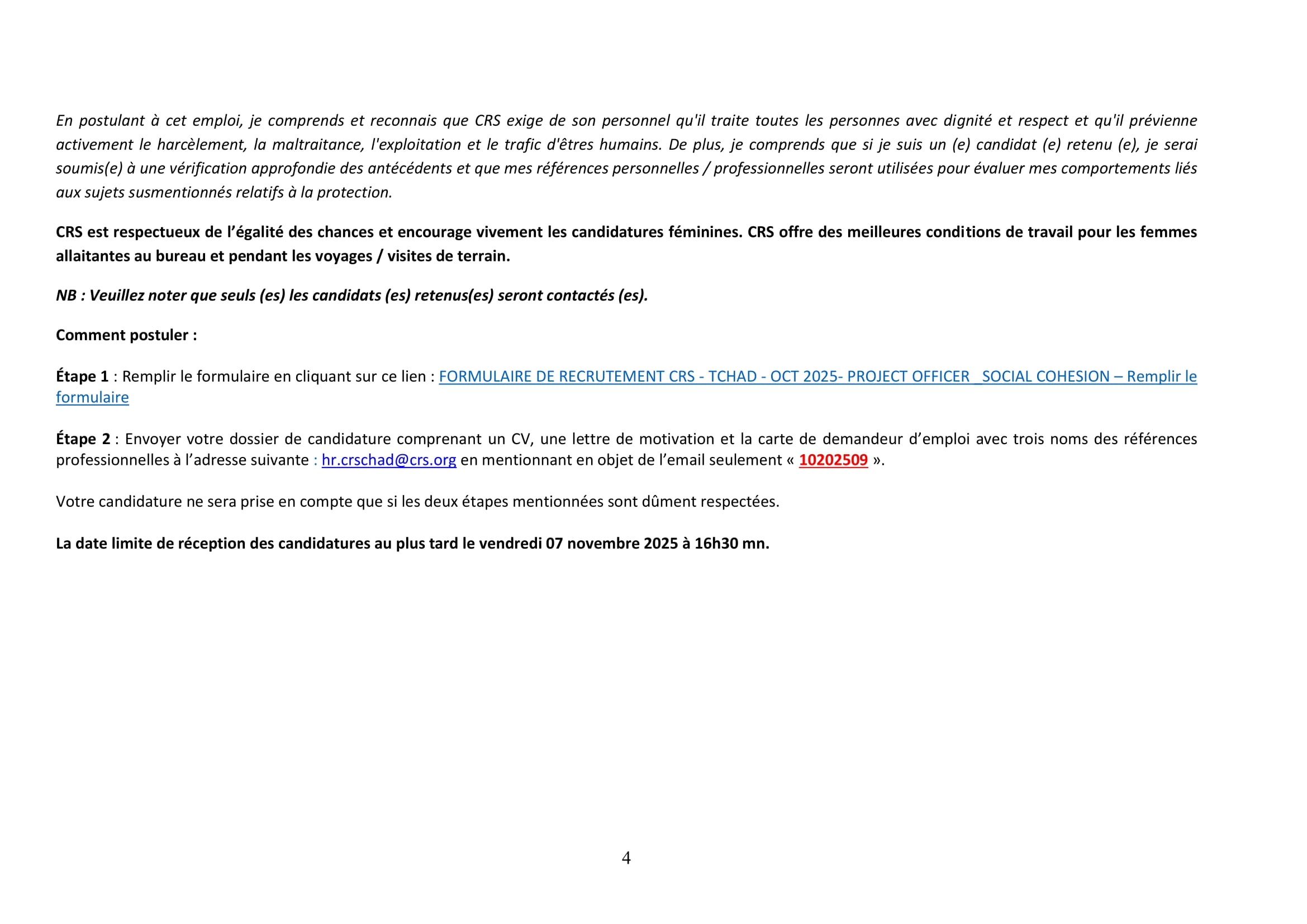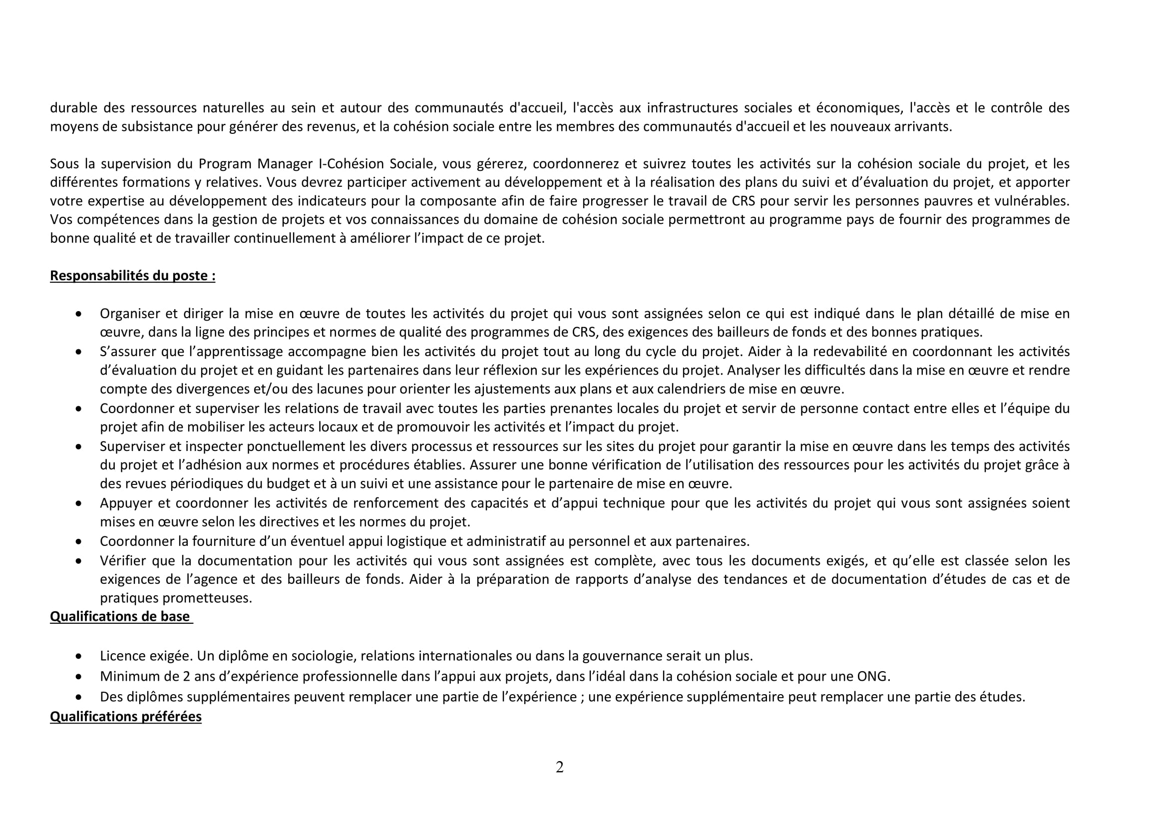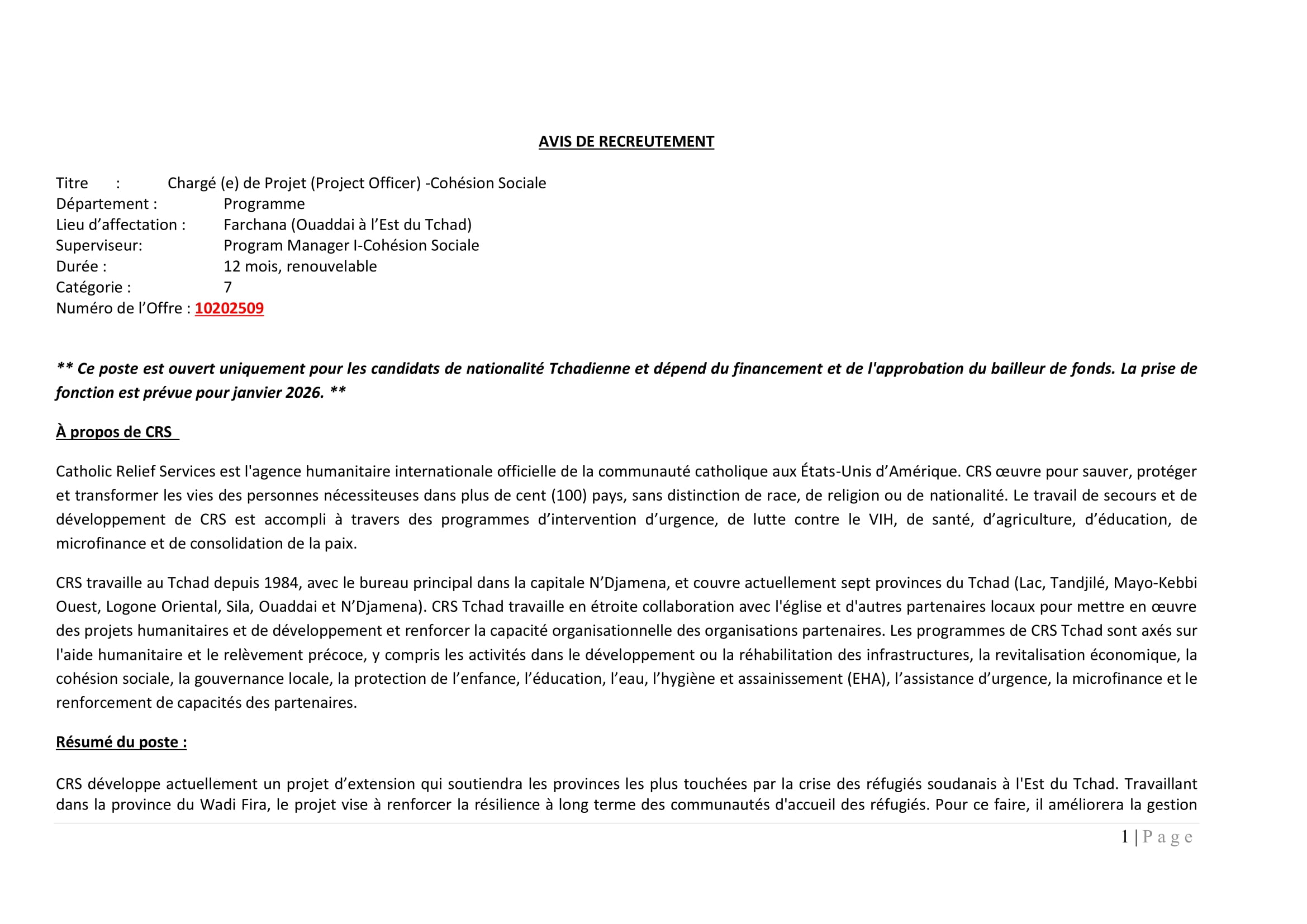 Accueil » Opportunités » Afrique » Tchad » Catholic Relief Services recrute à Farchana un(e) Chargé(e) de Projet – Cohésion Sociale, Tchad