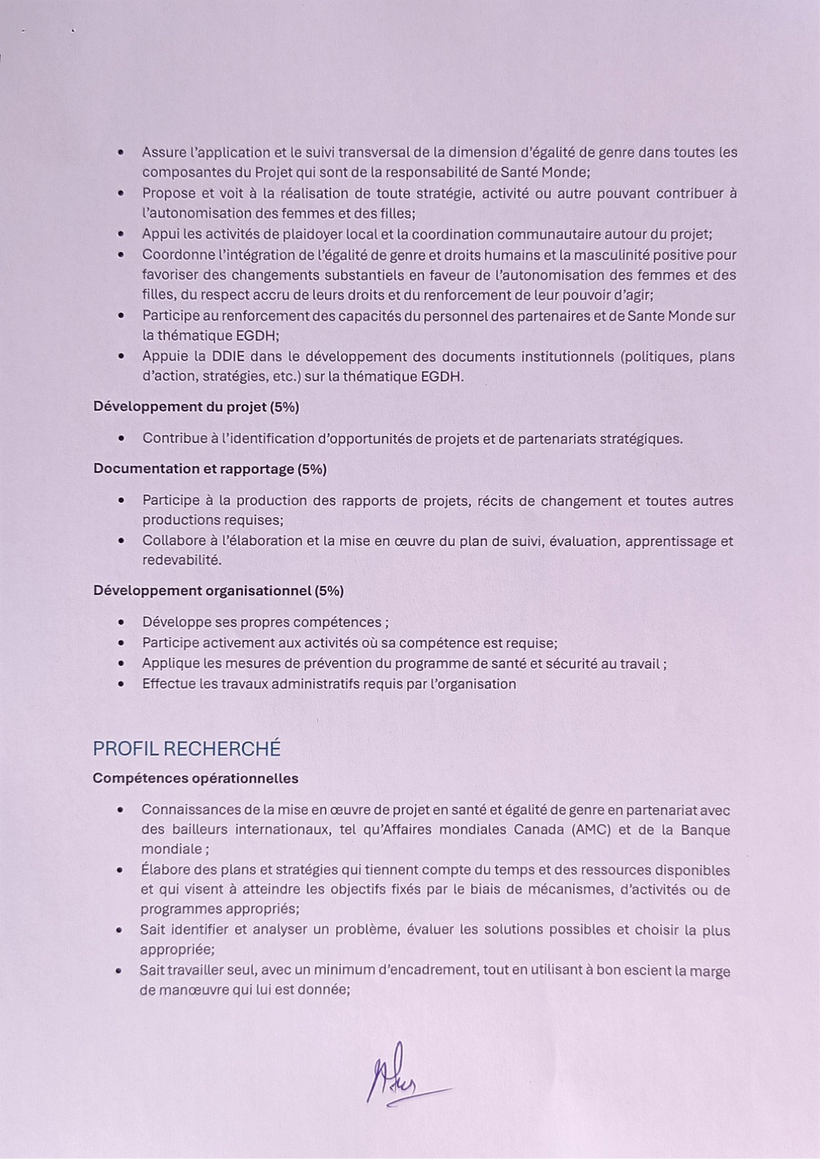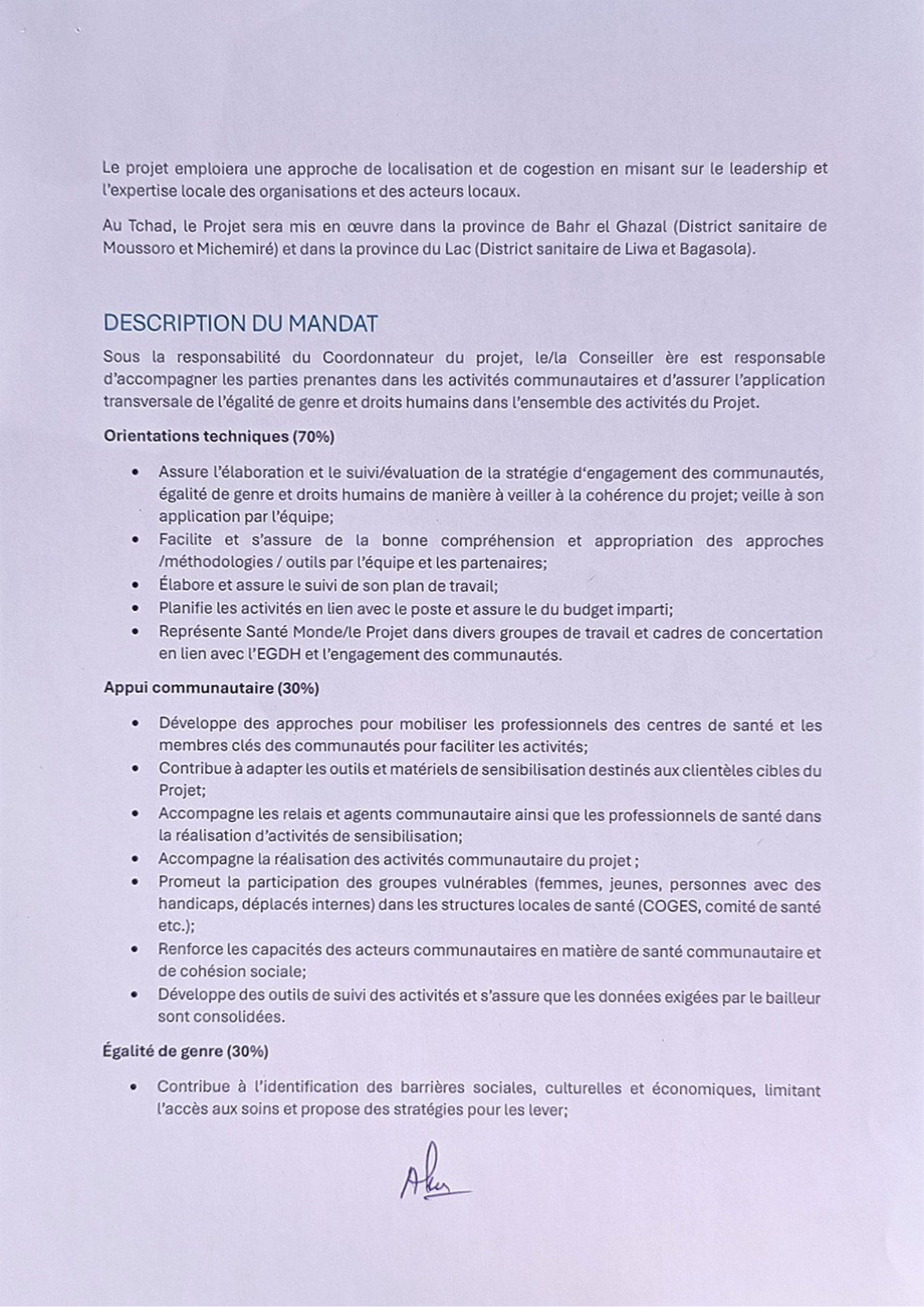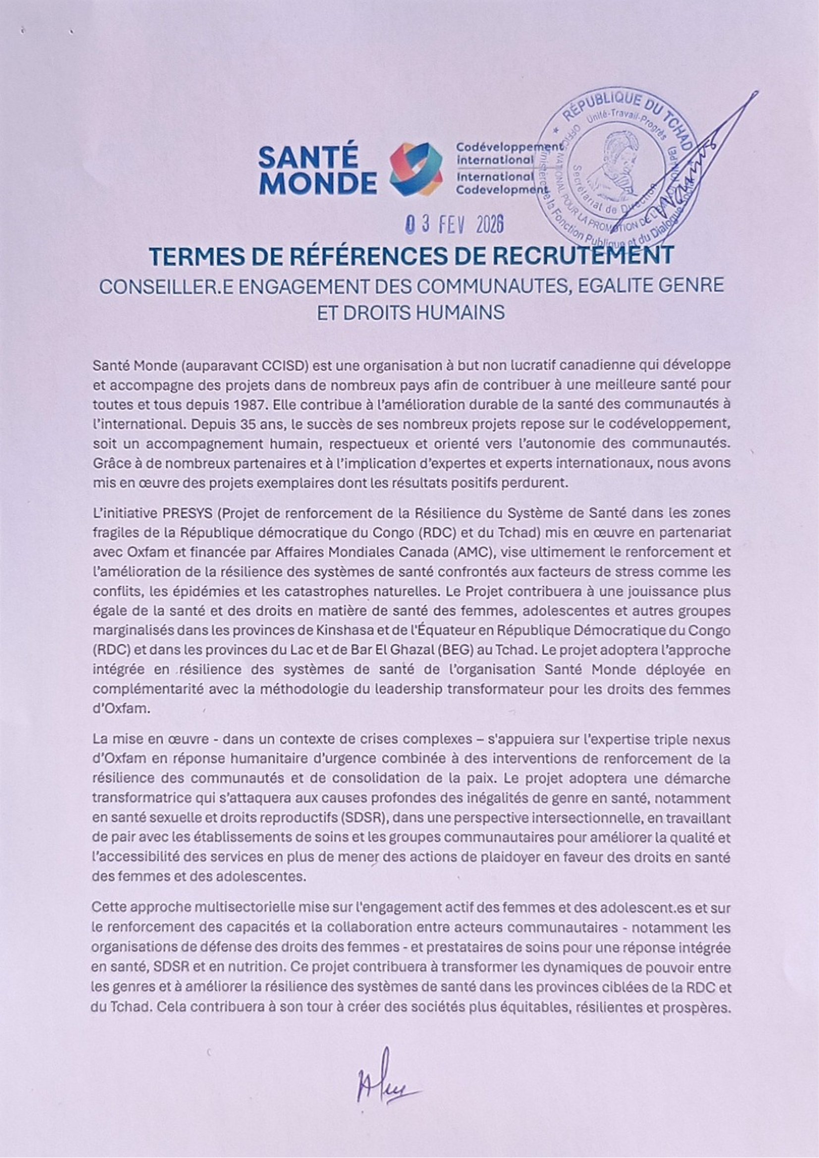 Santé Monde recrute un(e) Conseiller(ère) en engagement communautaire, égalité de genre et droits humains au Tchad