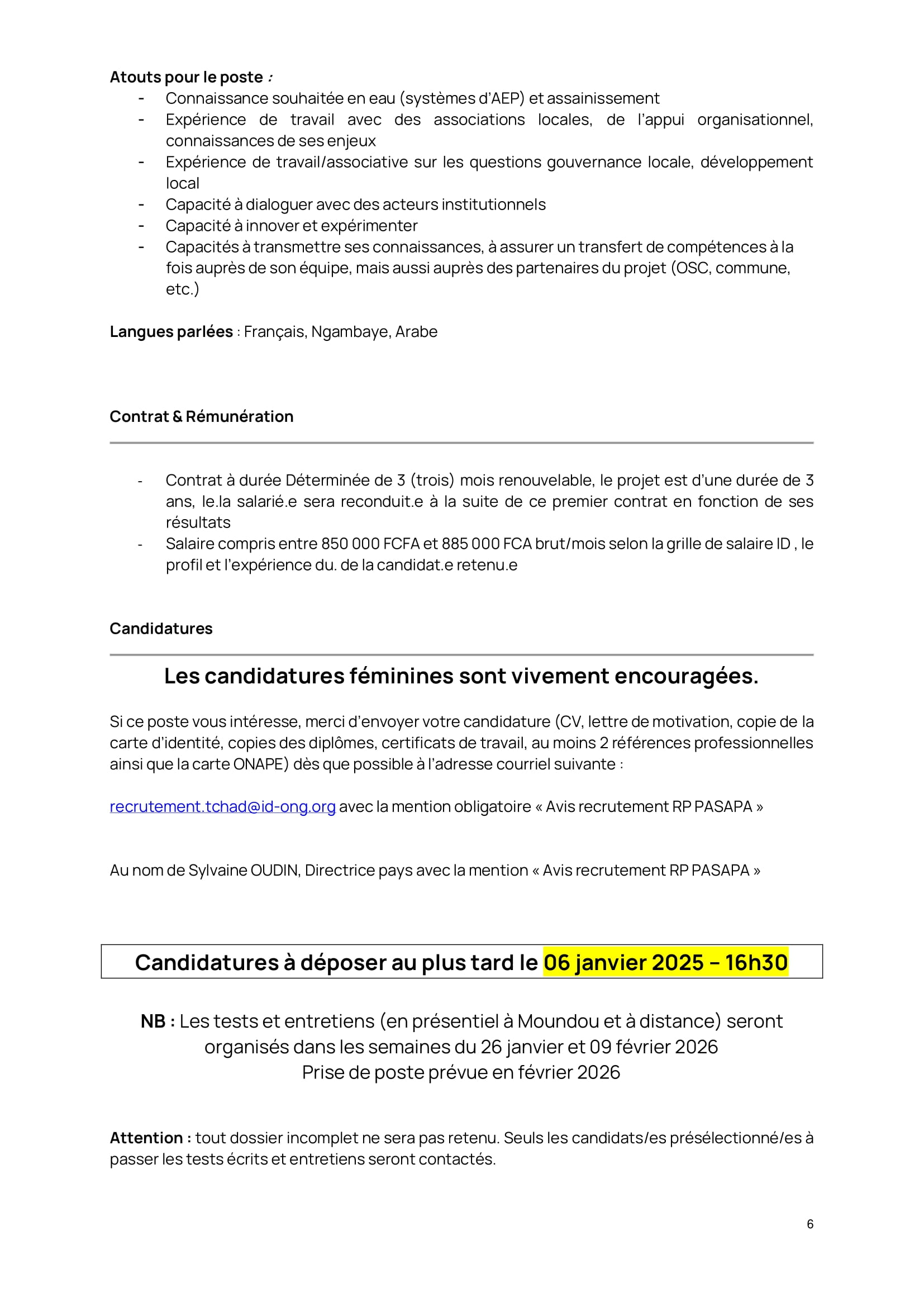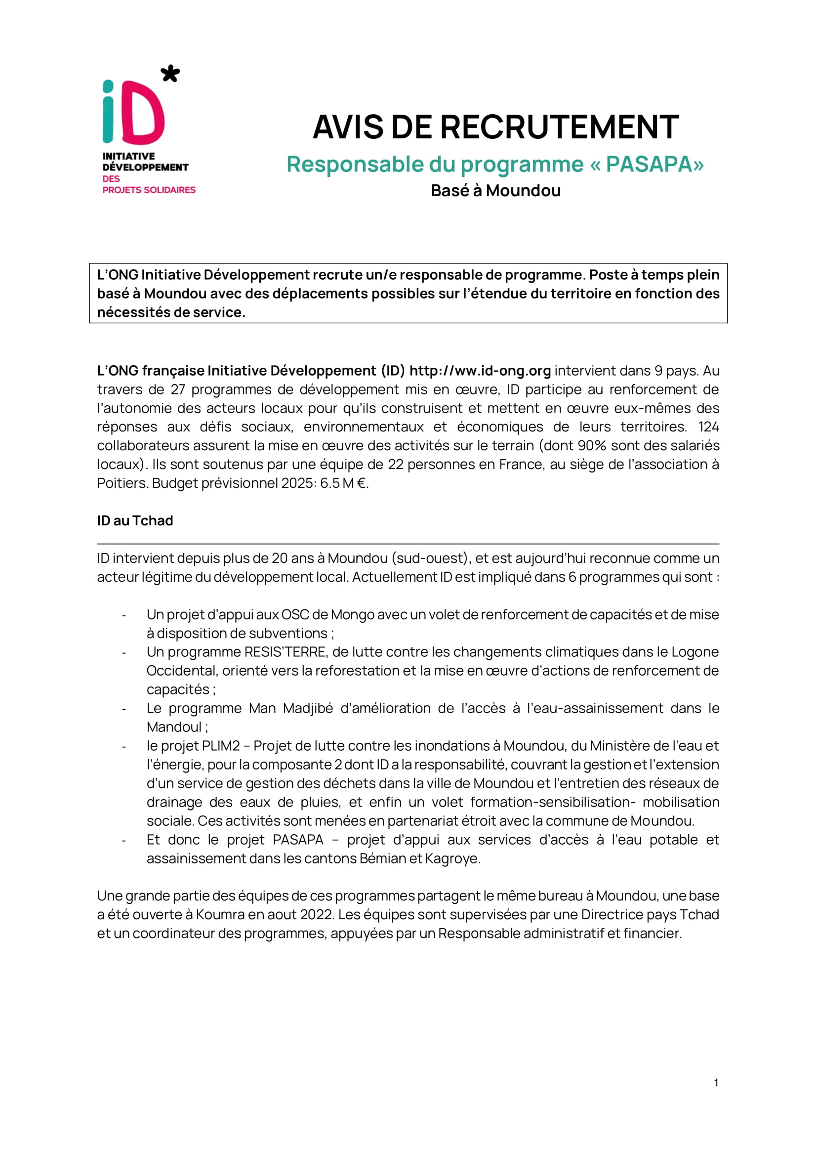 Initiative Développement (ID) lance un avis de recrutement d’un(e) Responsable du Programme « PASAPA » basé(e) à Moundou, Tchad