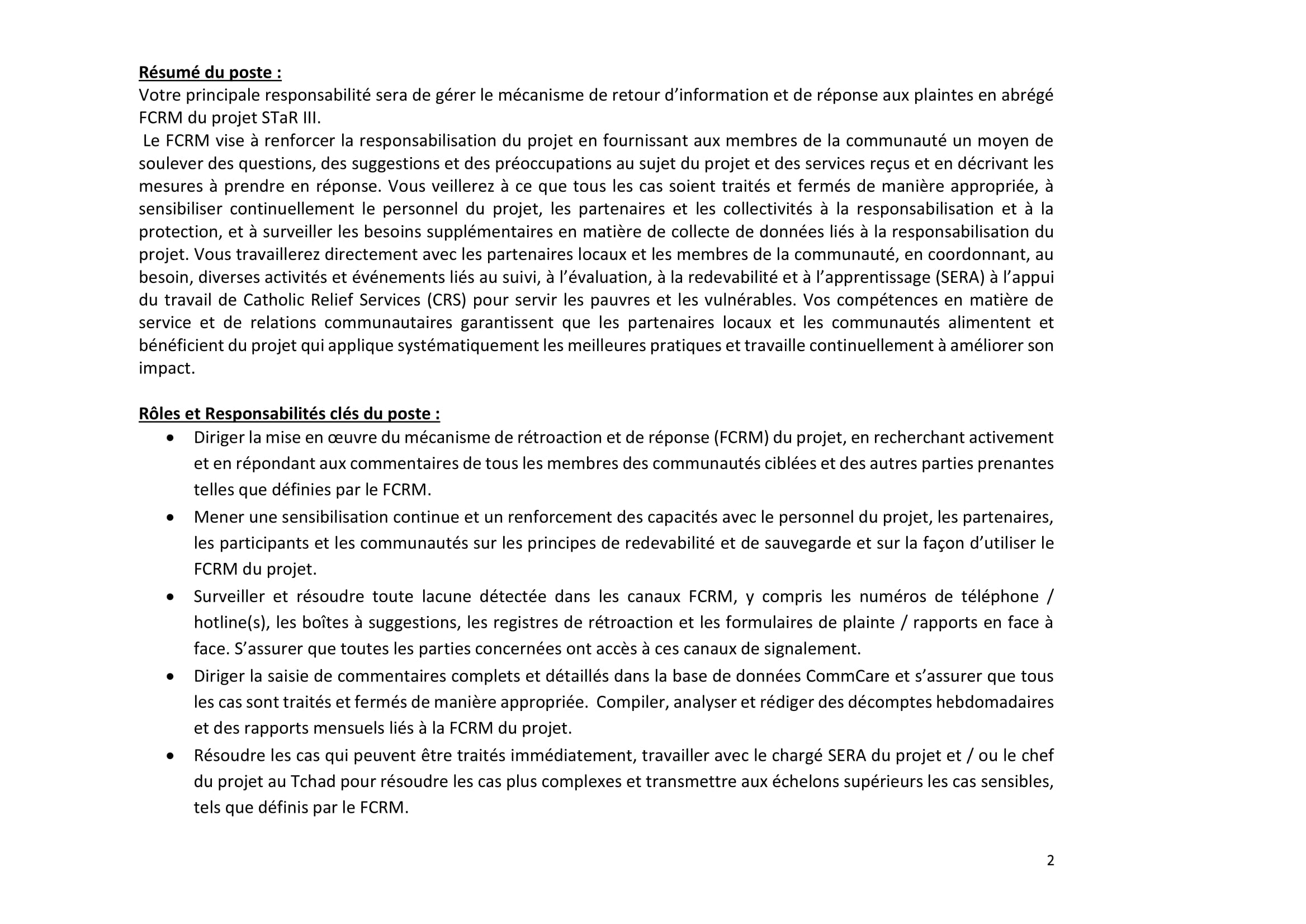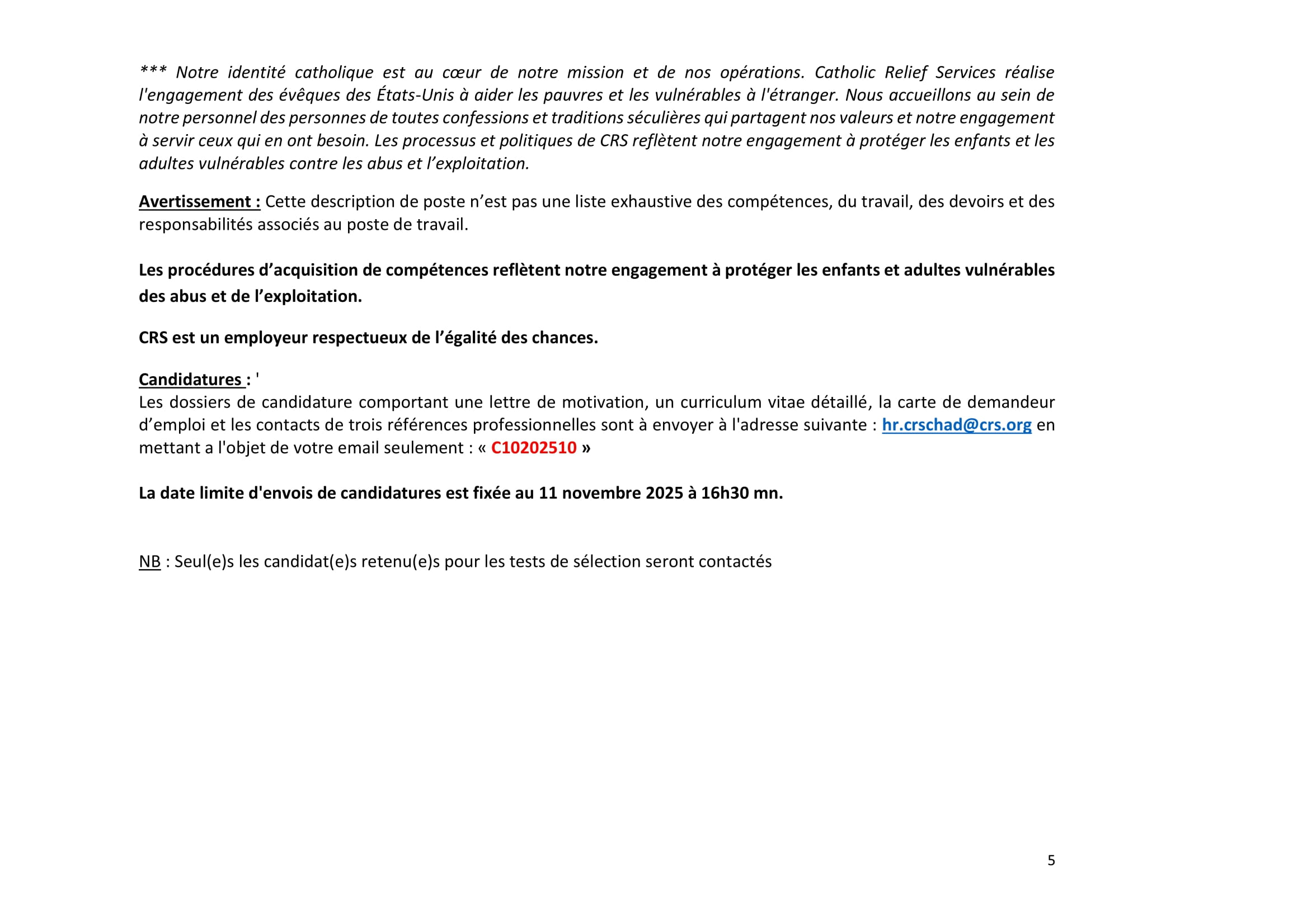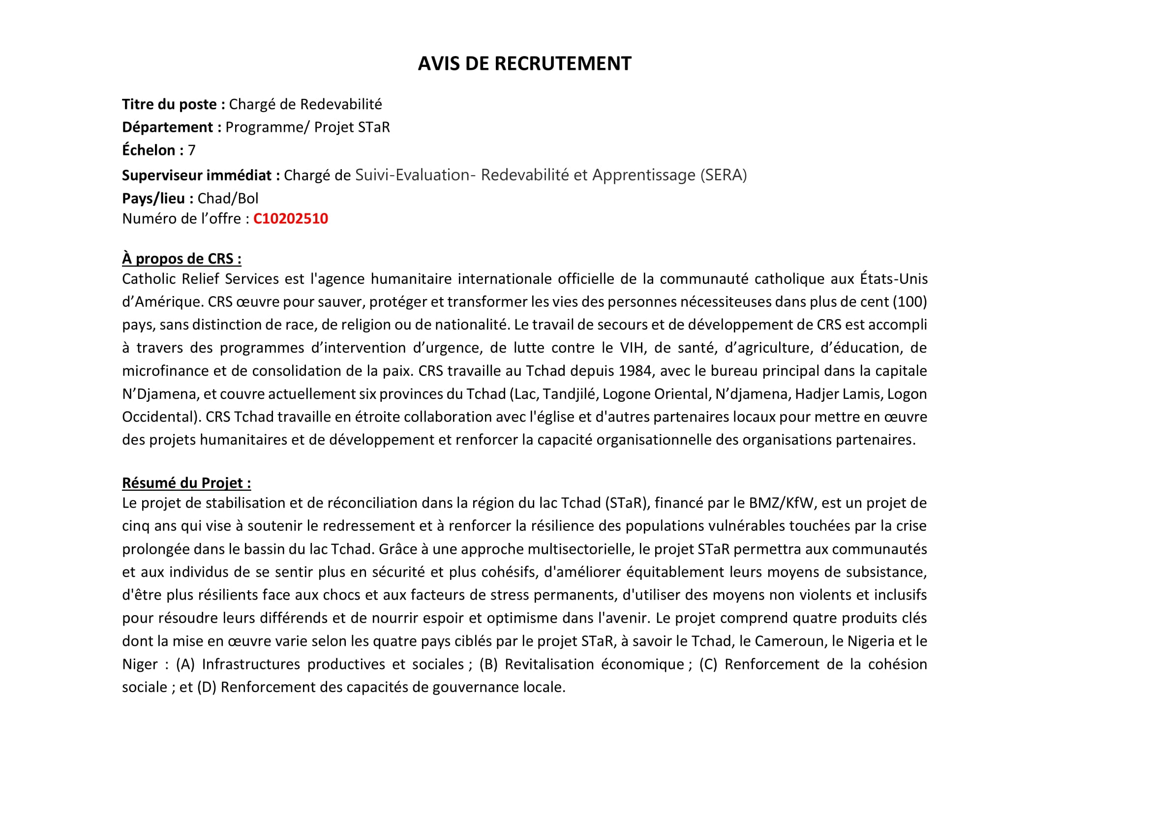 Accueil » Opportunités » Afrique » Tchad » Catholic Relief Services recrute un Chargé de Redevabilité à Bol, Tchad