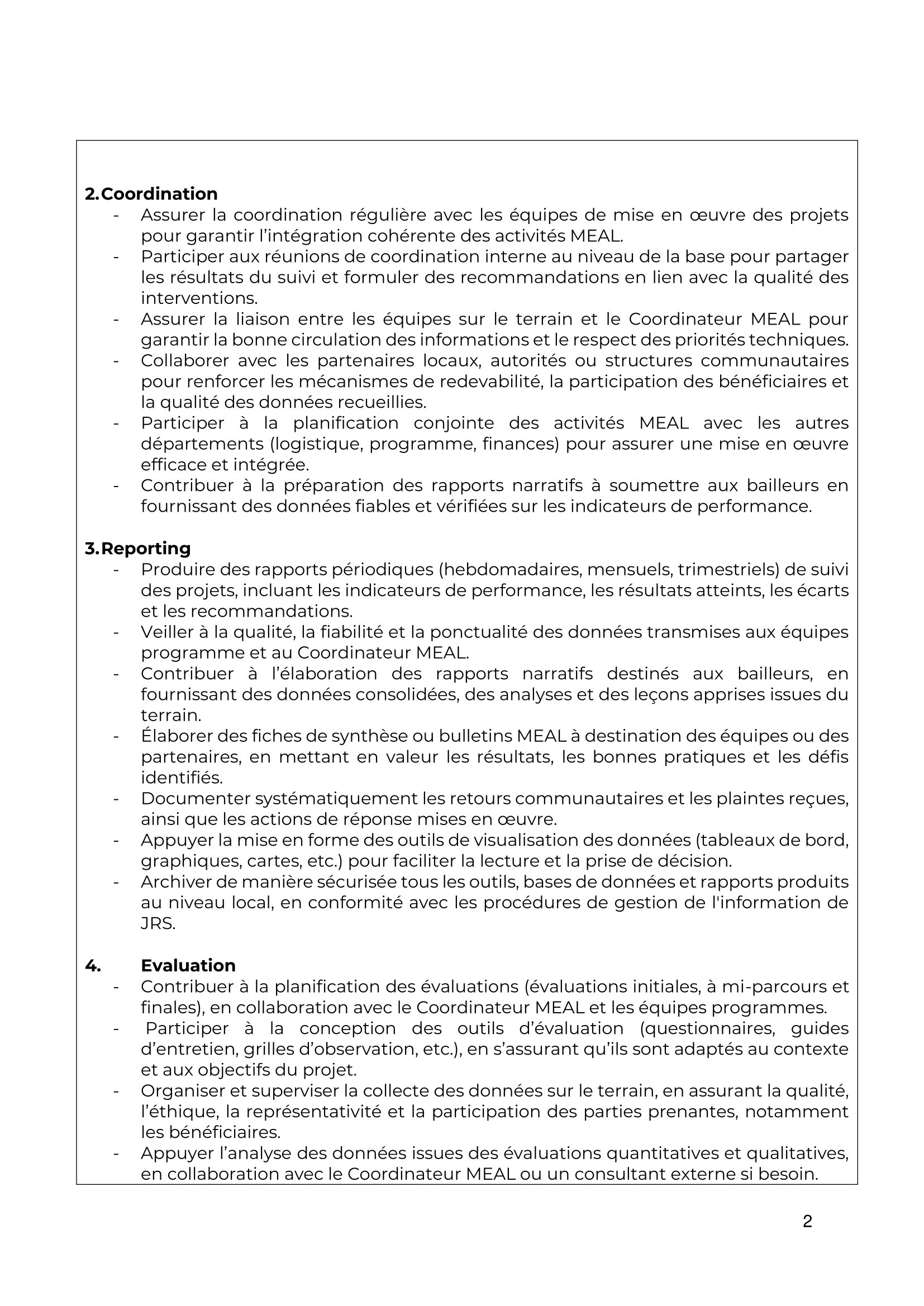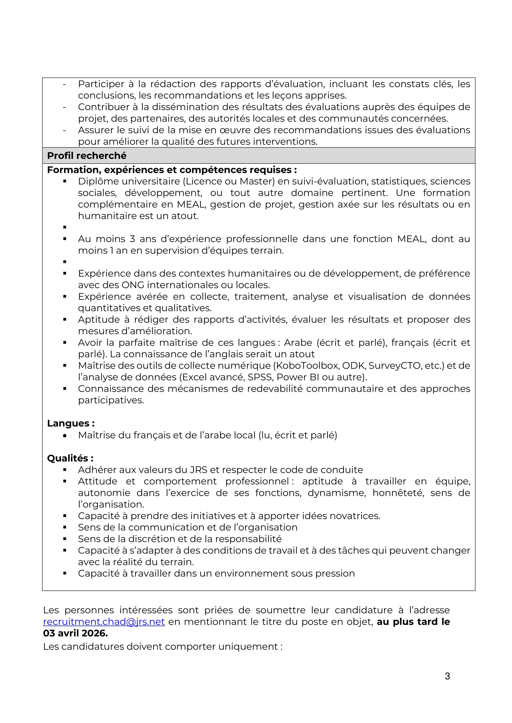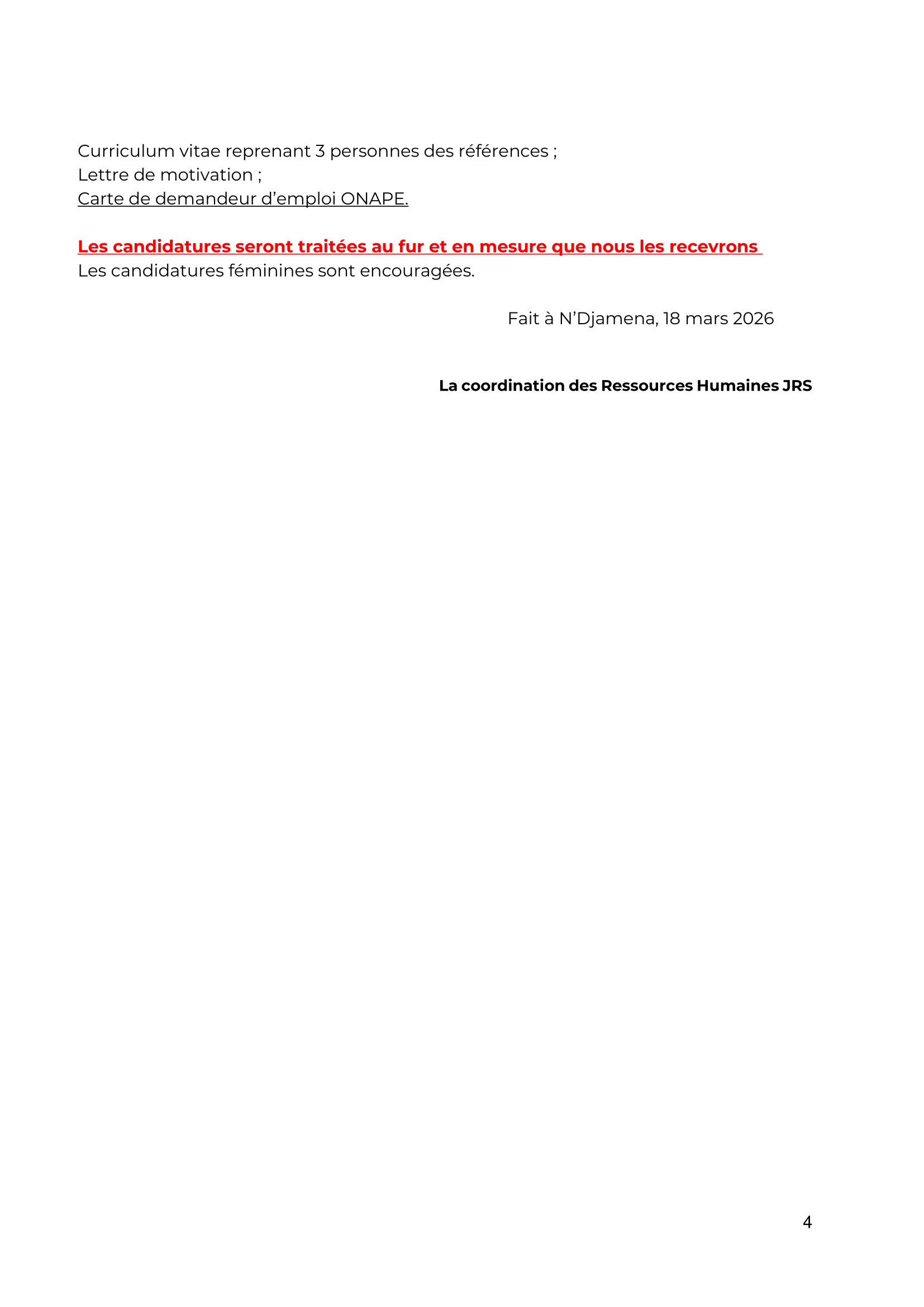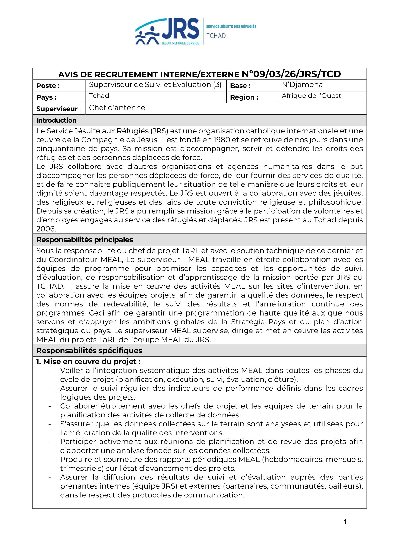 Accueil » Opportunités » Afrique » Tchad » Le Service Jésuite aux Réfugiés (JRS) lance un avis de recrutement de 3 Superviseurs de Suivi et Évaluation à N’Djamena, Tchad