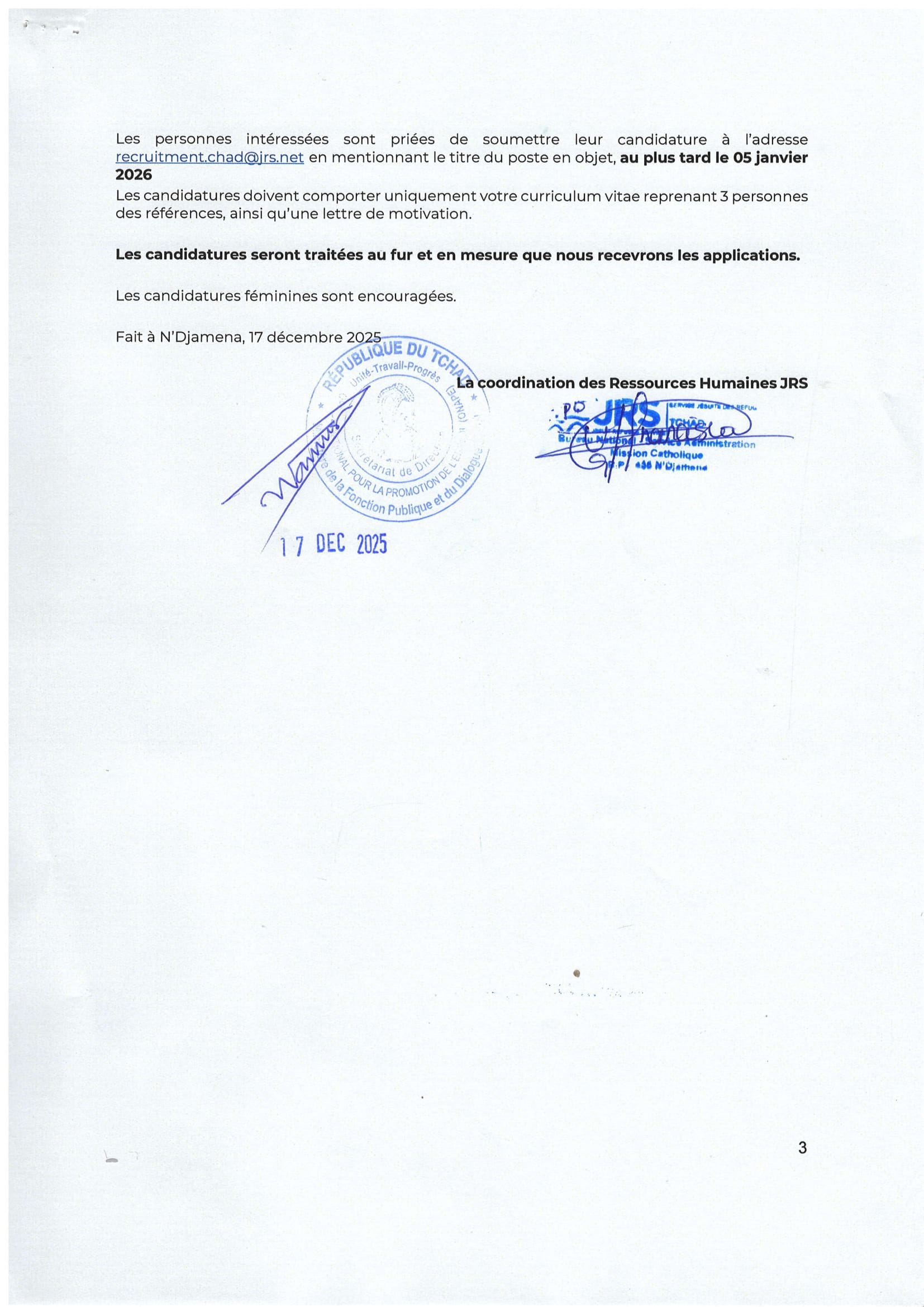 Accueil » Opportunités » Afrique » Tchad » Le Service Jésuite des Réfugiés (JRS) au Tchad recherche des Agents suivi protection, poste basés à Iriba, Farchana, Goz Beïda, N’Djamena, Abéché et Bagassola