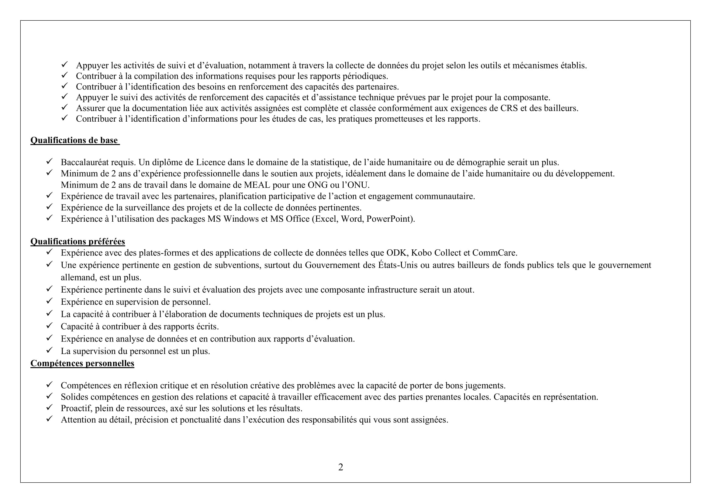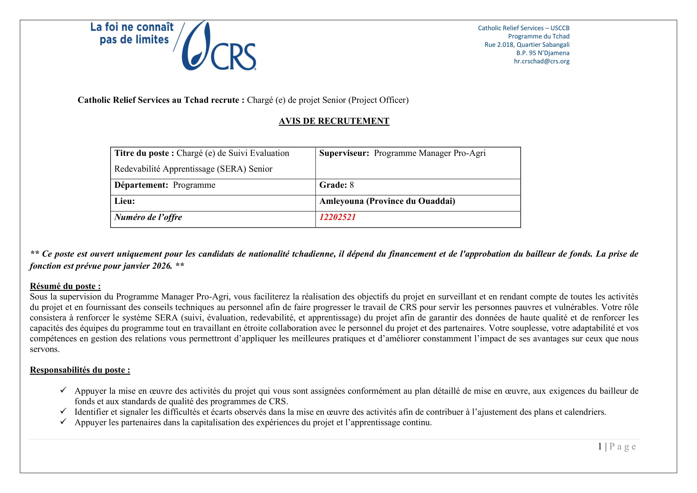 Accueil » Opportunités » Afrique » Tchad » Catholic Relief Services (CRS) au Tchad recherche un(e) Chargé(e) de Suivi-Evaluation, Redevabilité et Apprentissage (SERA) Senior, poste basé à Amleyouna