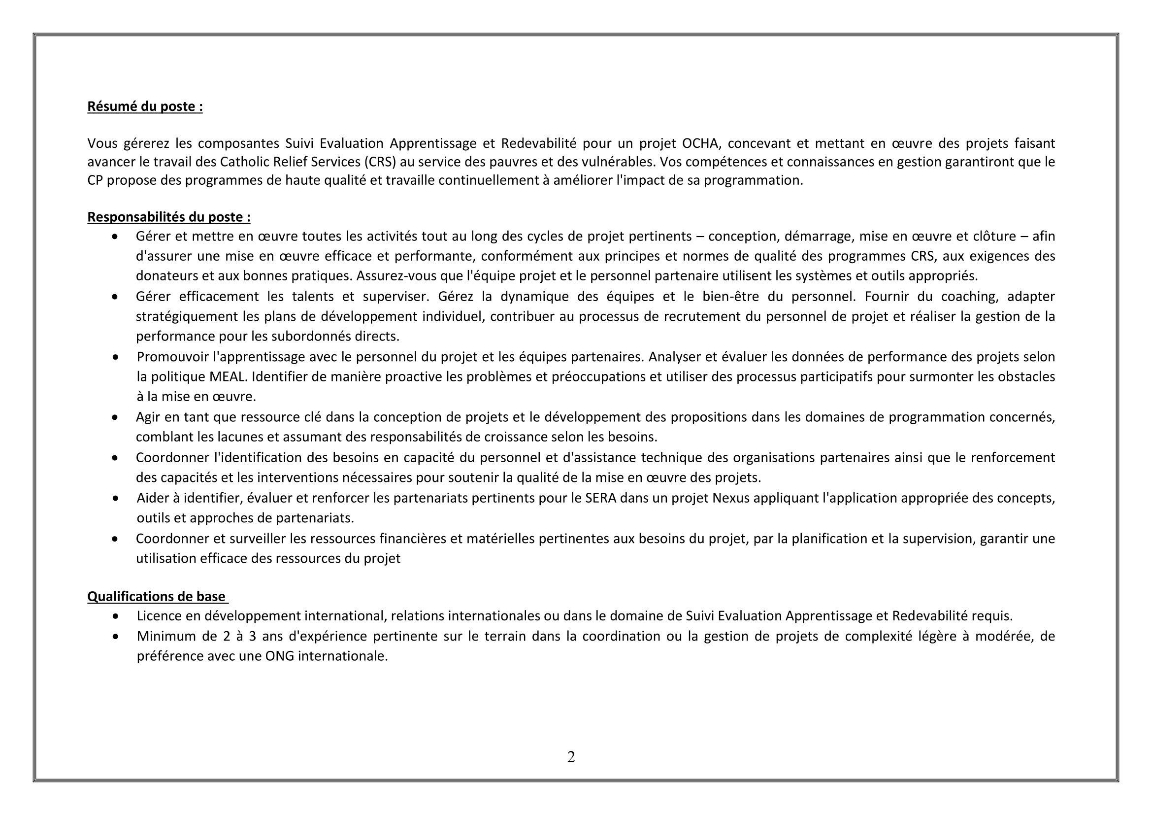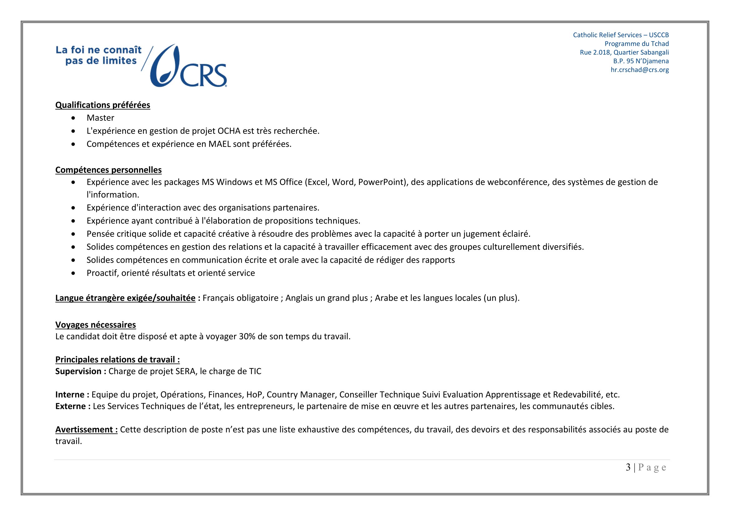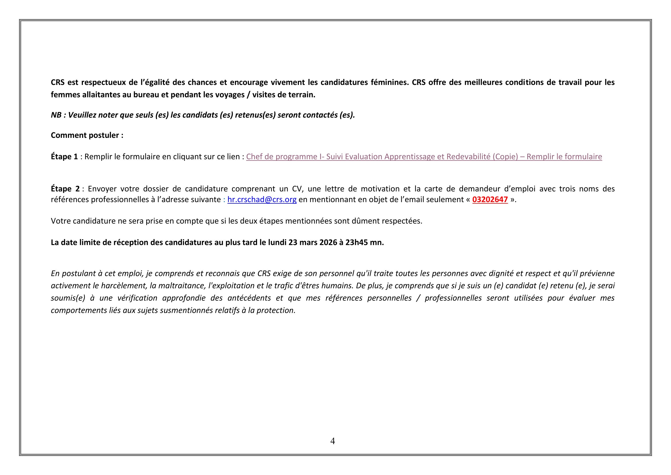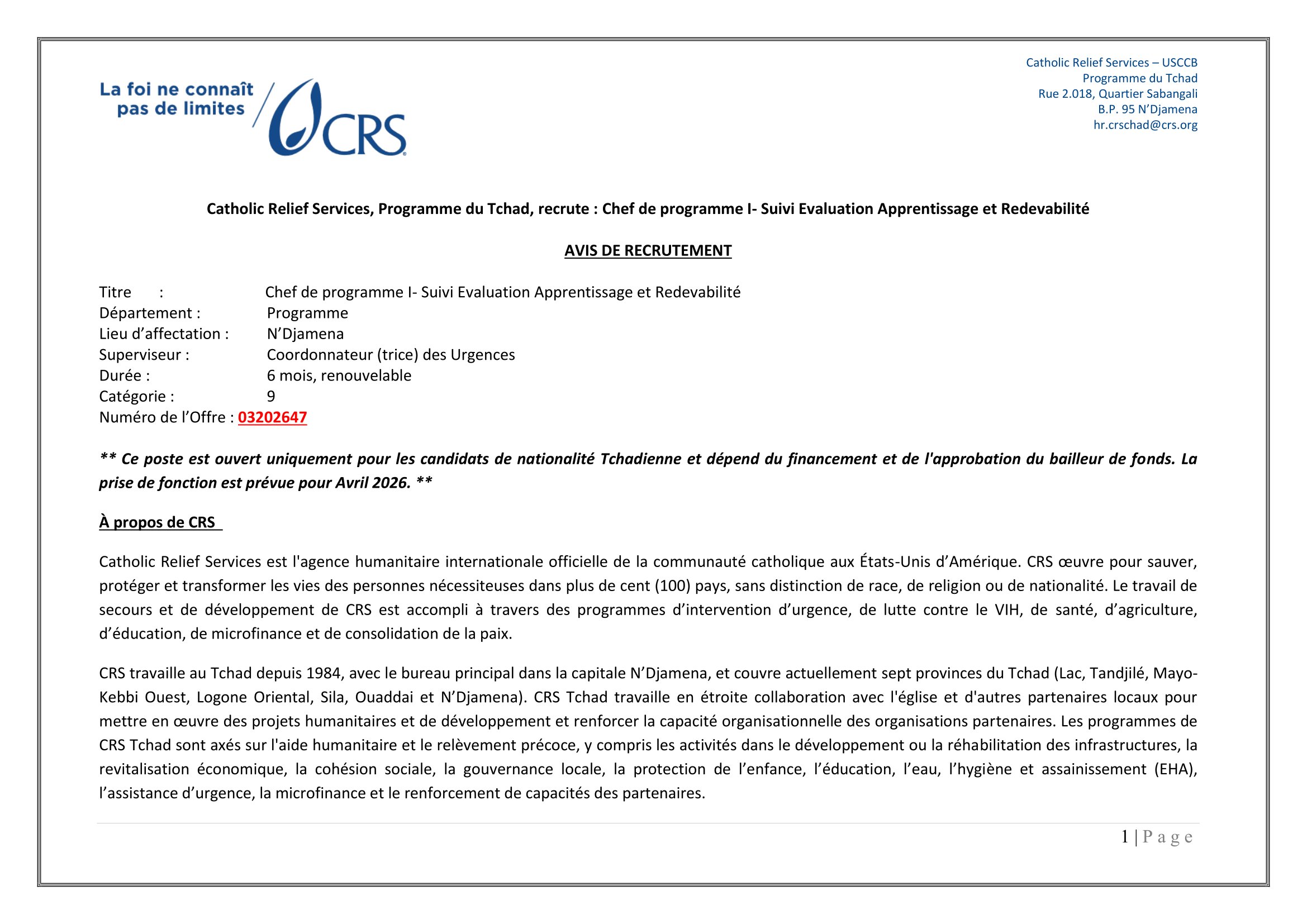Catholic Relief Services au Tchad lance un avis de recrutement d’un(e) Chef(fe) de Programme I – Suivi, Evaluation, Redevabilité et Apprentissage (SERA)