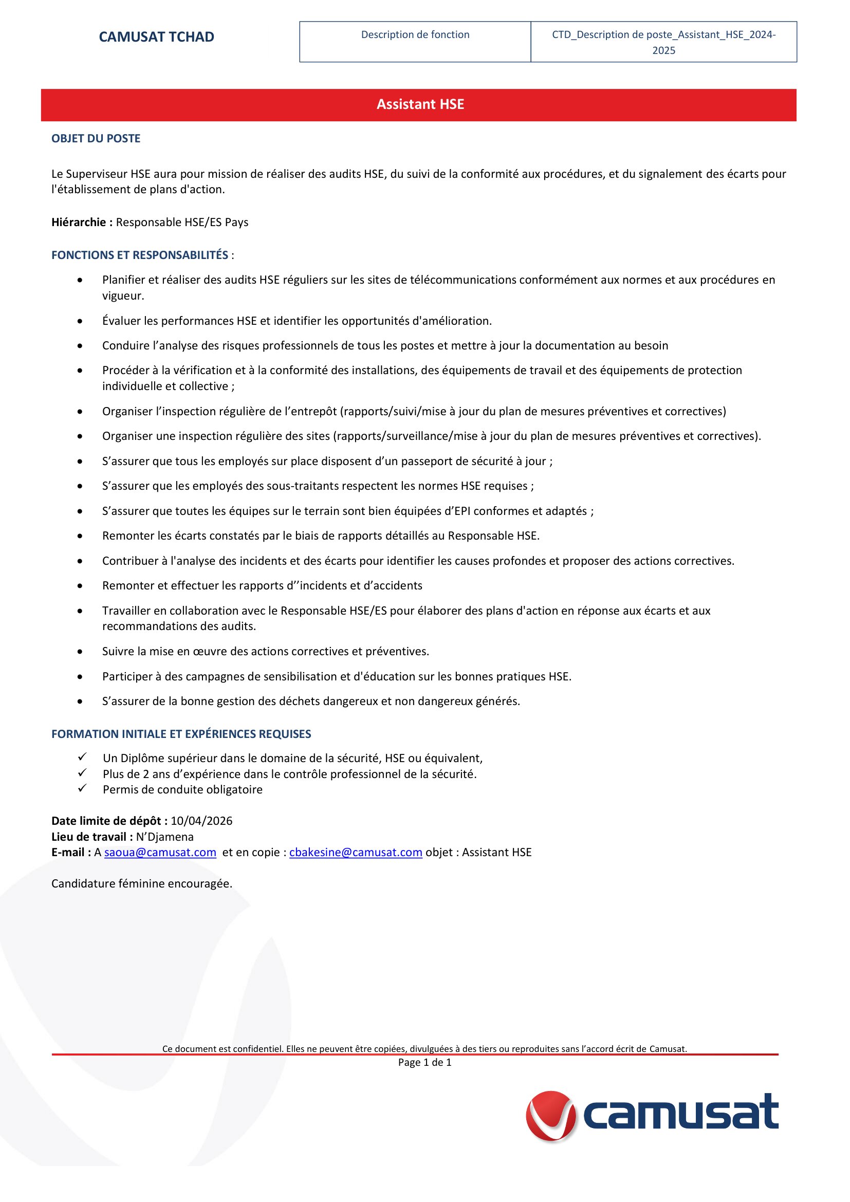 Accueil » Opportunités » Afrique » Tchad » CAMUSAT Tchad recherche un Assistant HSE, poste basé à N’Djamena
