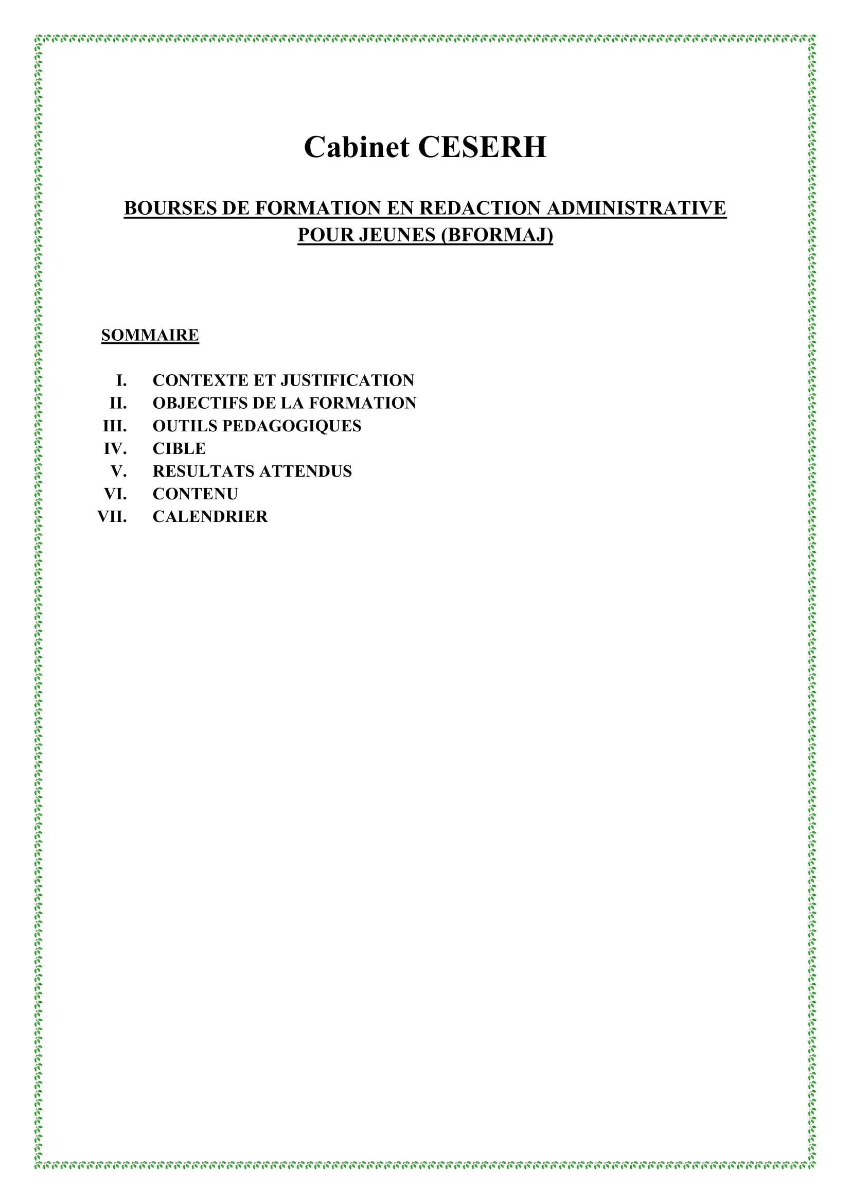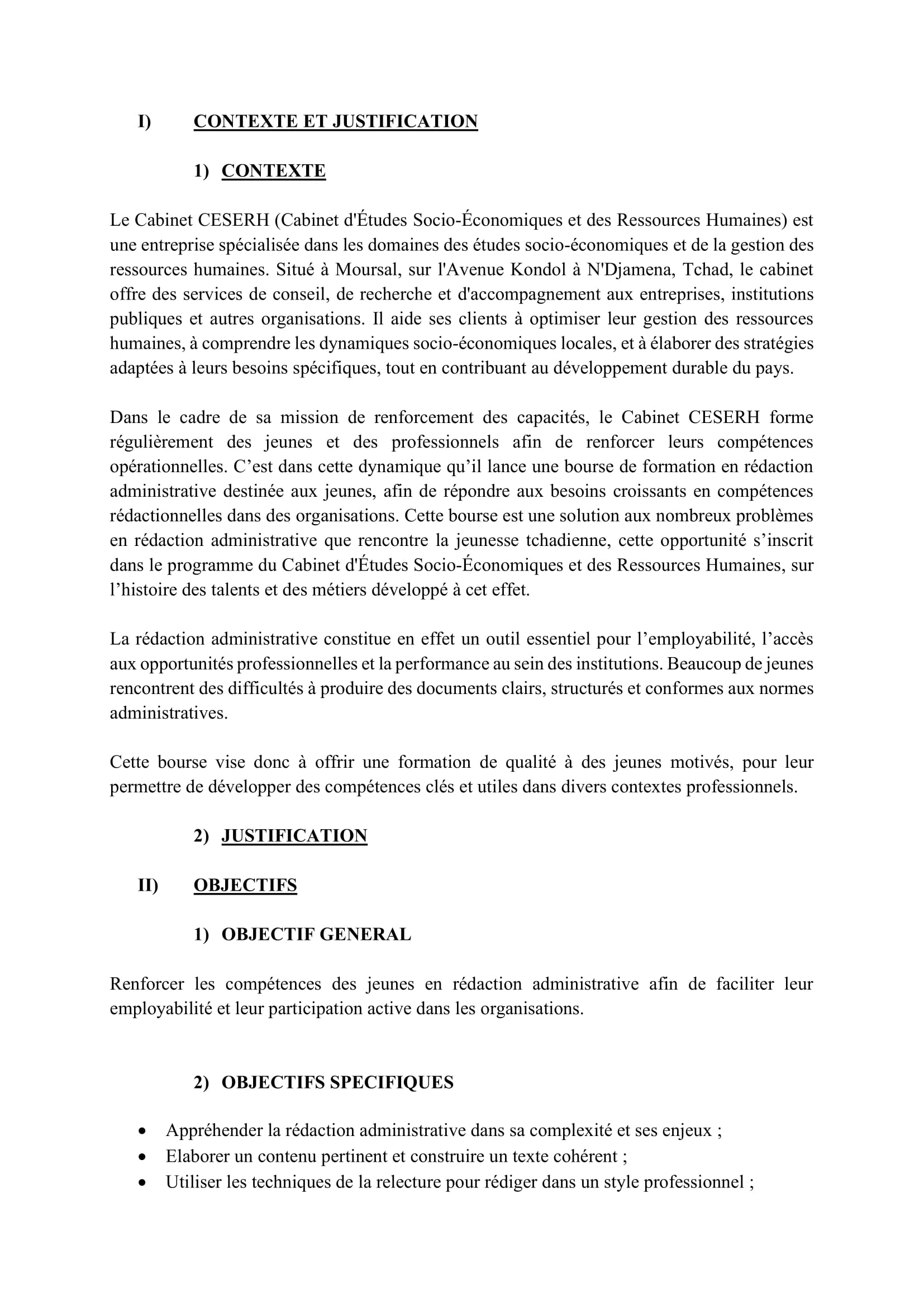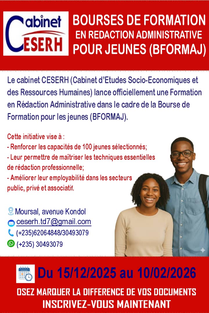 Accueil » Opportunités » Afrique » Tchad » Le Cabinet CESERH basé à N’Djamena lance officiellement une Formation en Rédaction Administrative dans le cadre de la Bourse de Formation pour les Jeunes (BFORMAJ), Tchad