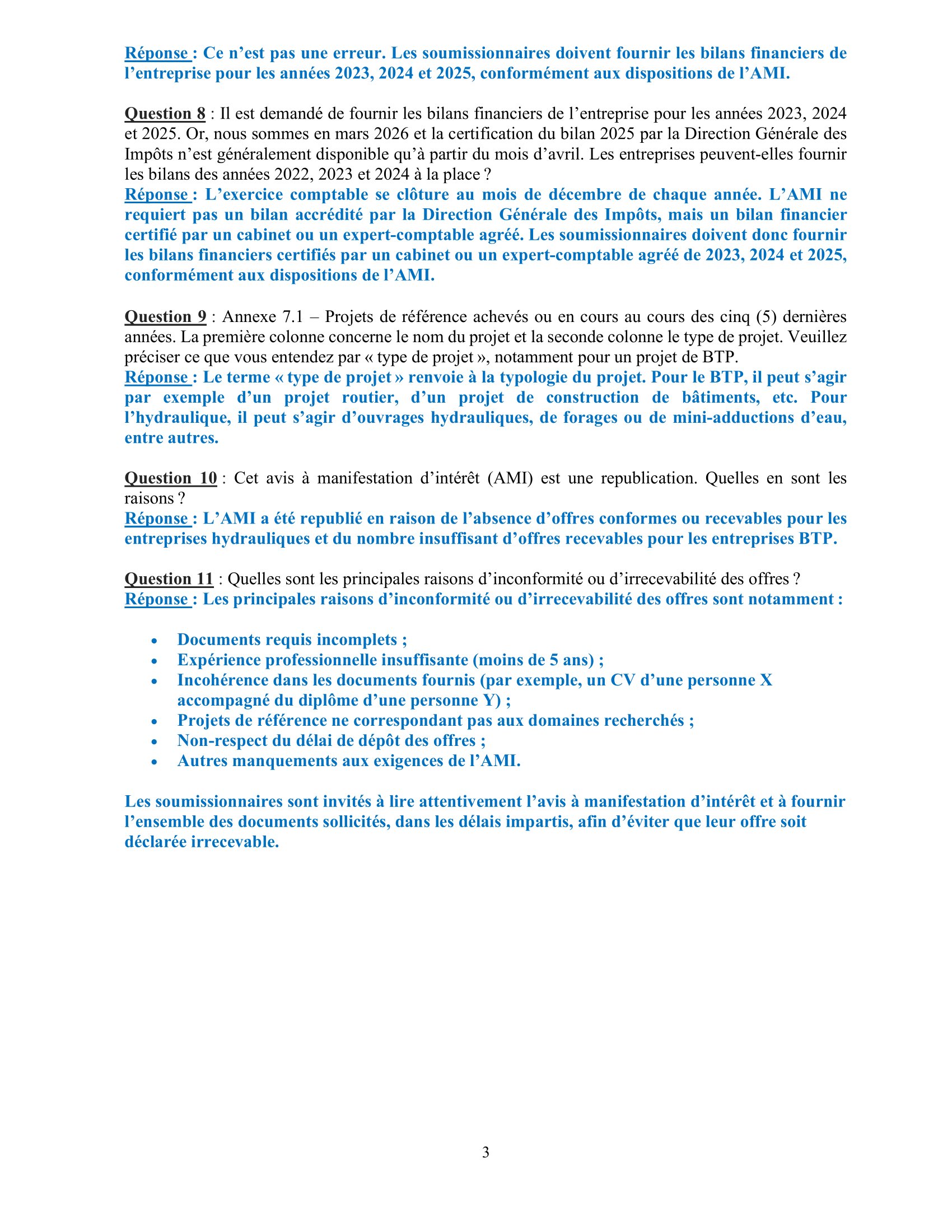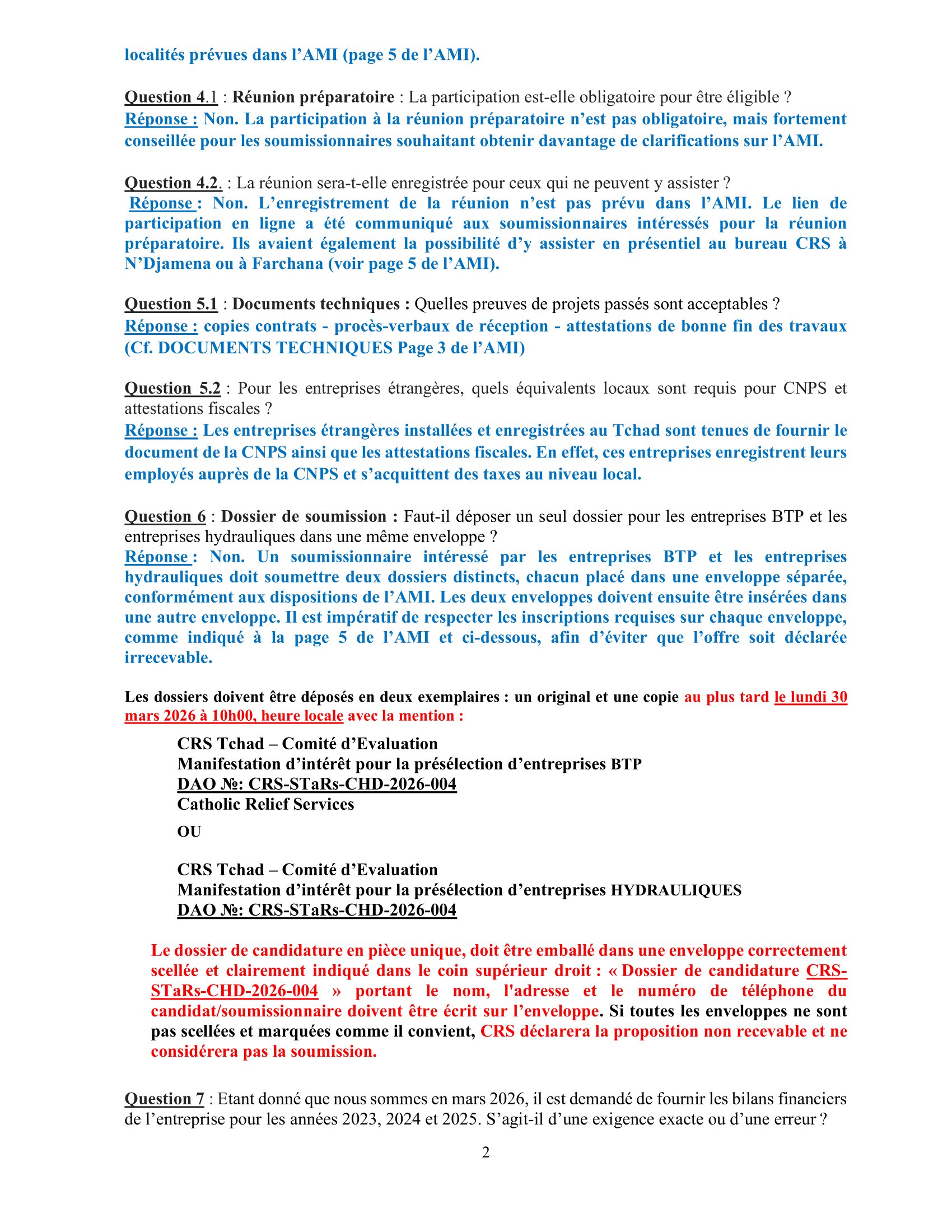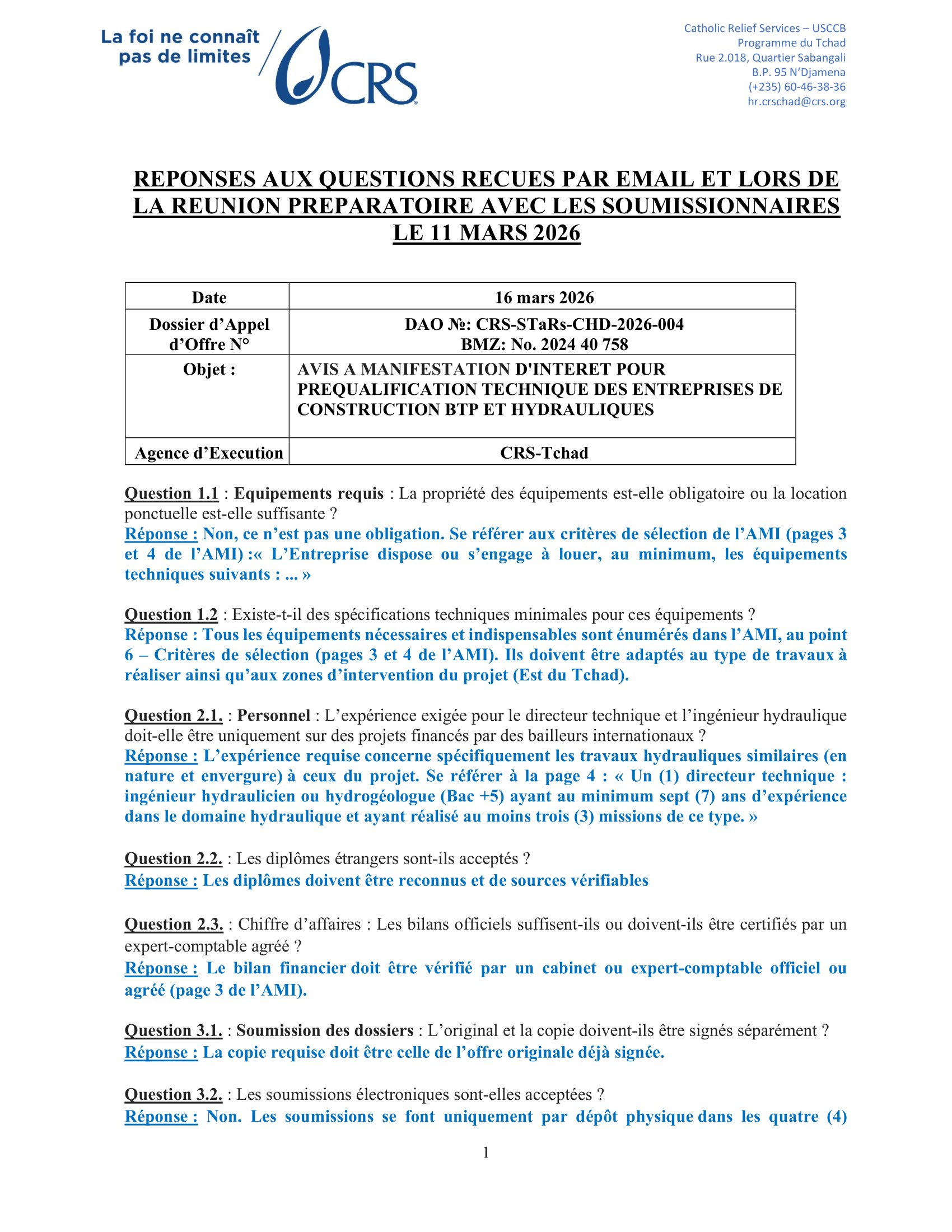 Accueil » Opportunités » Afrique » Tchad » Réponses aux Questions des Soumissionnaires de l’appel d’offres de Catholic Relief Services pour la sélection des Entreprises de construction BTP et hydrauliques, Tchad