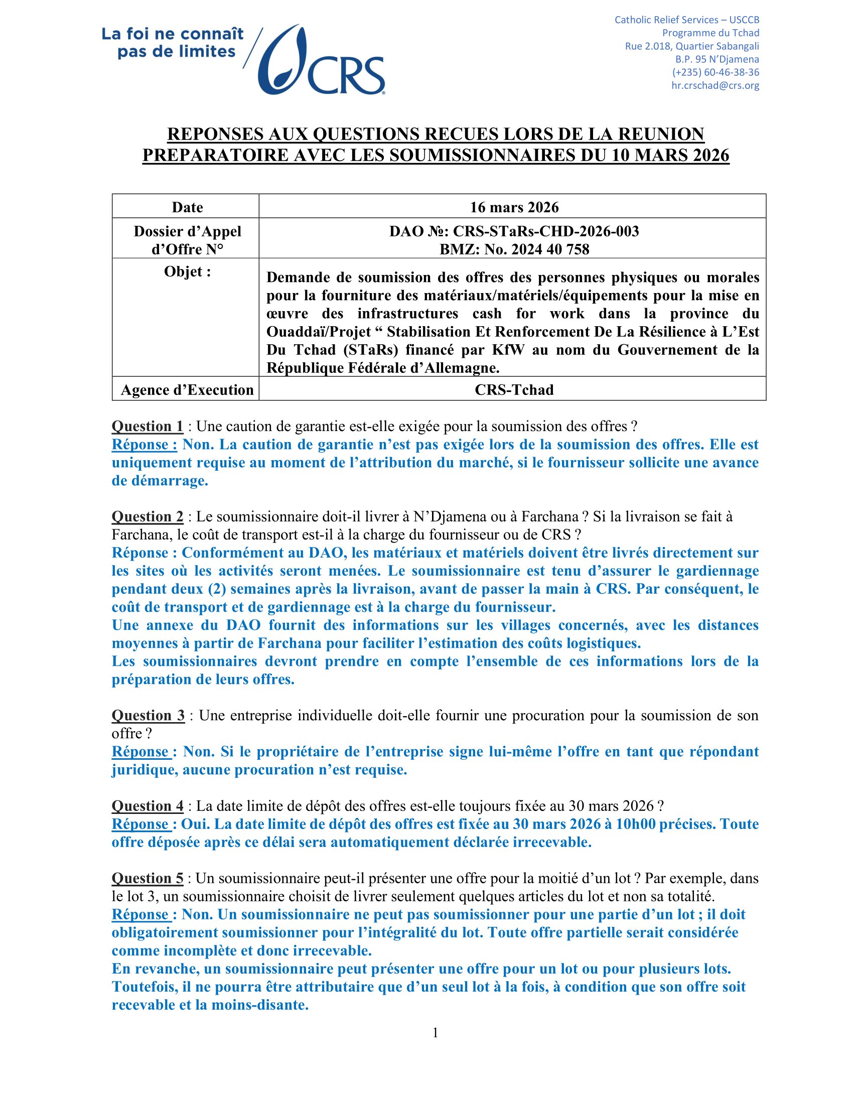 Accueil » Opportunités » Afrique » Tchad » Réponses aux Questions des Soumissionnaires de l’appel d’offres de Catholic Relief Services pour la fourniture des matériaux/matériels/équipements pour la mise en œuvre des infrastructures cash for work dans la province du Ouaddaï, Tchad