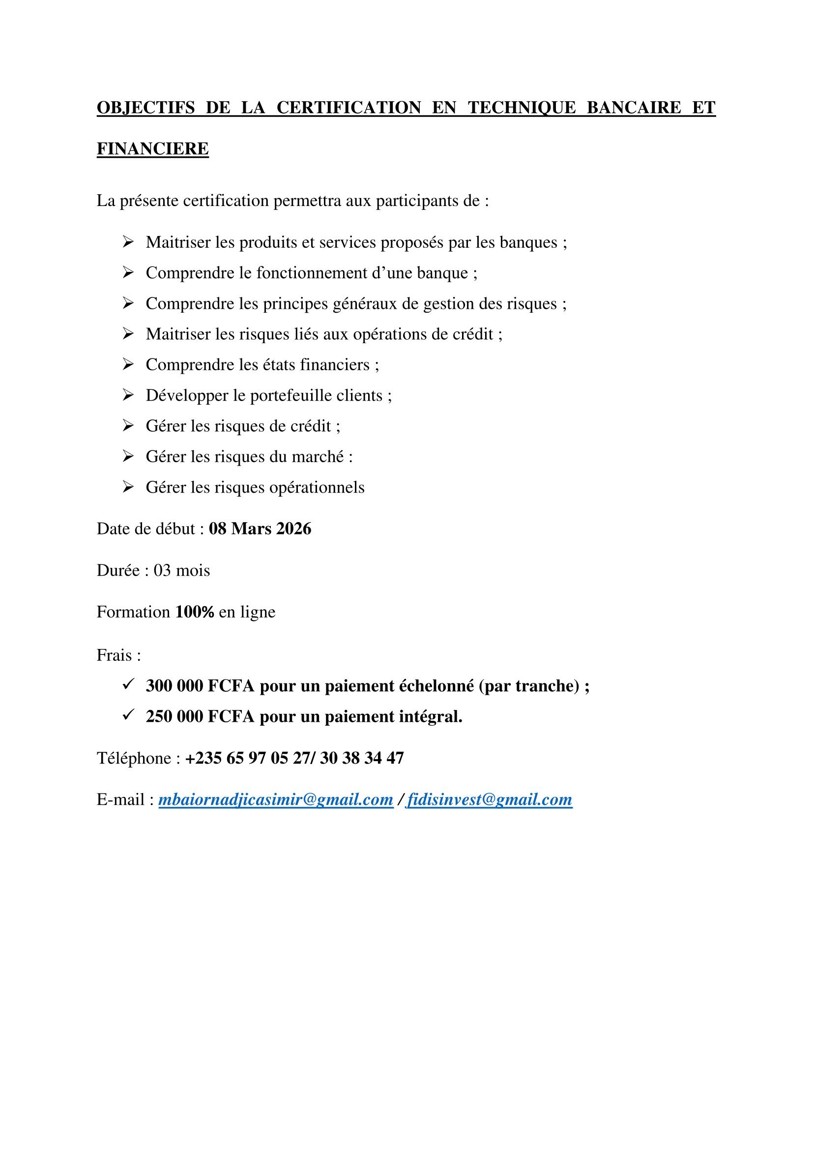 Participez à la formation certifiante en Technique Bancaire et Financière organisée par CEFOREP SARL, Fidis Invest et KSBC