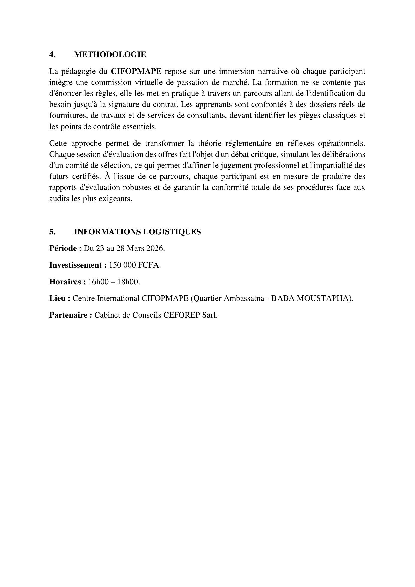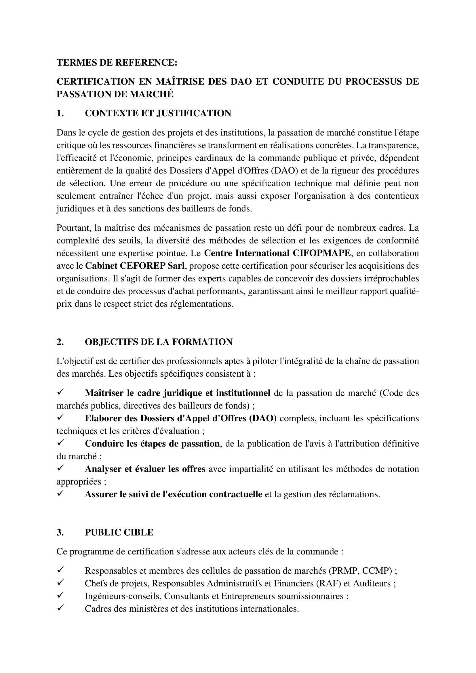 Accueil » Opportunités » Afrique » Tchad » Participez à la formation certifiante en passation de marchés et maîtrise des DAO avec CIFOPMAPE et CEFOREP Sarl au Tchad