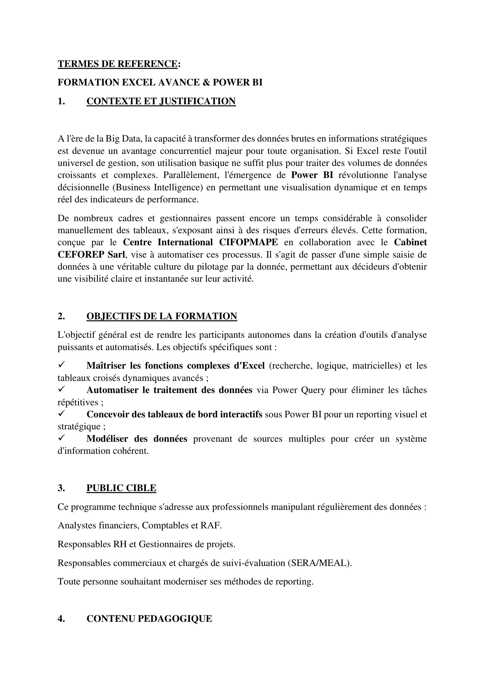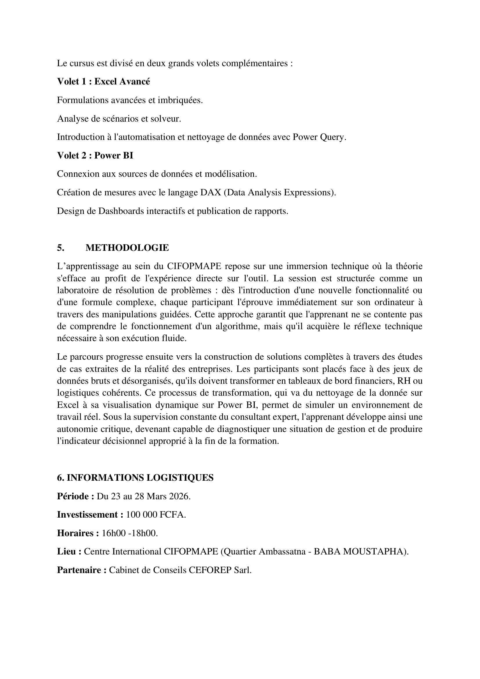 Renforcez vos compétences en Excel avancé et Power BI à l’aide de la Formation certifiante organisée par le Centre CIFOPMAPE et le Cabinet CEFOREP Sarl