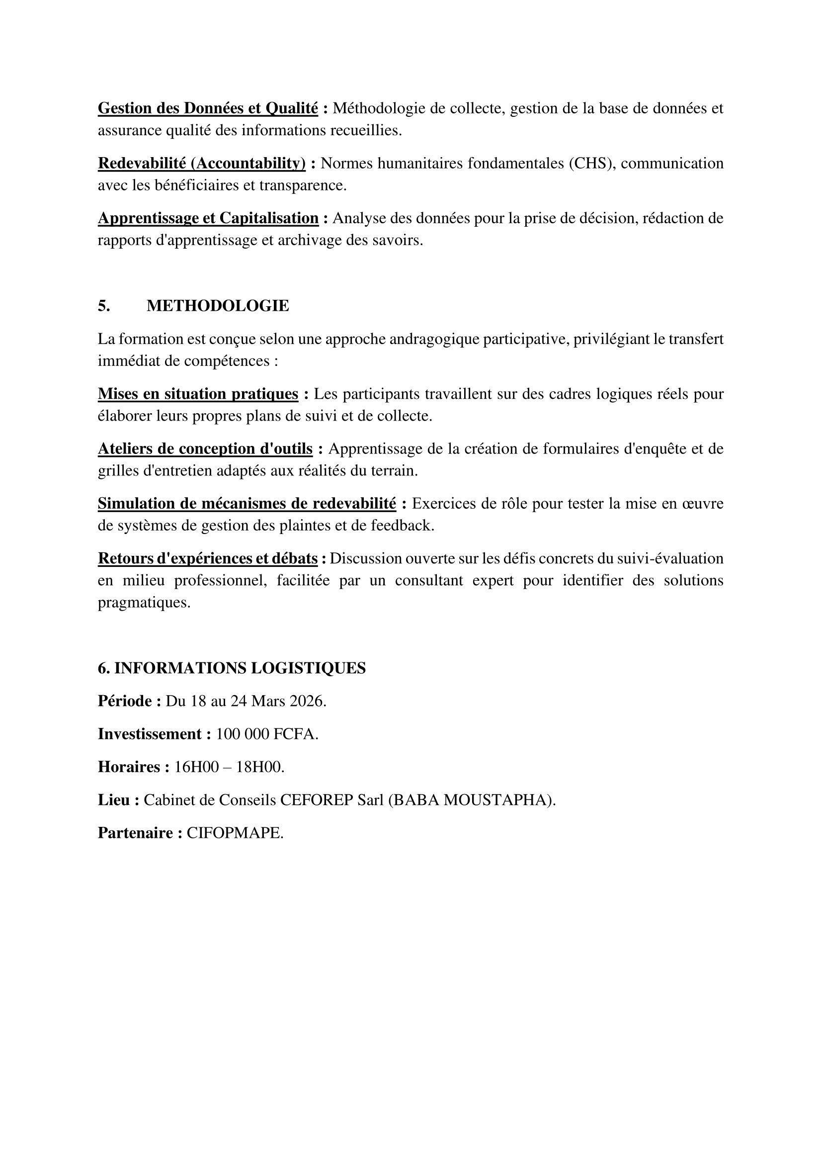 Accueil » Opportunités » Afrique » Tchad » Le Cabinet CEFOREP Sarl & CIFOPMAPE basés à N’Djamena organisent une Formation certifiante en Suivi, Évaluation, Redevabilité et Apprentissage (SERA)