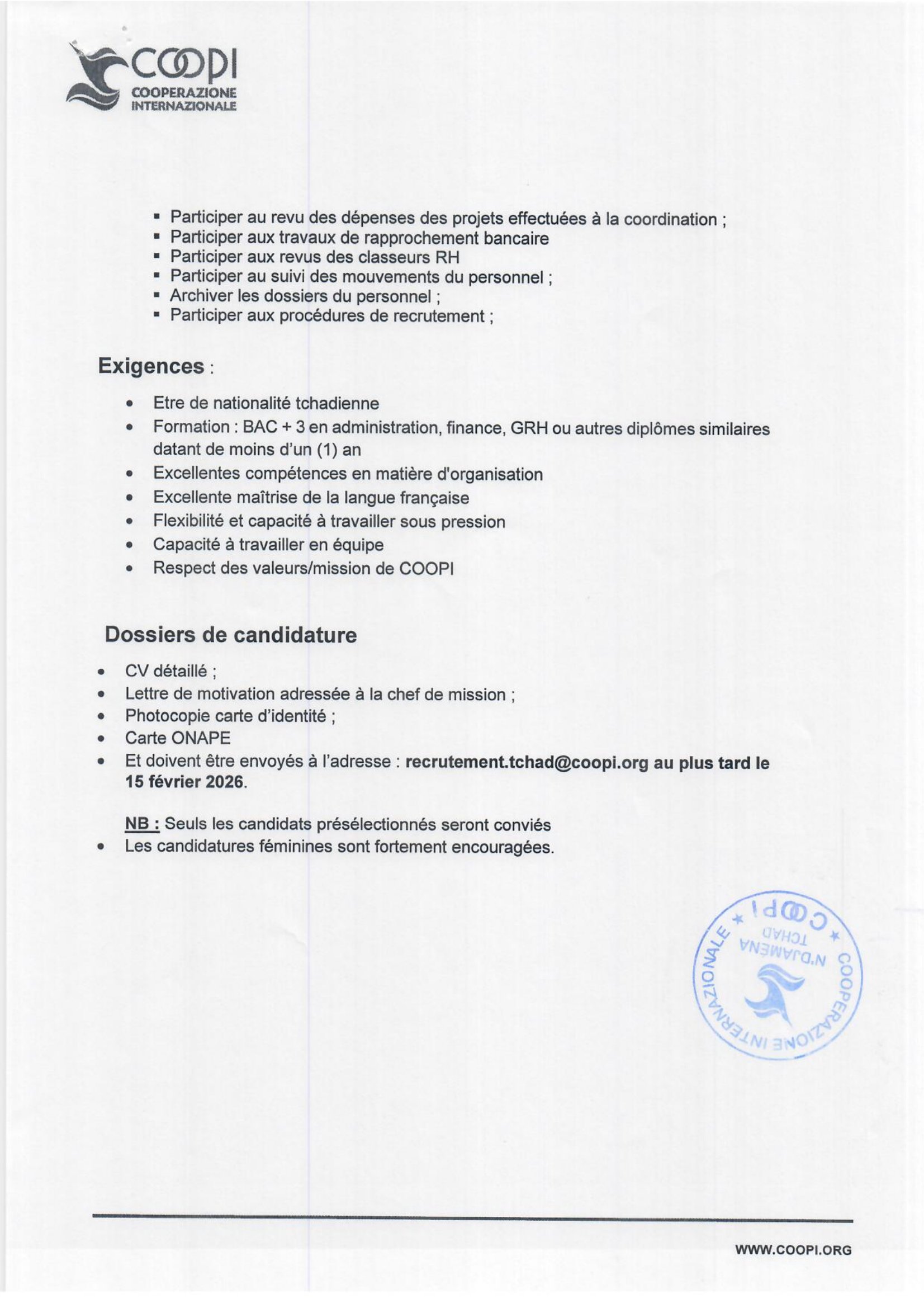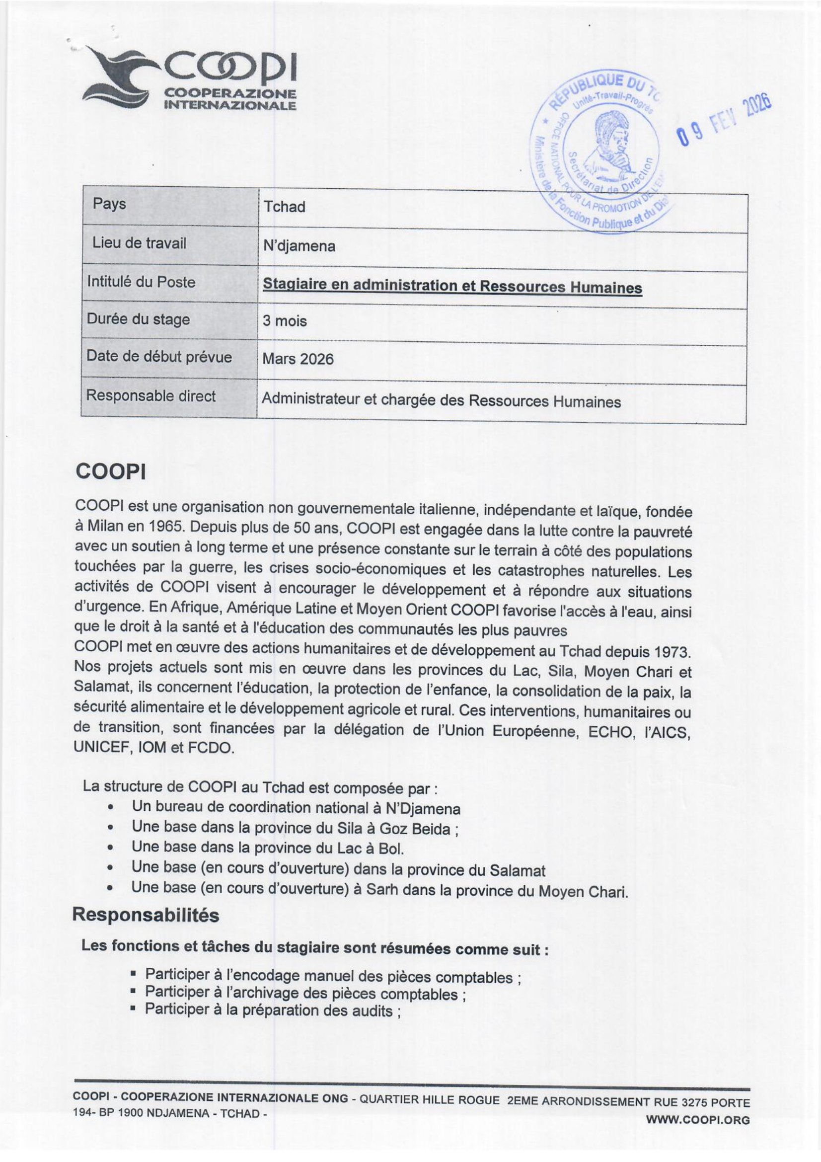 COOPI recherche un(e) Stagiaire en administration et Ressources Humaines basé(e) à N’Djamena, Tchad